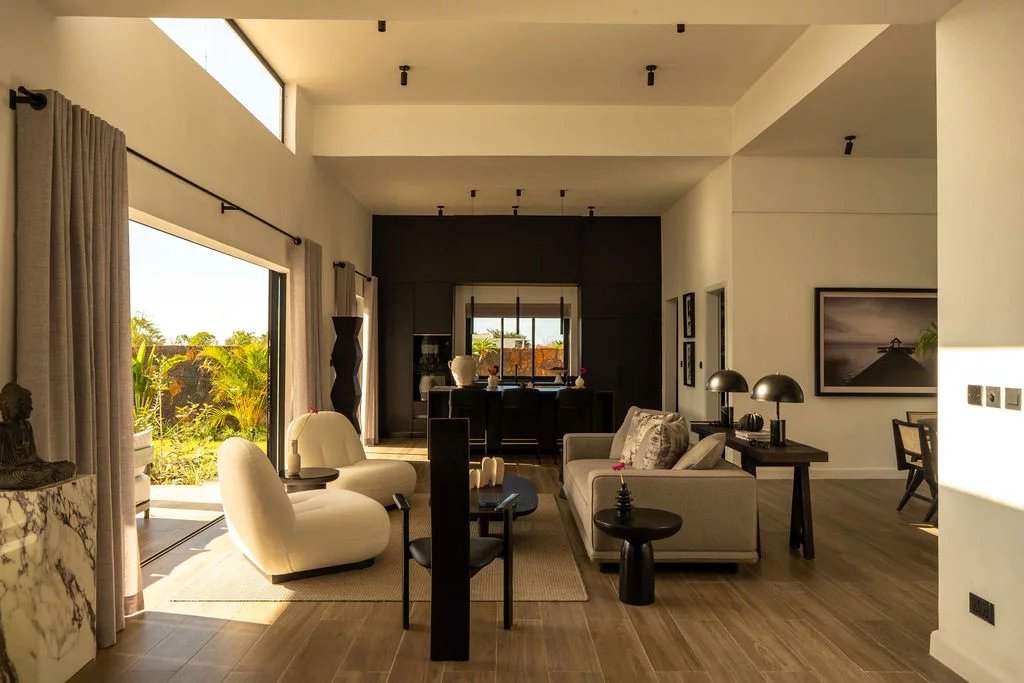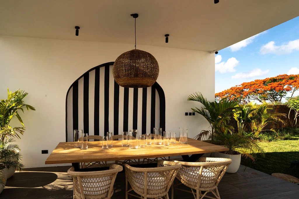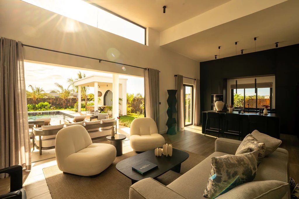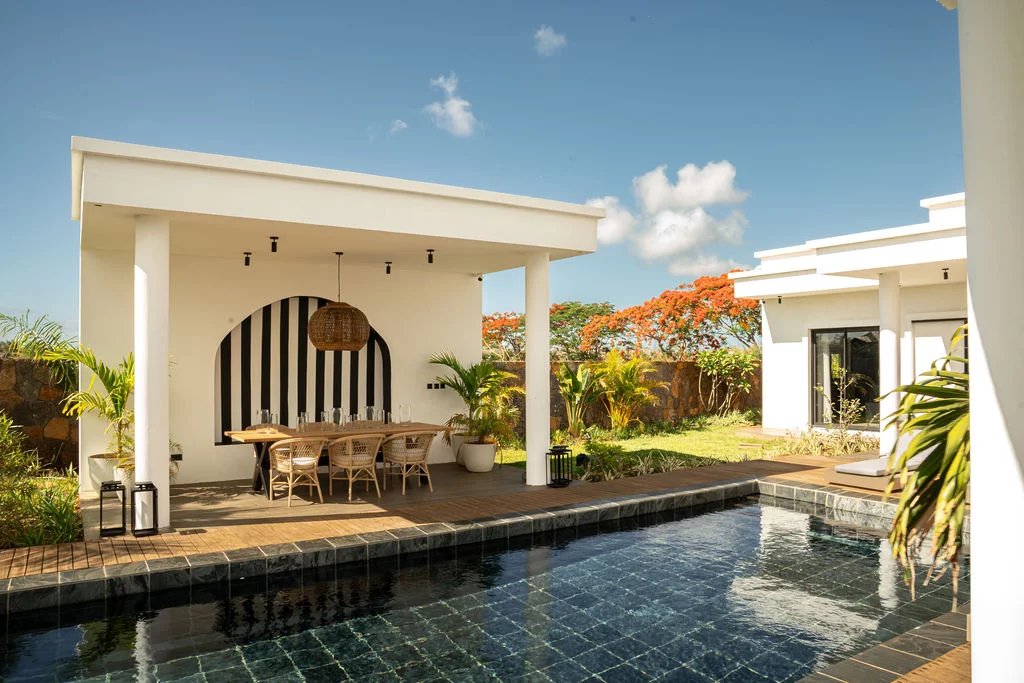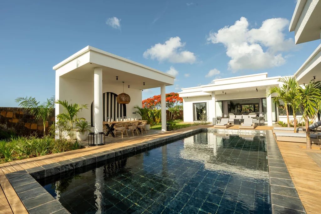 Located within the prestigious Royal Park gated estate, this brand-new architect-designed villa, completed in 2025, stands out for its contemporary design, generous proportions, and high-end finishes. Fully furnished and equipped, it has been decorated by luxury interior designers with carefully selected Italian furniture. Offering approximately 400 square meters of living space on a beautifully landscaped 1,100 square meter plot, the villa features four en-suite bedrooms (or three bedrooms plus a convertible office), including an impressive master suite with a bathtub, double vanity, and a spacious walk-in closet. The bright living areas include two lounges, two dining rooms, and two kitchens, with a modern open-plan kitchen complemented by a back kitchen, laundry room, and patio. Outdoors, the garden features a 10-meter by 4-meter stone swimming pool, a kiosk, and an elegant terrace, creating the perfect setting for entertaining. Pool and garden maintenance are included. Available for long-term rental at Rs 250,000 per month, this exceptional property offers a rare opportunity to enjoy luxury living in Mauritius.
