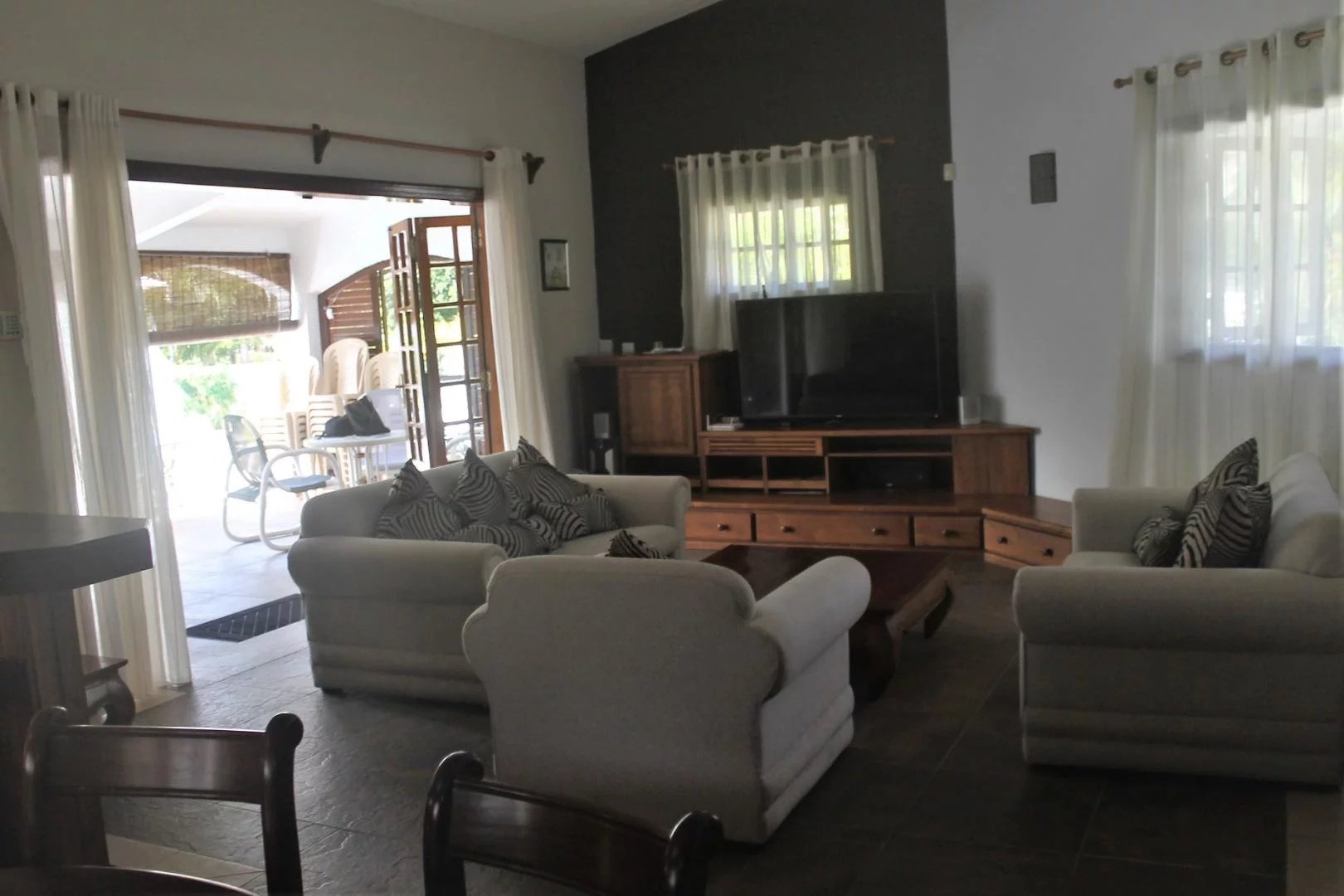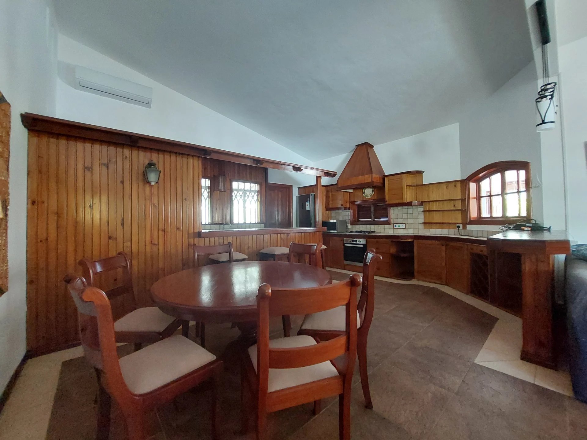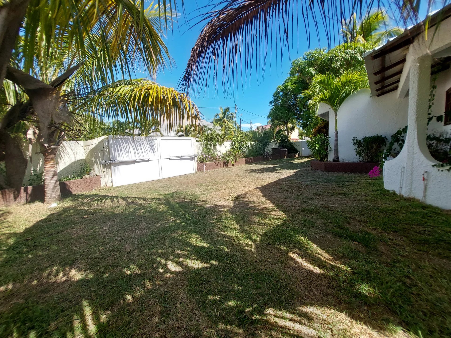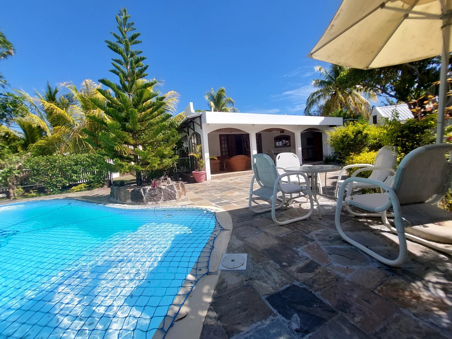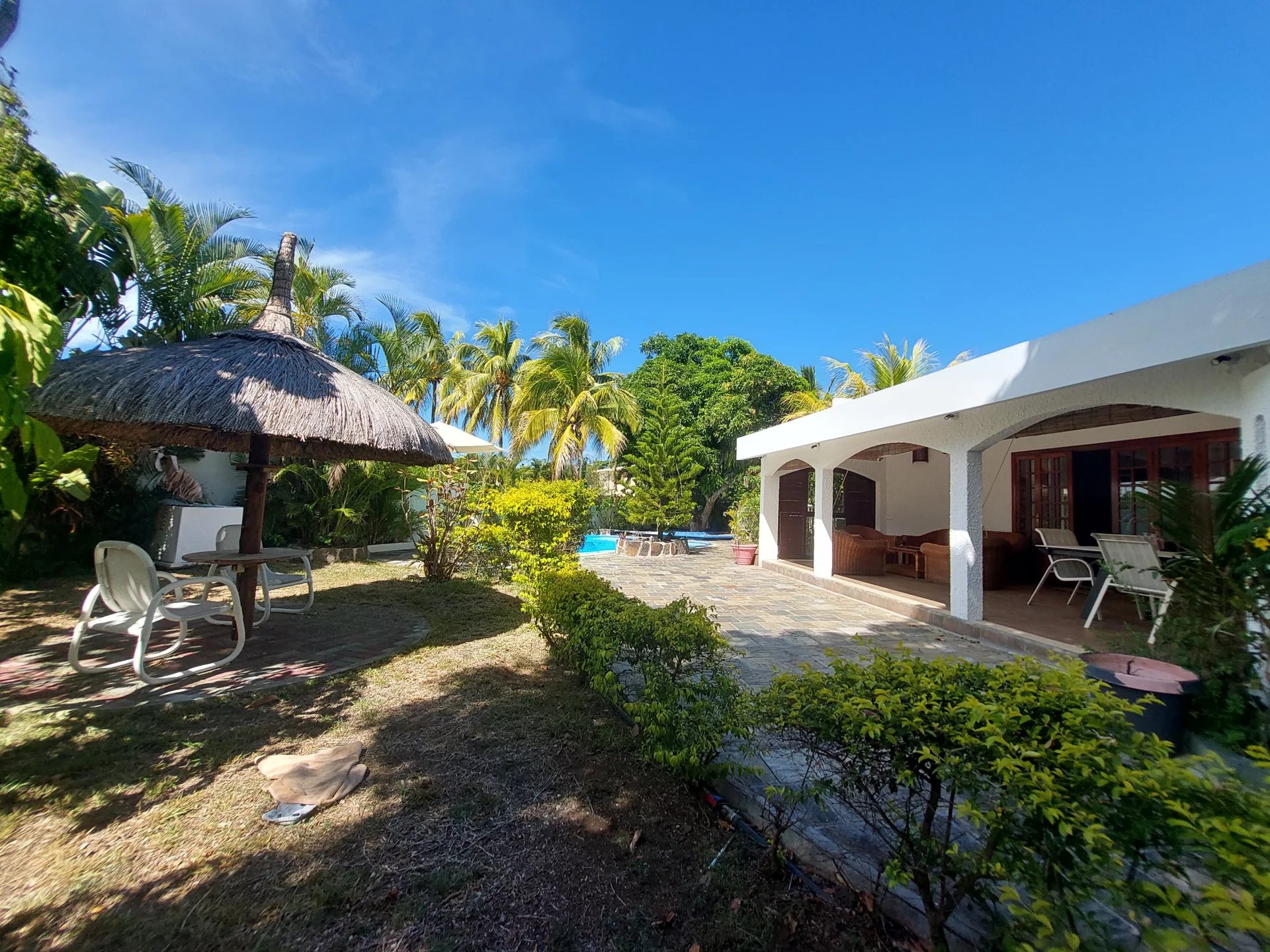 The living area opens onto a large terrace, offering a stunning view of a beautiful, fenced garden and a private pool. The garden is securely enclosed with an automatic gate, ensuring both comfort and peace of mind.