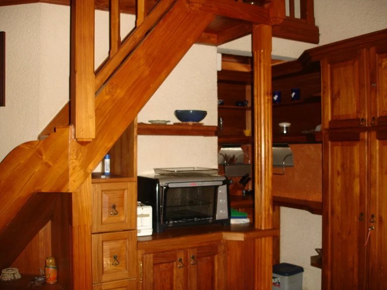 Outside, a one-bedroom studio with kitchenette, bathroom and dressing room. Small fenced garden with trees. Pool and garden maintenance included in the monthly payment.