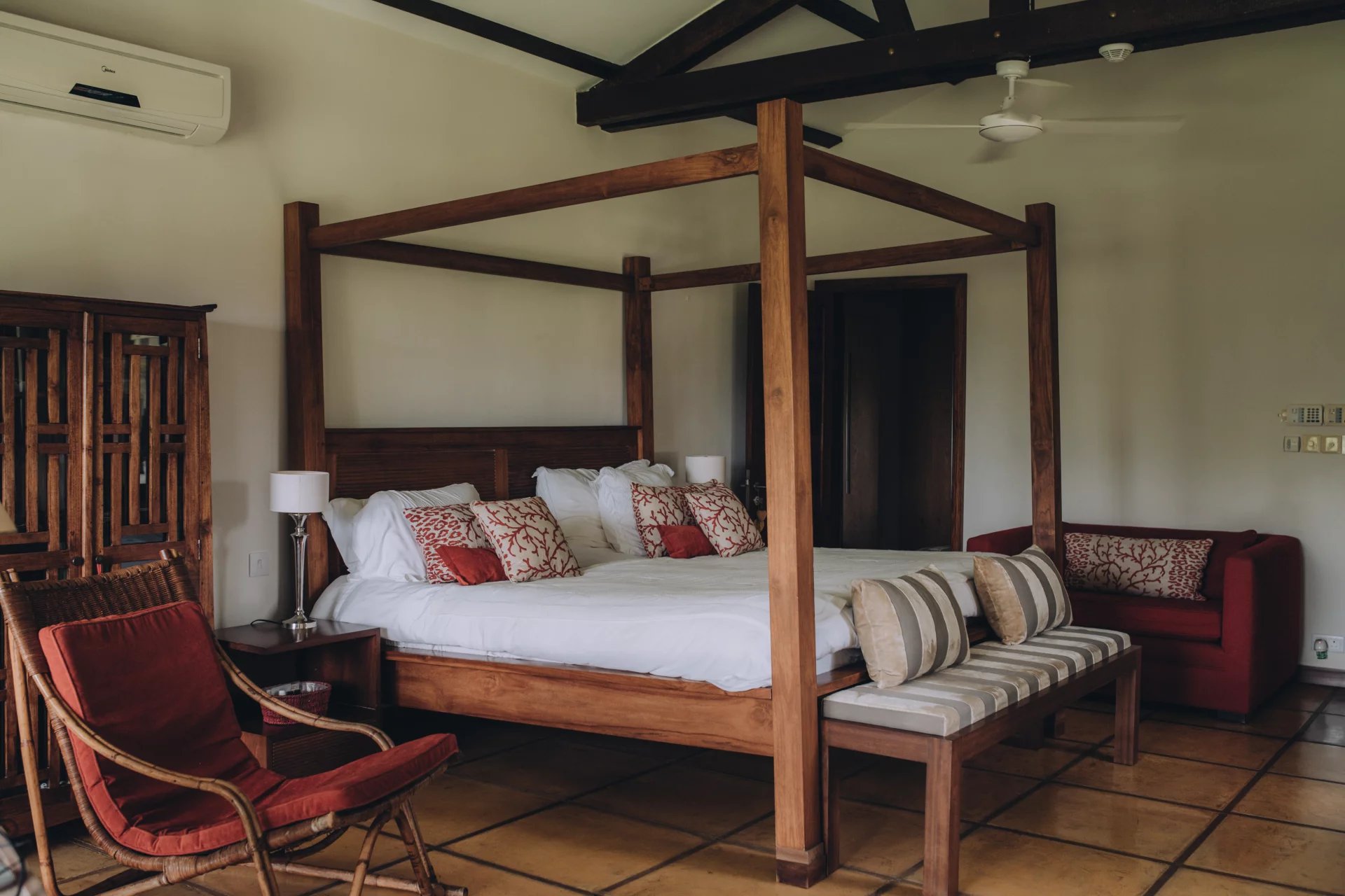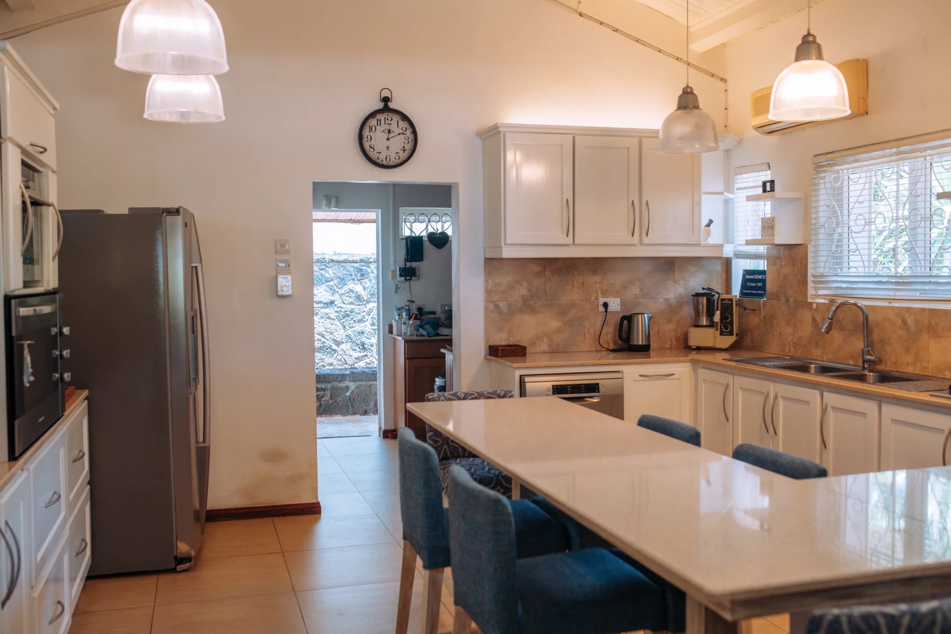 The main house has two fully air-conditioned bedrooms, each with an en-suite bathroom. The master bedroom includes a dressing room and office space, facing the garden and the sea. A few steps down is the third bedroom, also fully air-conditioned, with an en-suite bathroom.