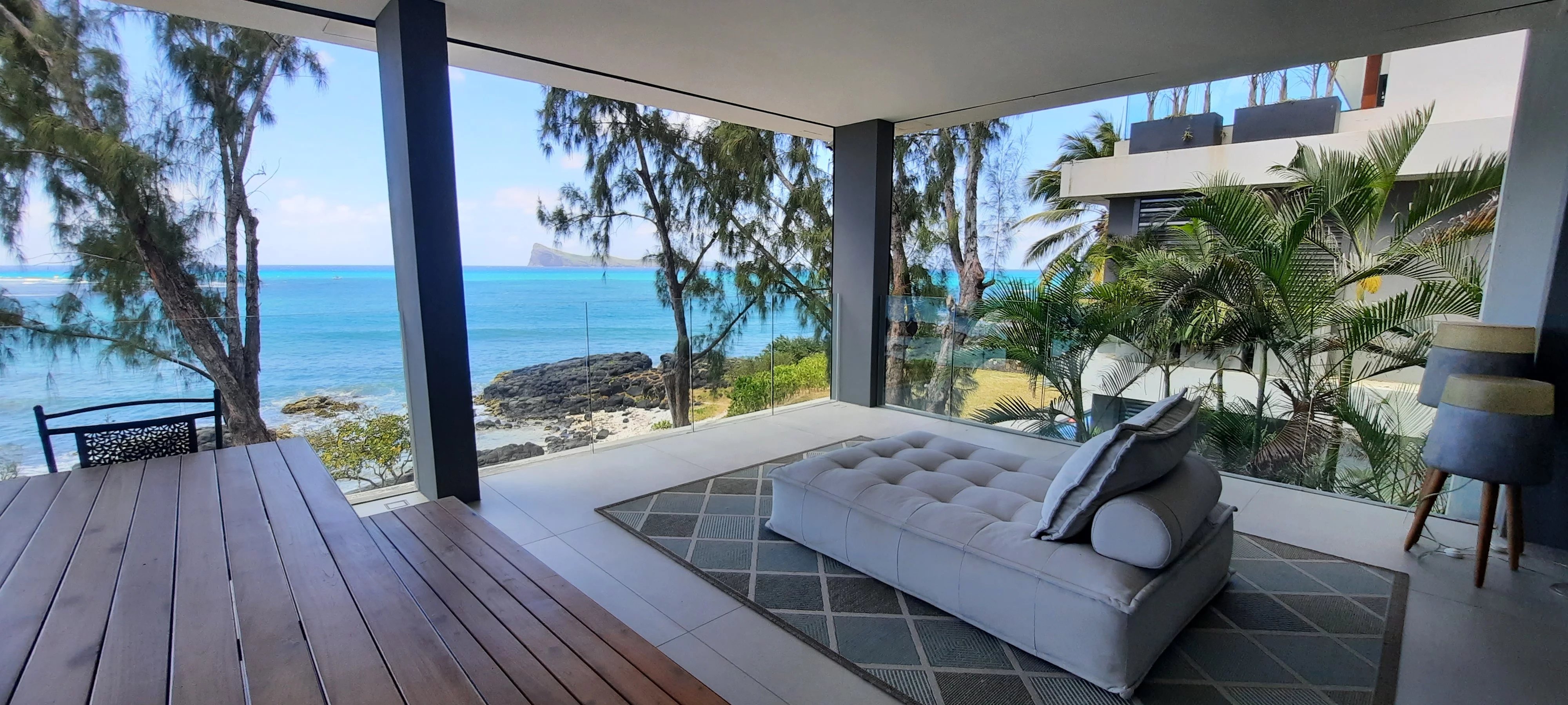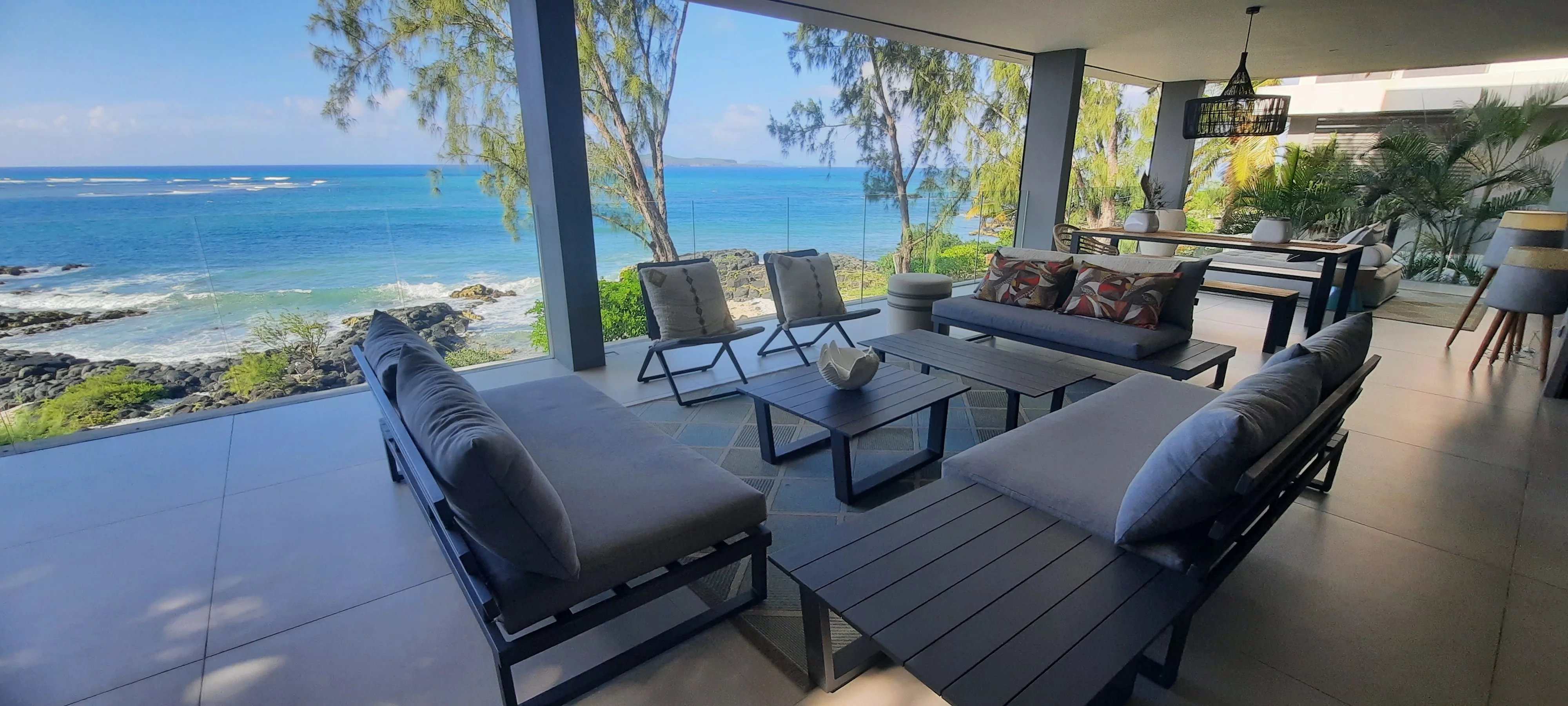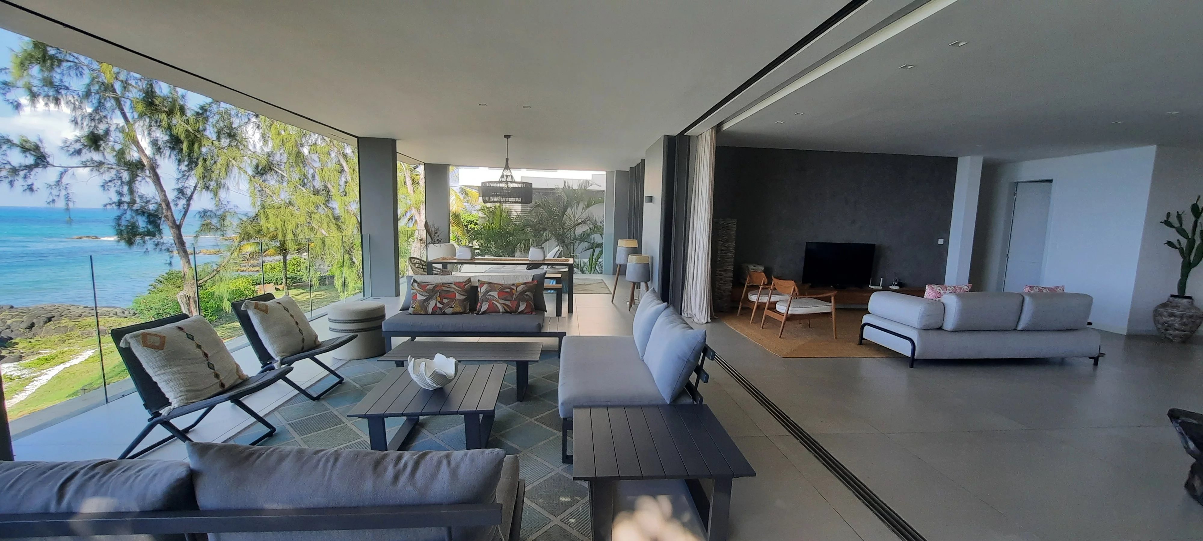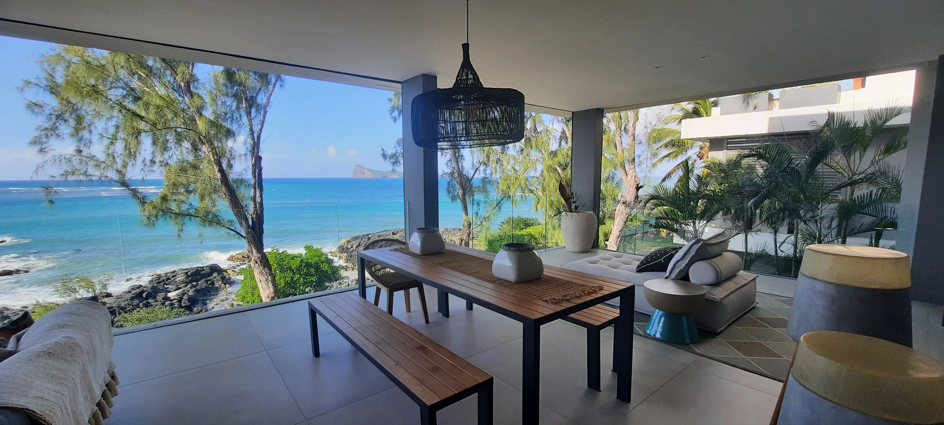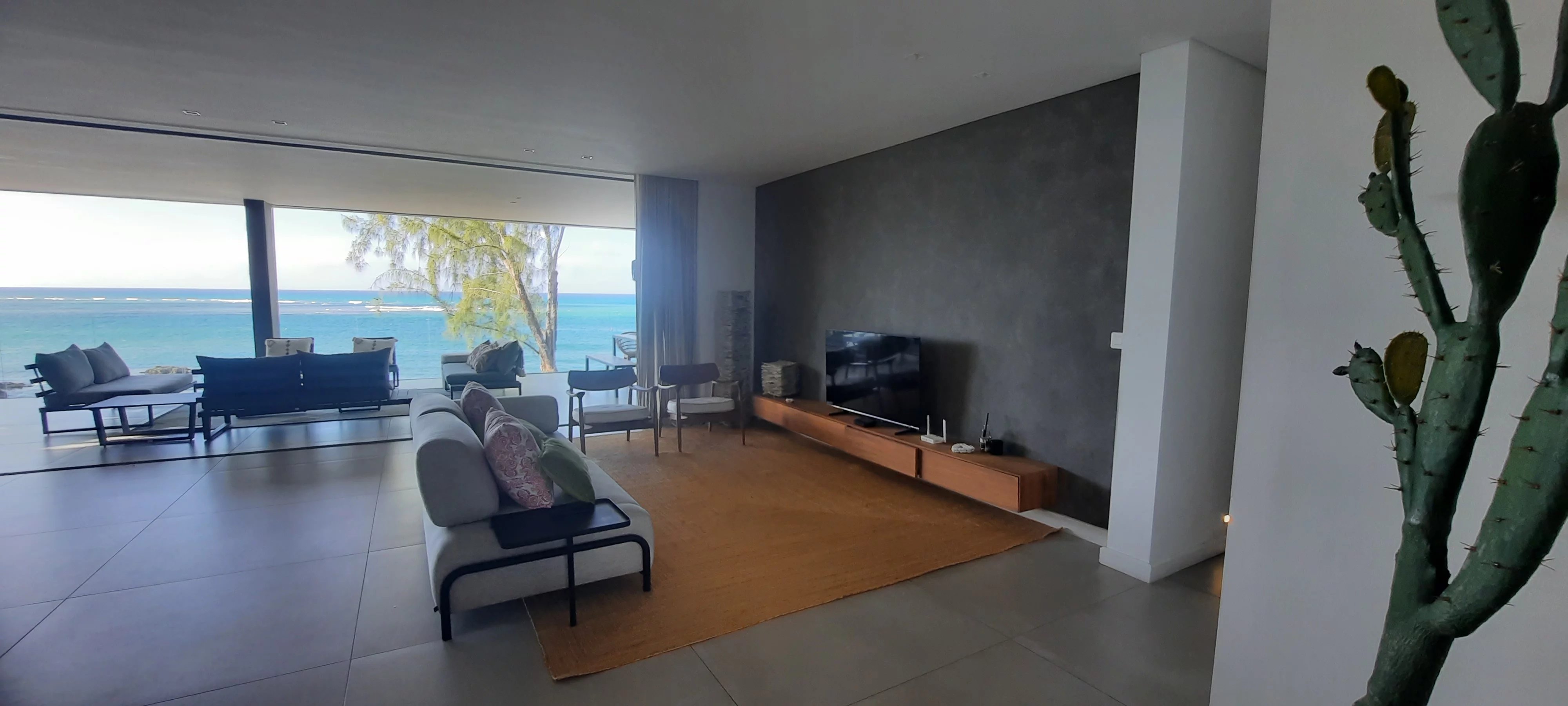 Located on the BEACHFRONT, this amazing 290m² apartment overlooks the ocean with its breathtaking view of the islands to the north. Situated in a very private, quiet, and secure block of 3 apartments in the upscale area of Cap Malheureux. On the 1st floor, the apartment is tastefully furnished and very luminous, offering a spacious living area that includes an entrance hall, a living and dining room, an open-plan kitchen, a back kitchen/laundry room, and a guest toilet. The main attraction of this property is the magnificent terrace with a breathtaking view that serves as a second living area, complete with a living and dining table and a private splash pool. The 3 bedrooms, each with en-suite bathrooms and dressing areas, are fully air-conditioned. The master bedroom opens onto the terrace, facing the view of the sea and the beach below. The apartment also offers a covered garage and storage space.