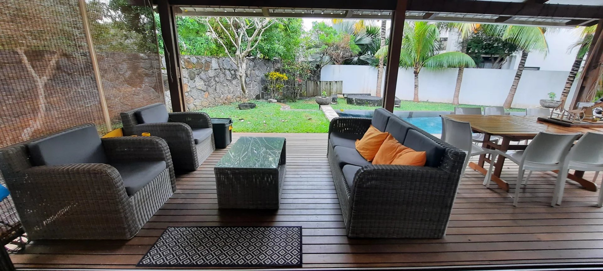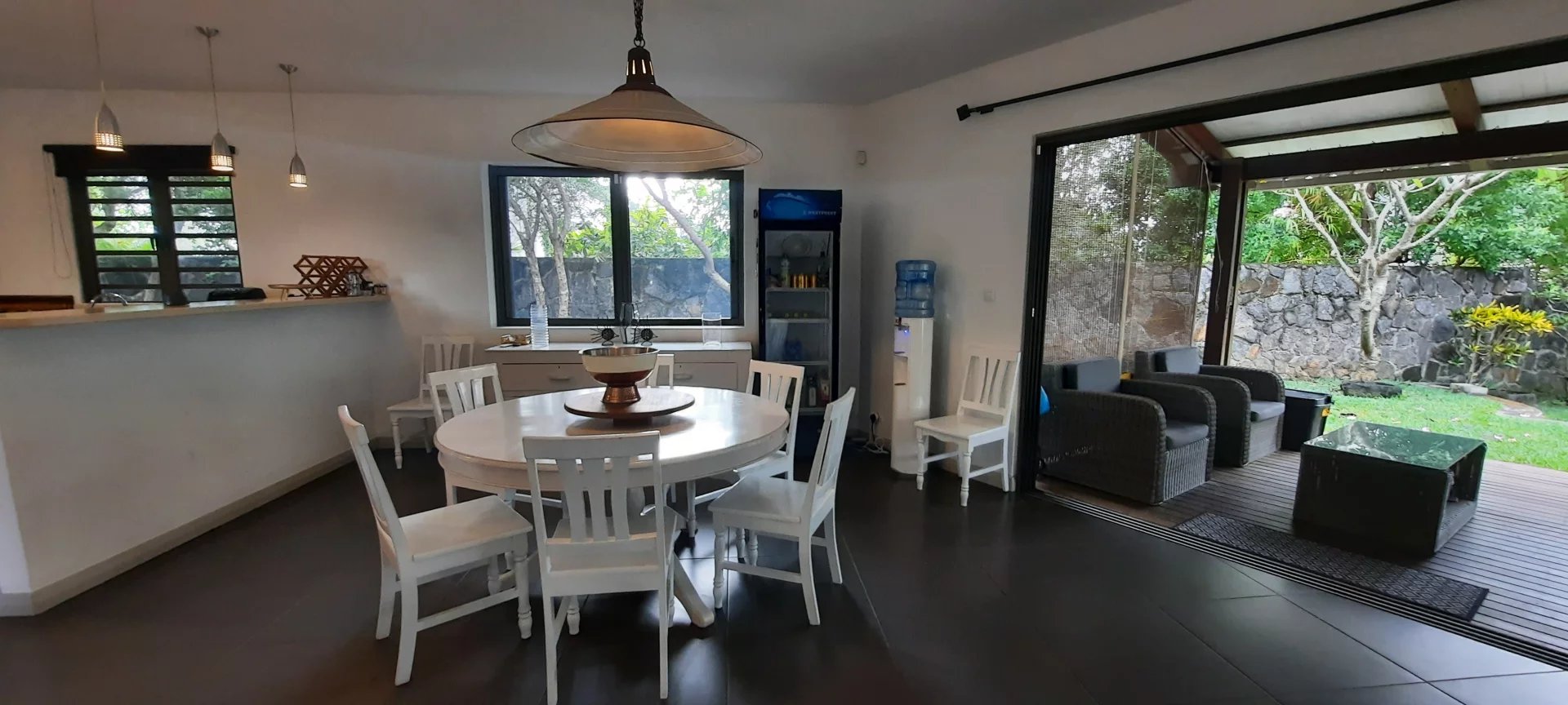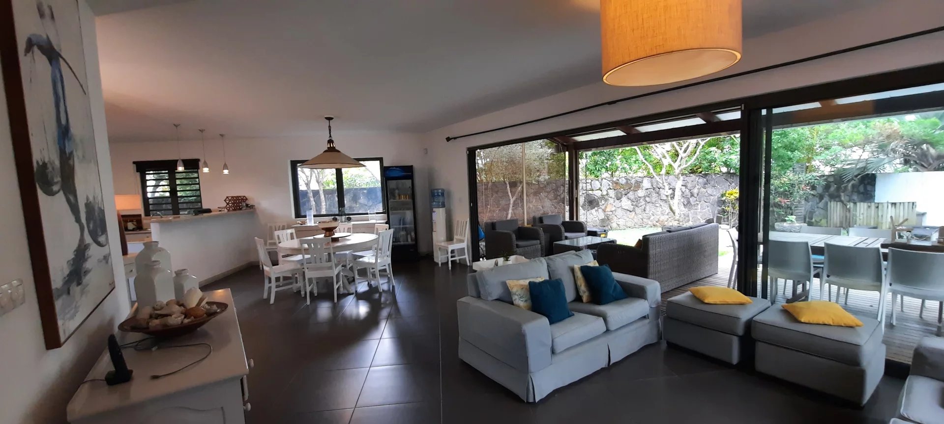 It features a living room, dining area, open kitchen, and laundry room. There is also a TV lounge, guest toilet, and a beautiful terrace facing the pool and garden.