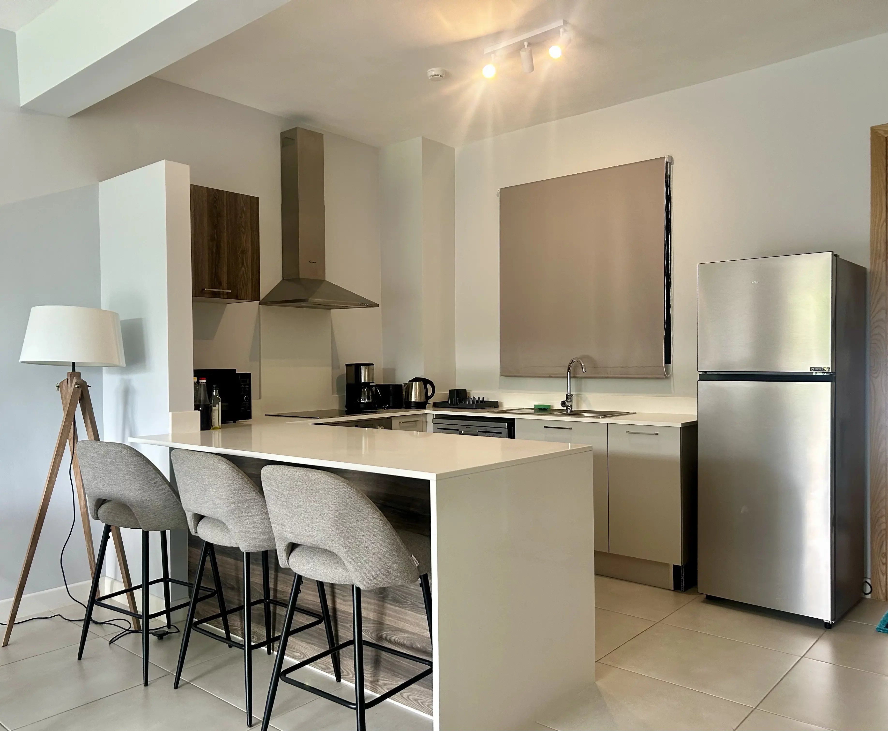 The fully equipped American kitchen integrates seamlessly with the bright and inviting living area.