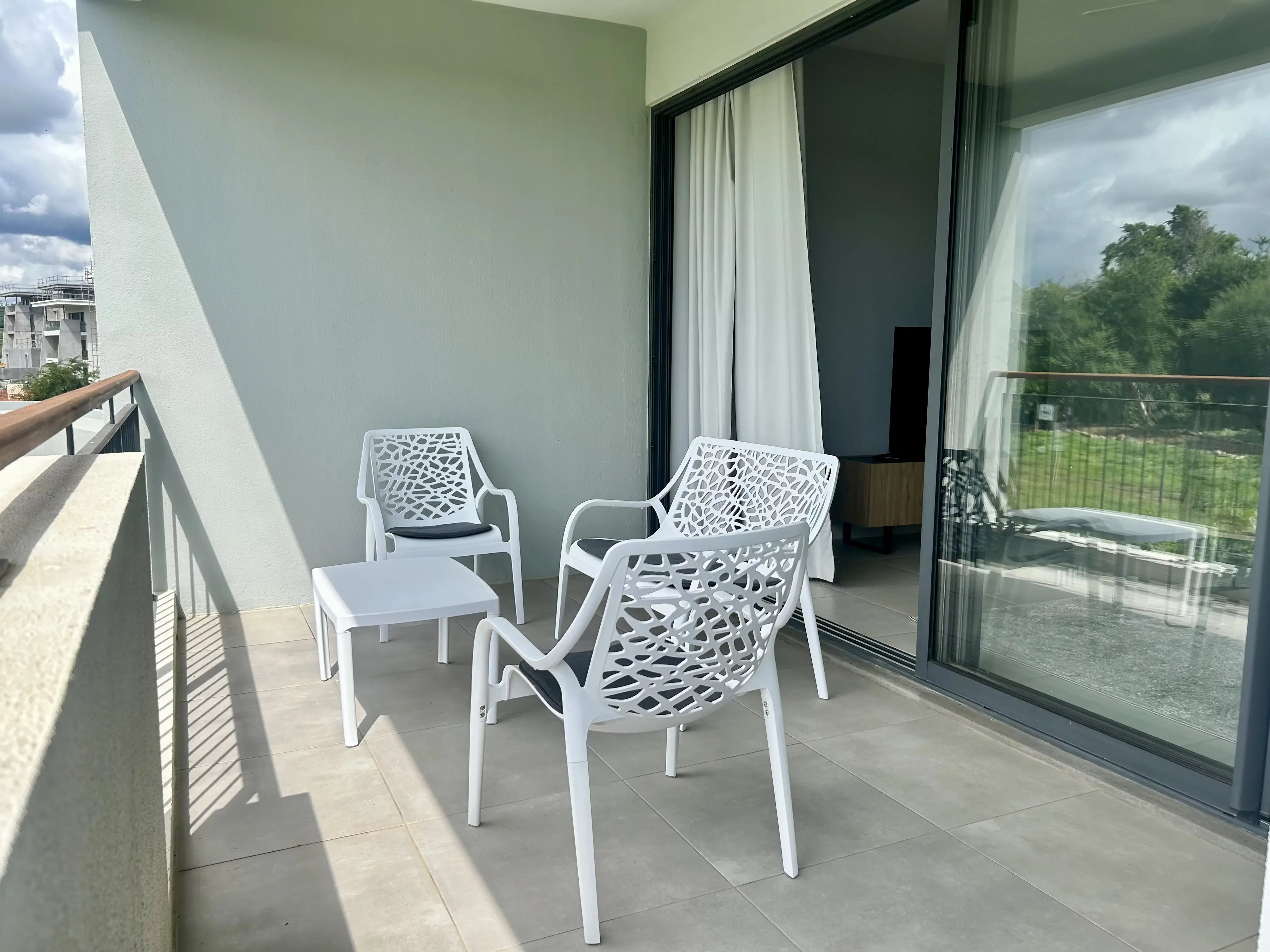 Large sliding glass doors open onto a lovely continuous balcony, allowing abundant natural light to fill the space.