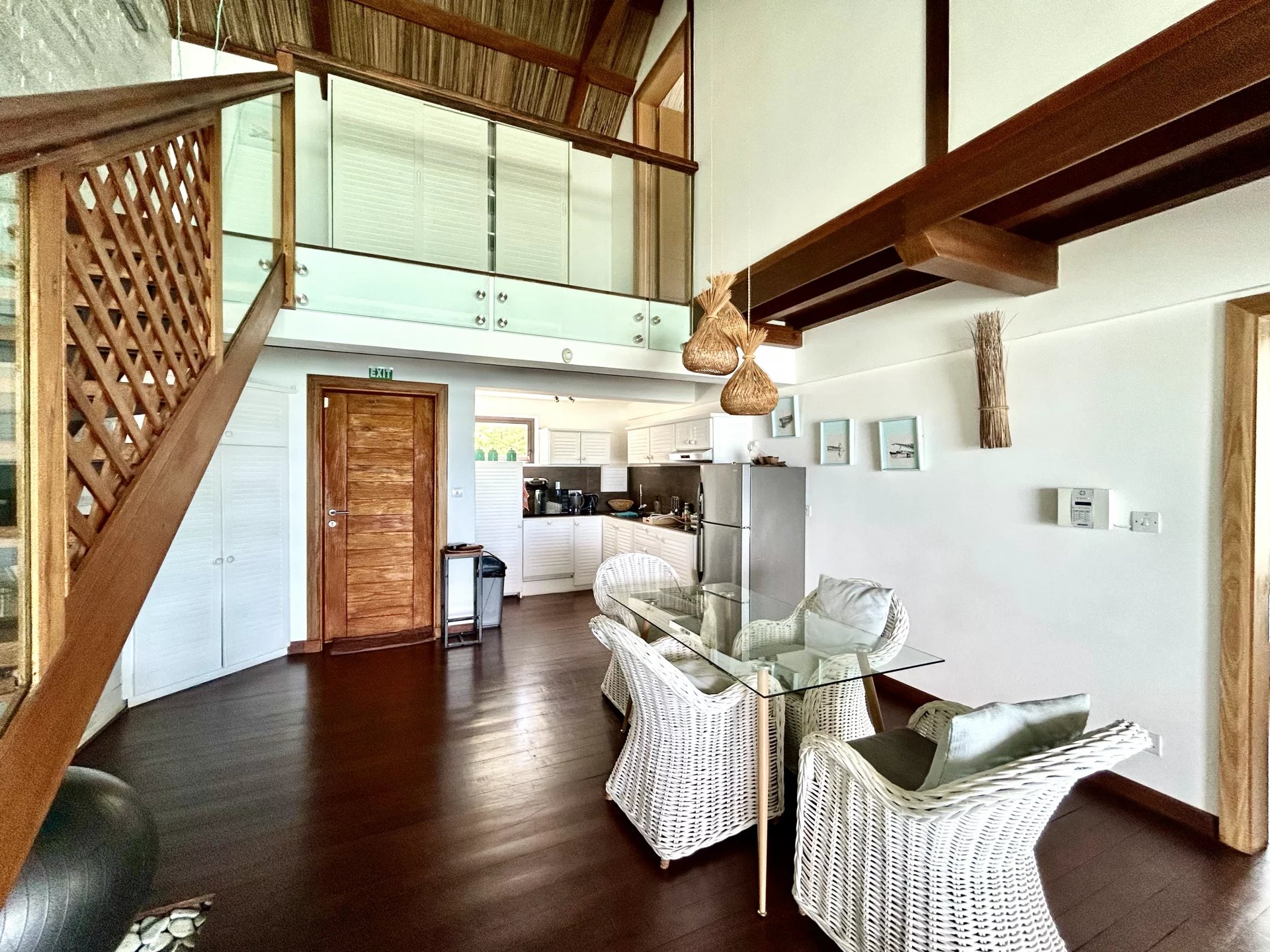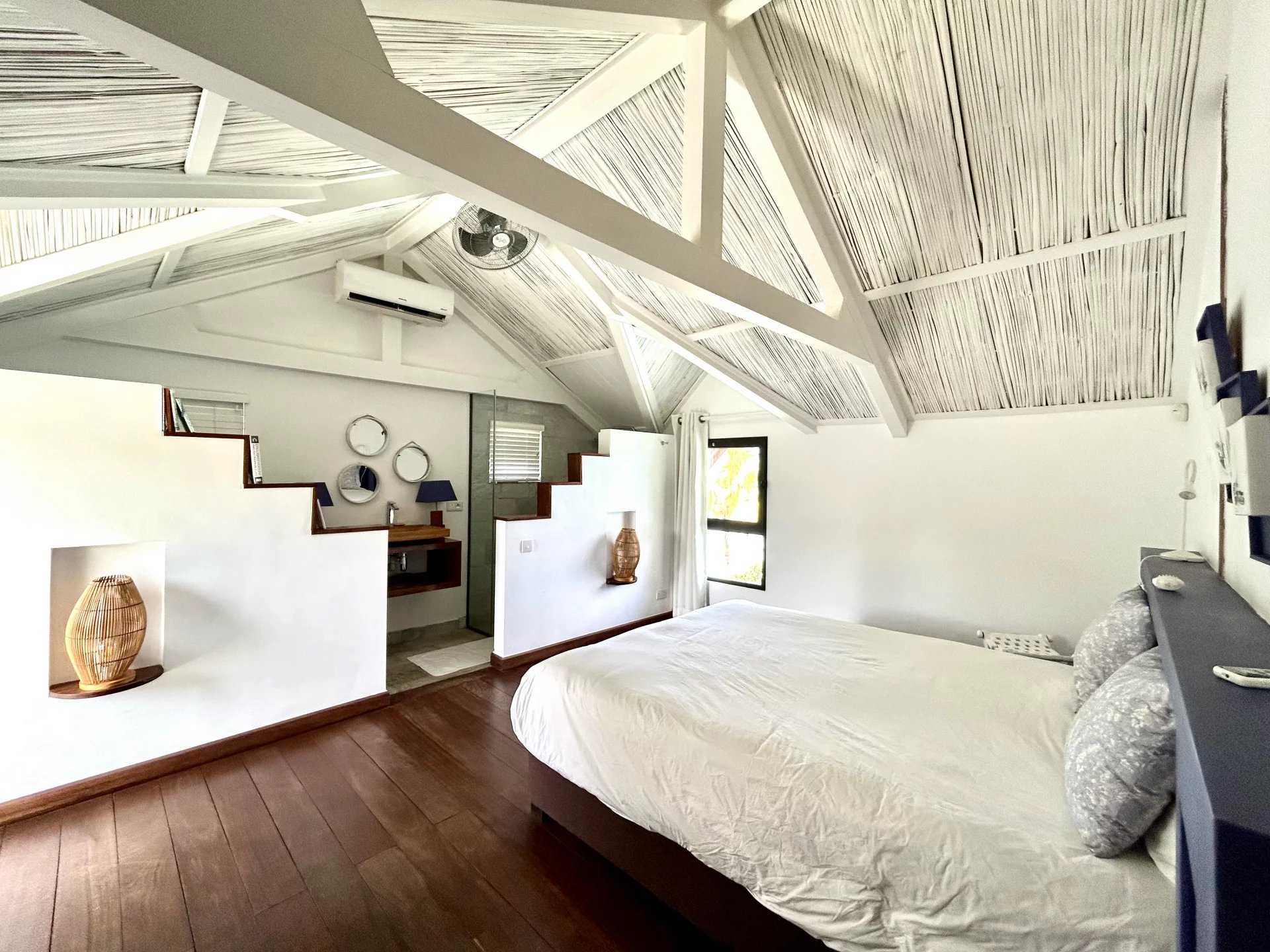 The environment is secure and calm. The apartment is furnished in a modern style and comprises a living room with open kitchen that opens onto a magnificent view of the lagoon and beach just in front of the complex. A first bedroom with en-suite shower room is on the first level of the apartment, and a second bedroom with en-suite shower room is on the mezzanine level above.