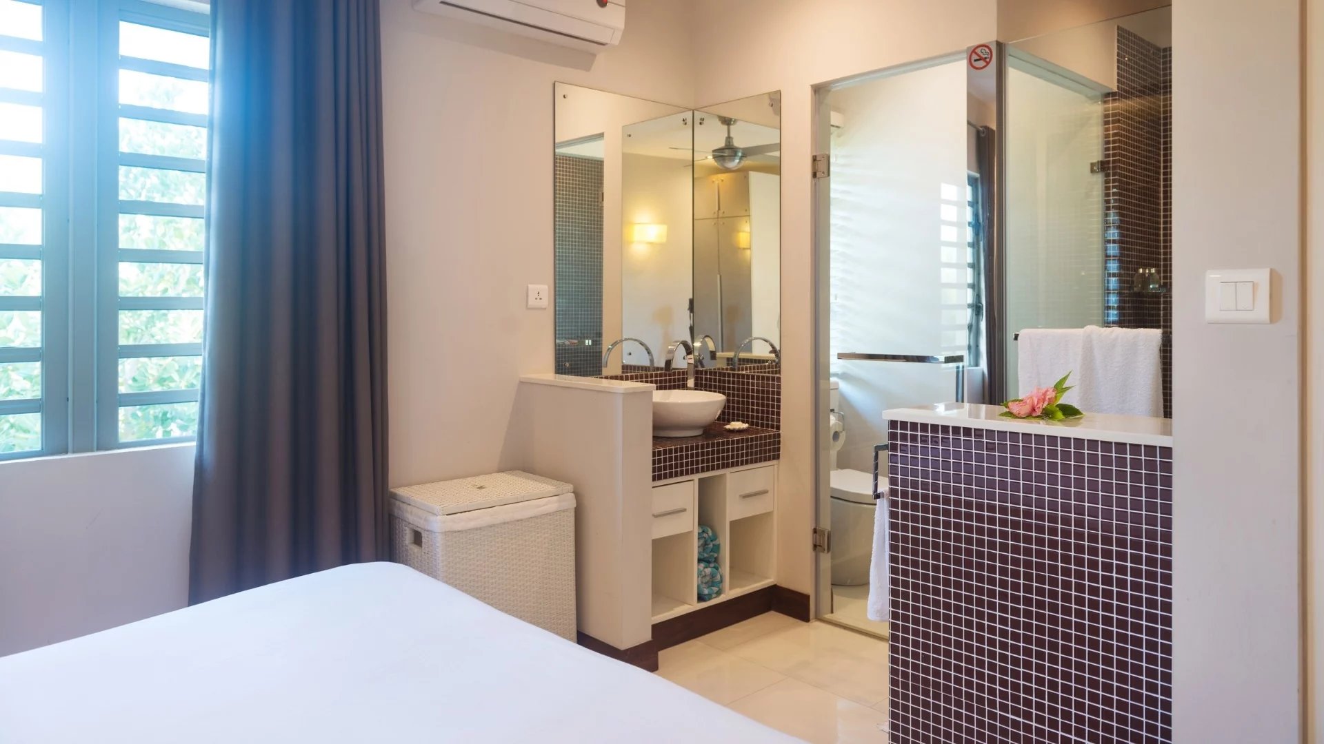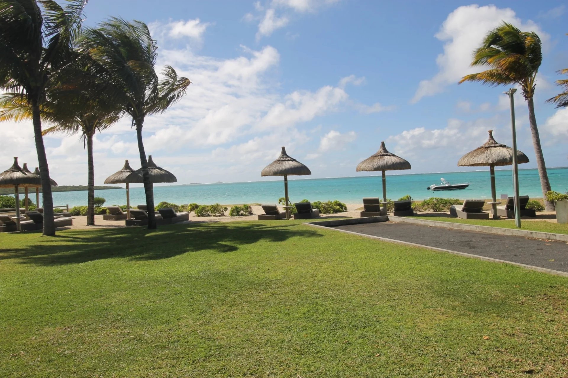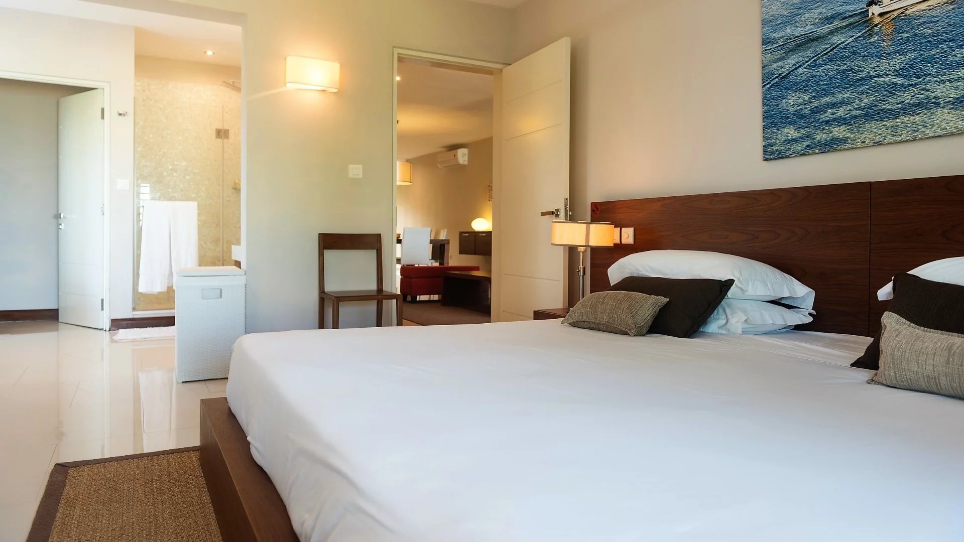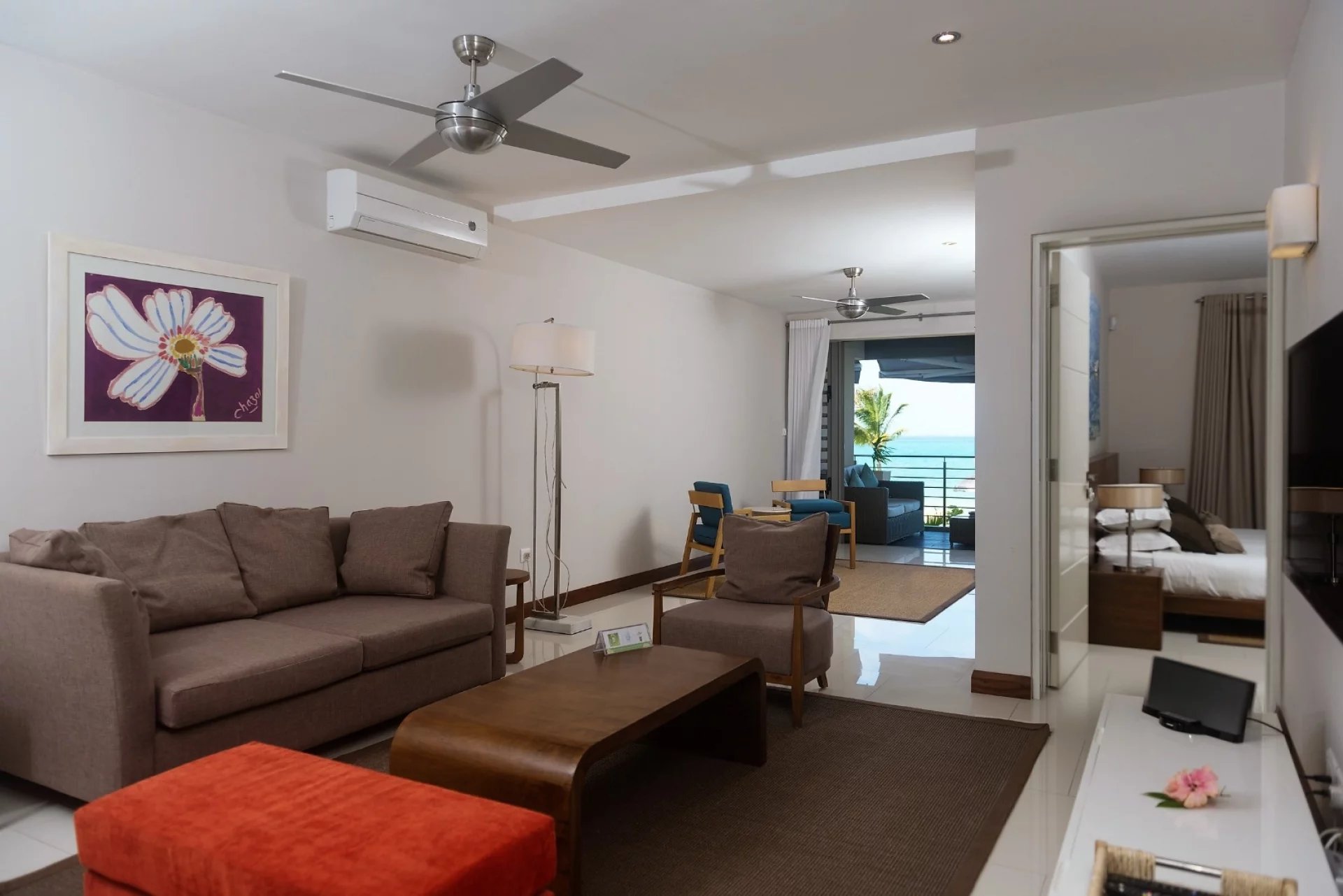 The beautifully decorated apartment is located on the 1st floor. It offers three bedrooms, all en suite and air-conditioned. The bathroom in the master bedroom is equipped with a bathtub. American kitchen, a large air-conditioned living area that opens onto the terrace with a view of the garden and the beach.