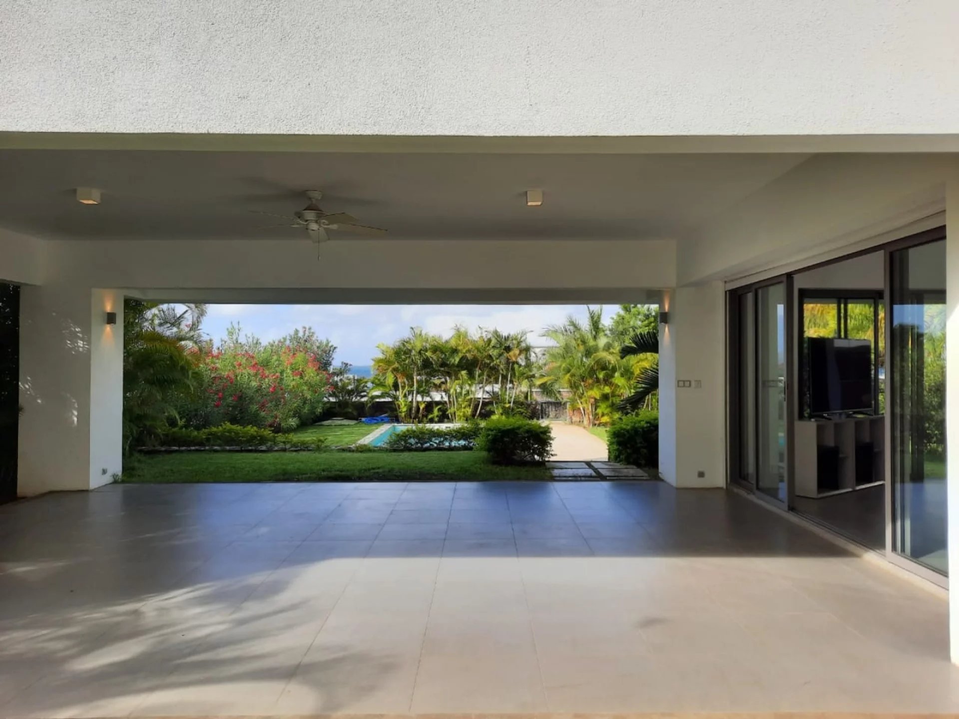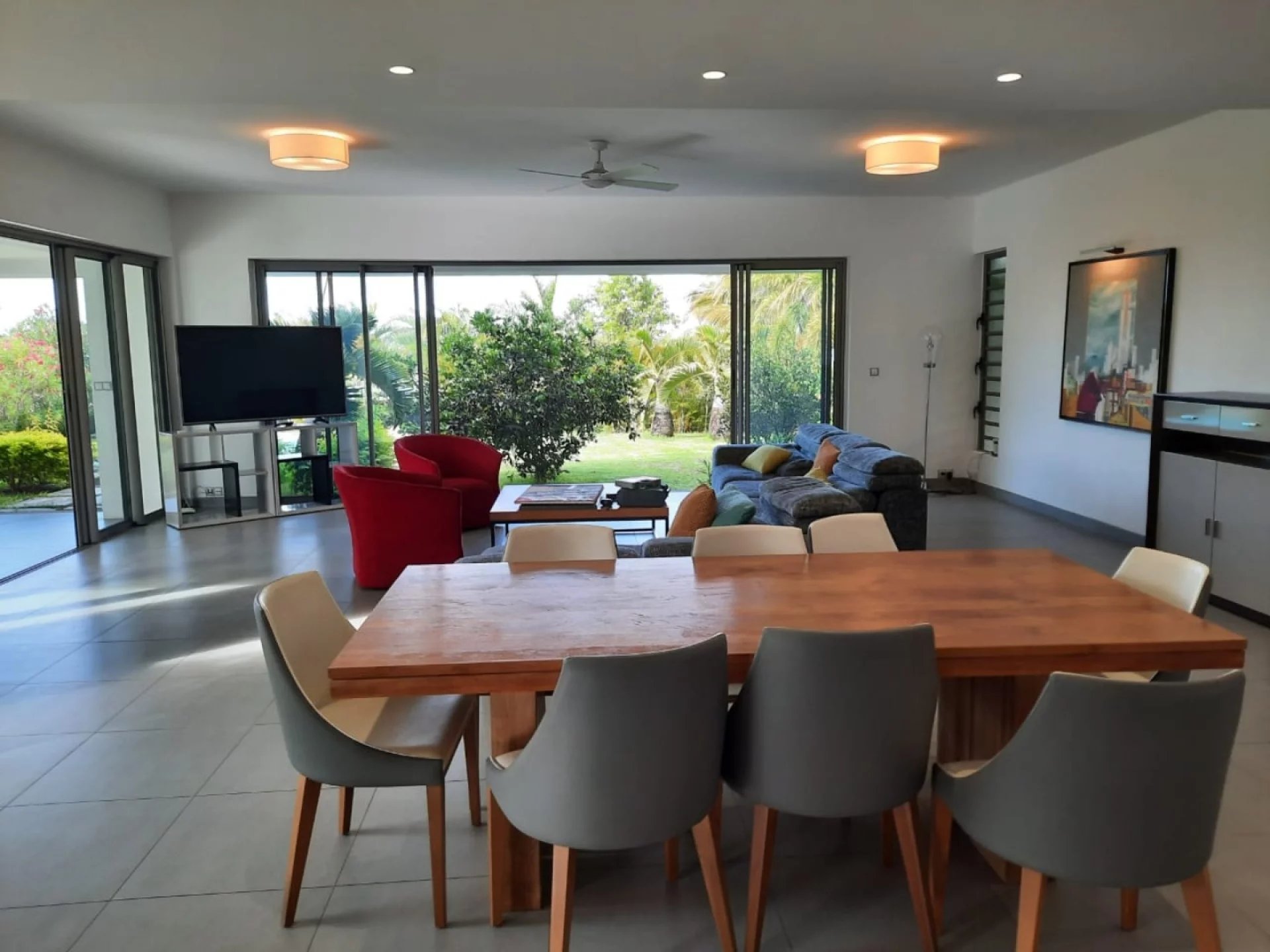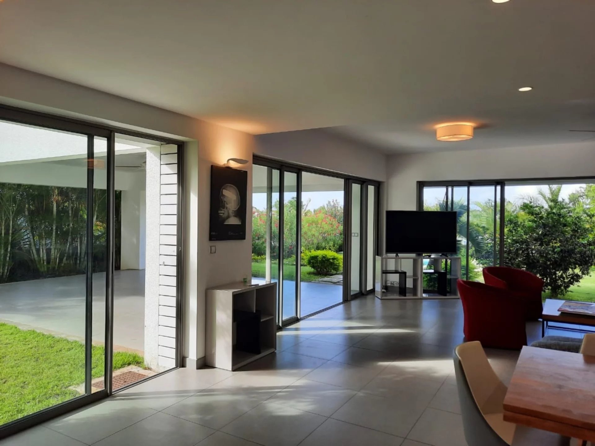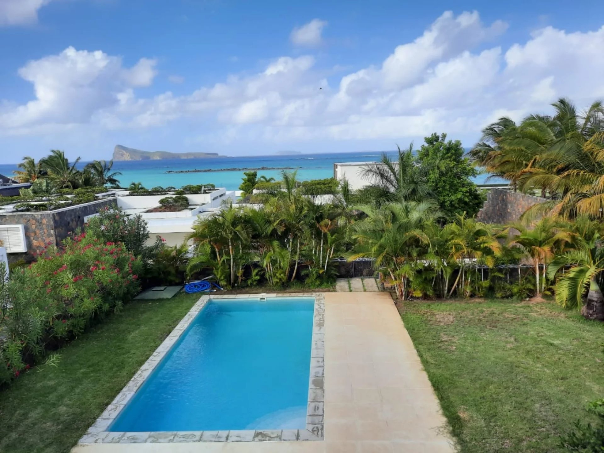 This 4 air-conditioned bedroom villa with a splendid view on the ocean and the Coin de Mire, has large and bright living spaces, a beautiful garden, a large terrace, a swimming pool . It offers a TV lounge, a bedroom that can be transformed into an office, a playroom with an en-suite bathroom and a separate toilet, a kitchen open to the living room, a dining room and a back kitchen.