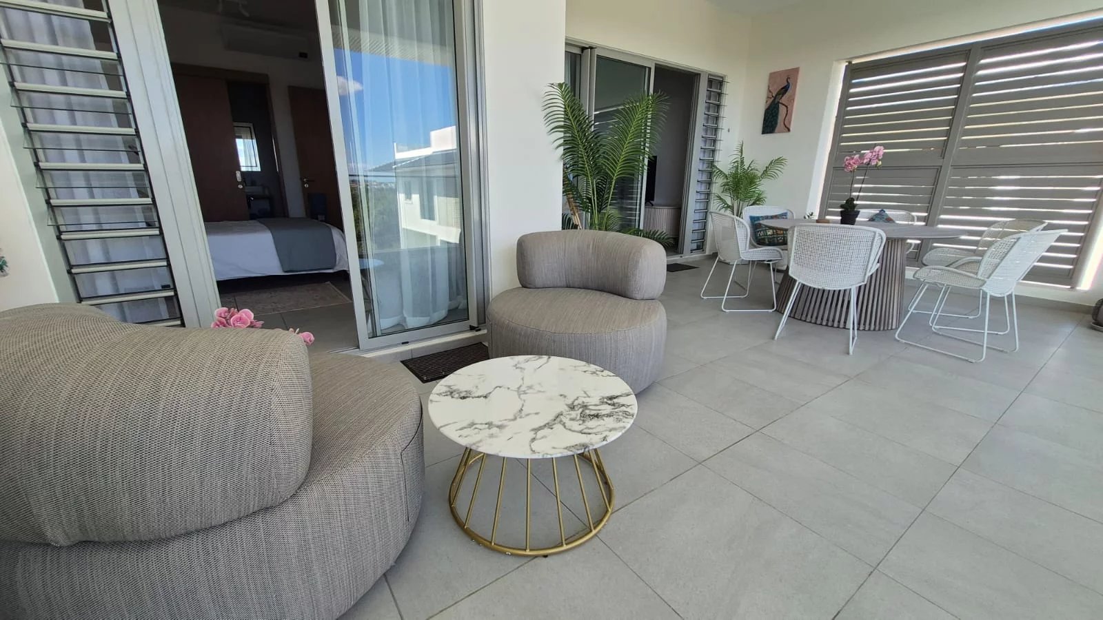 The living area opens onto a spacious terrace and private pool deck, seamlessly connecting indoor and outdoor living. Relax in your private oasis, complete with a sparkling pool and plenty of space for lounging or hosting.