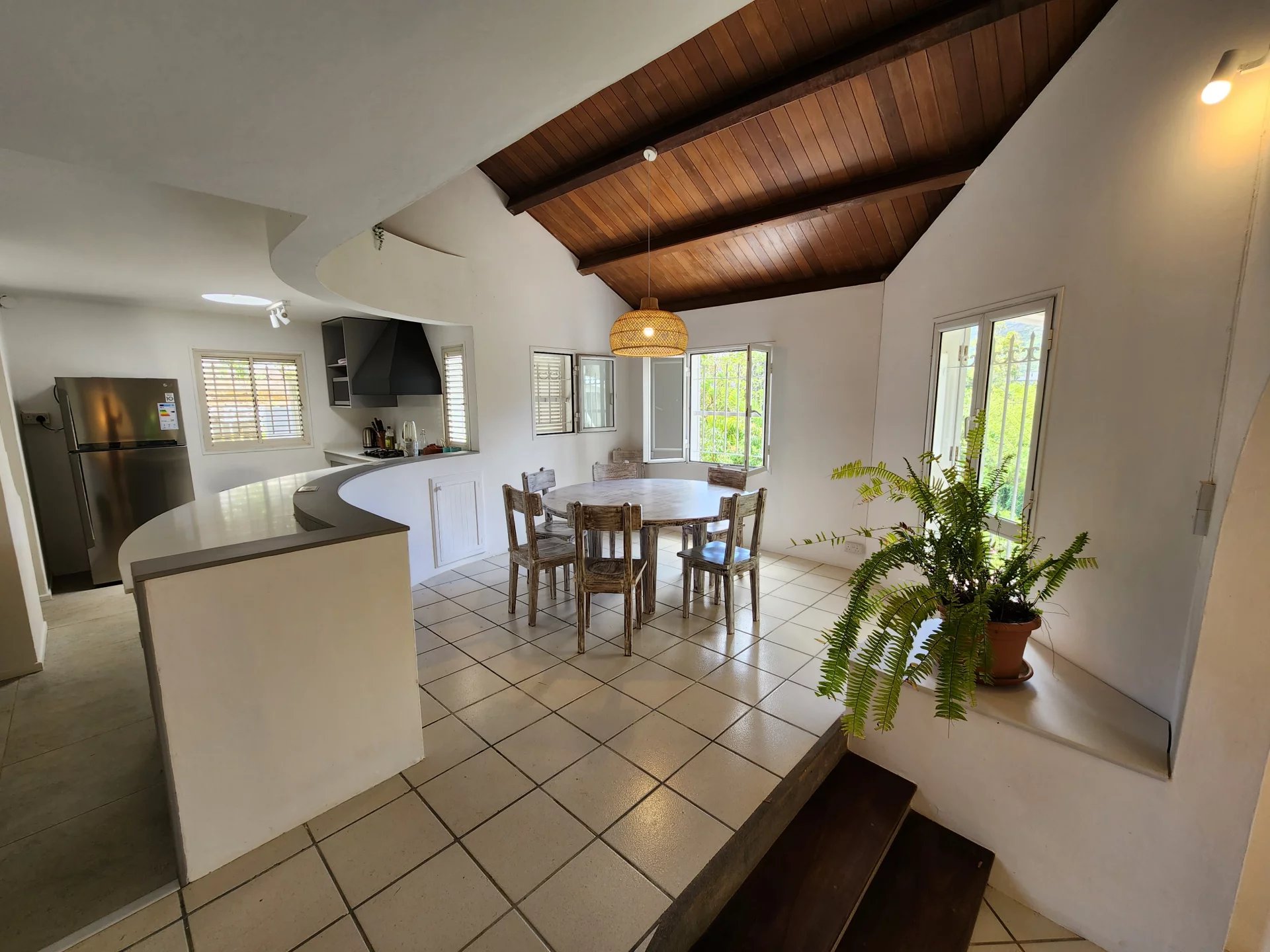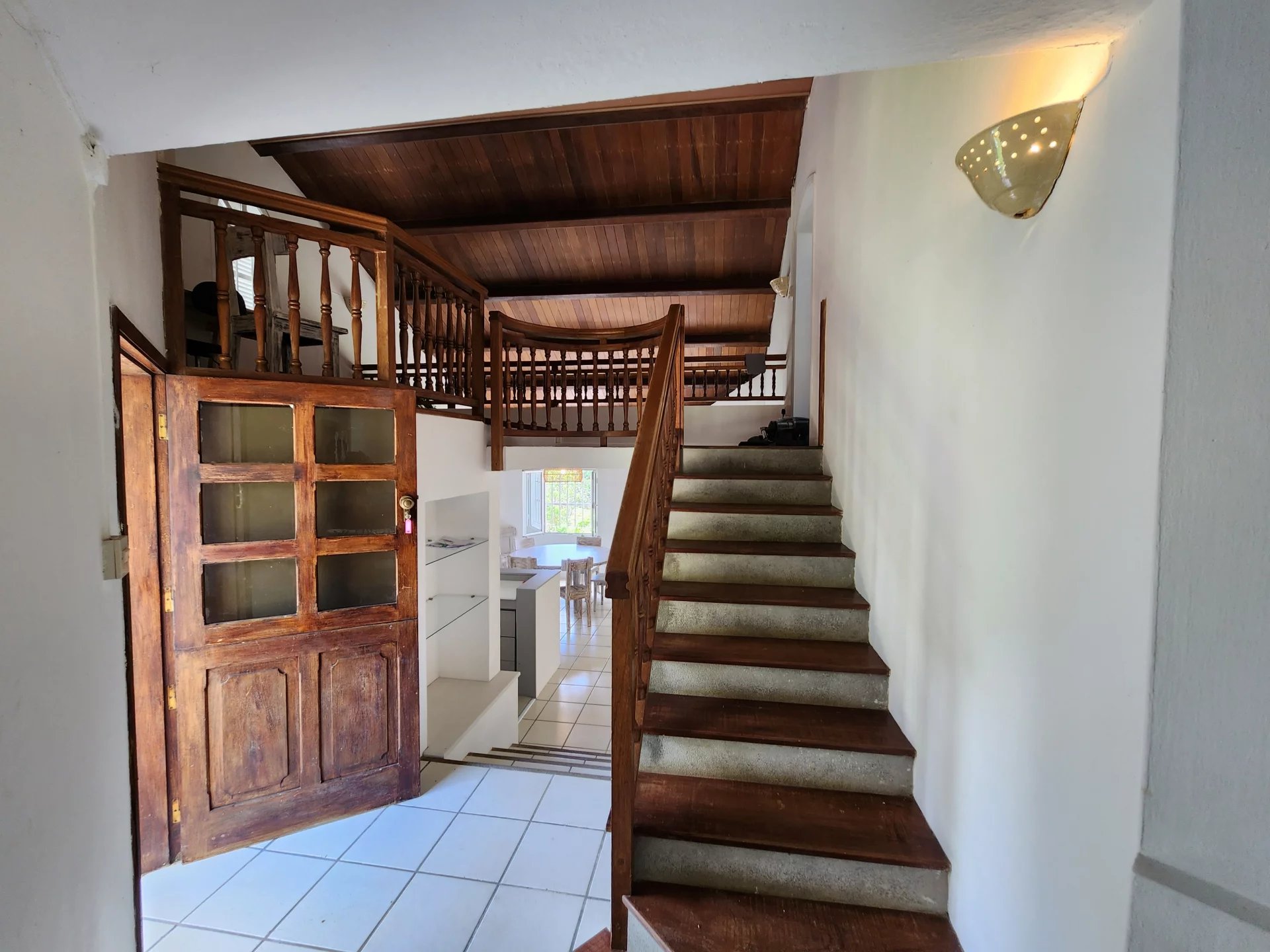 A beautiful wooden staircase leads to a mezzanine and master bedroom en suite.