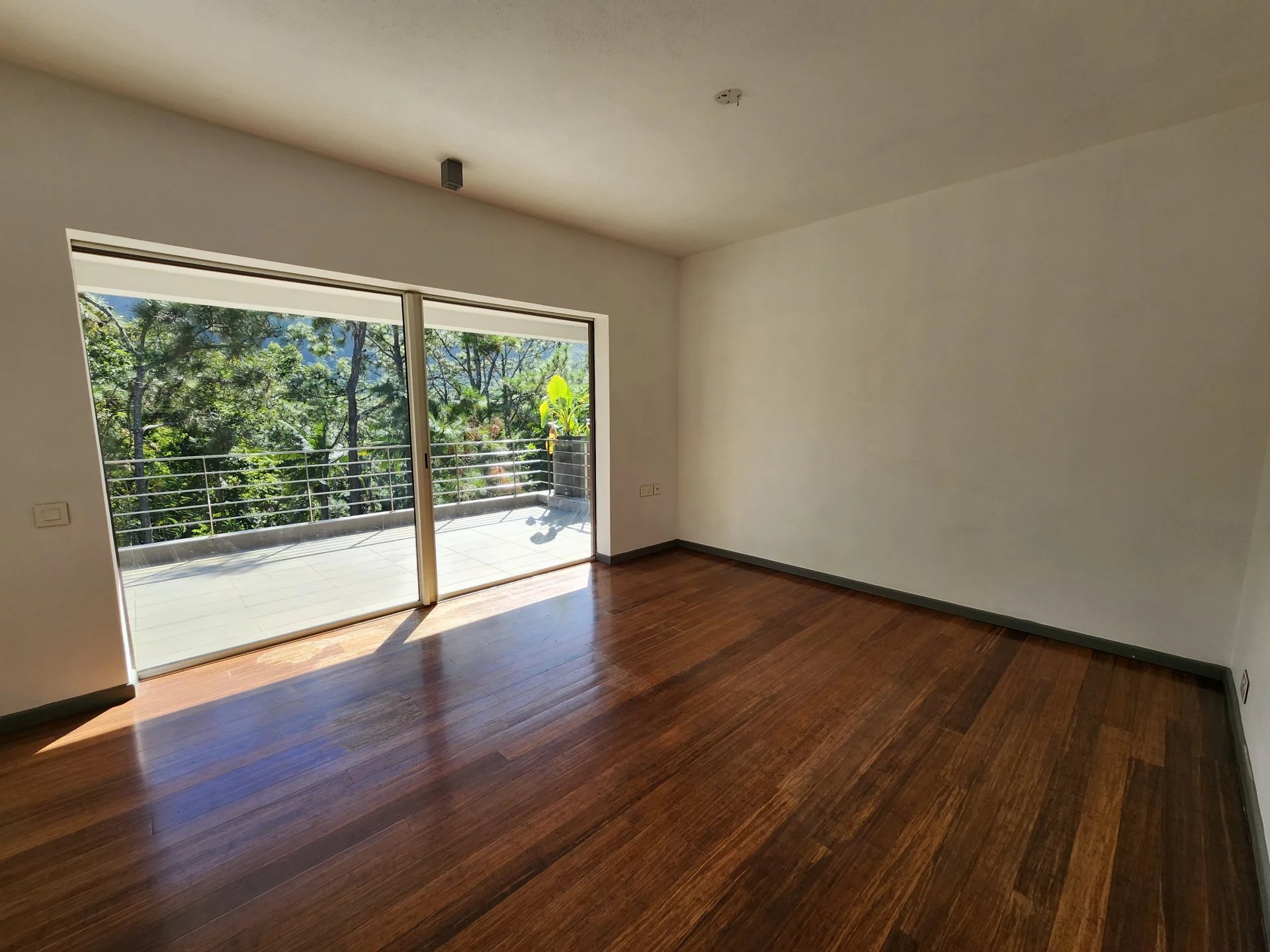 Upstairs, a wooden staircase leads to the sleeping area, which features refined parquet flooring. The air-conditioned master suite has a dressing room and opens onto a balcony with breathtaking views of the garden and surrounding mountains. Two other air-conditioned bedrooms and a shared bathroom complete the floor.