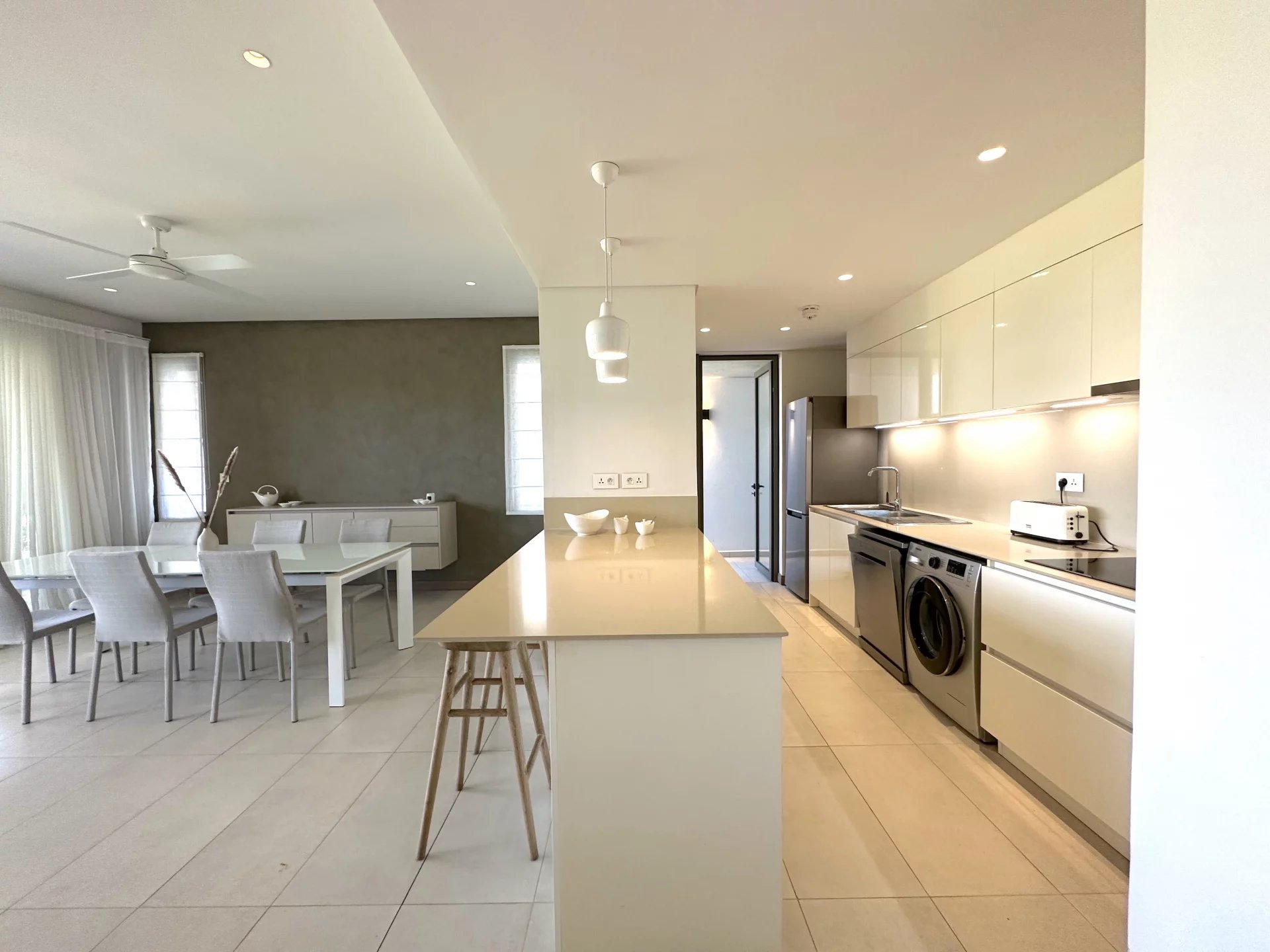 Both generously sized bedrooms are en suite, offering comfort and privacy. The modern open-plan kitchen is fully equipped, and a separate laundry room opens directly onto an outdoor drying area, adding to the practicality of the home.