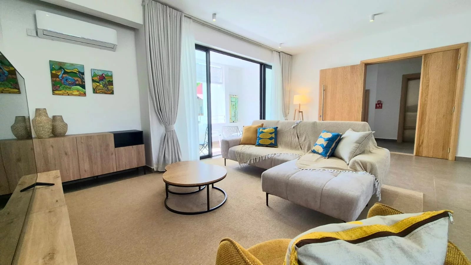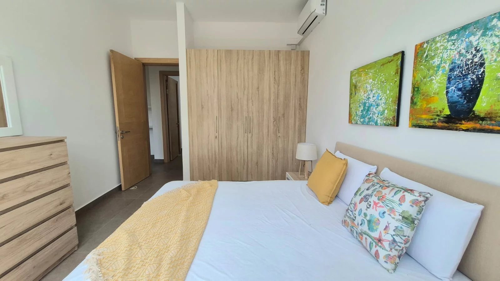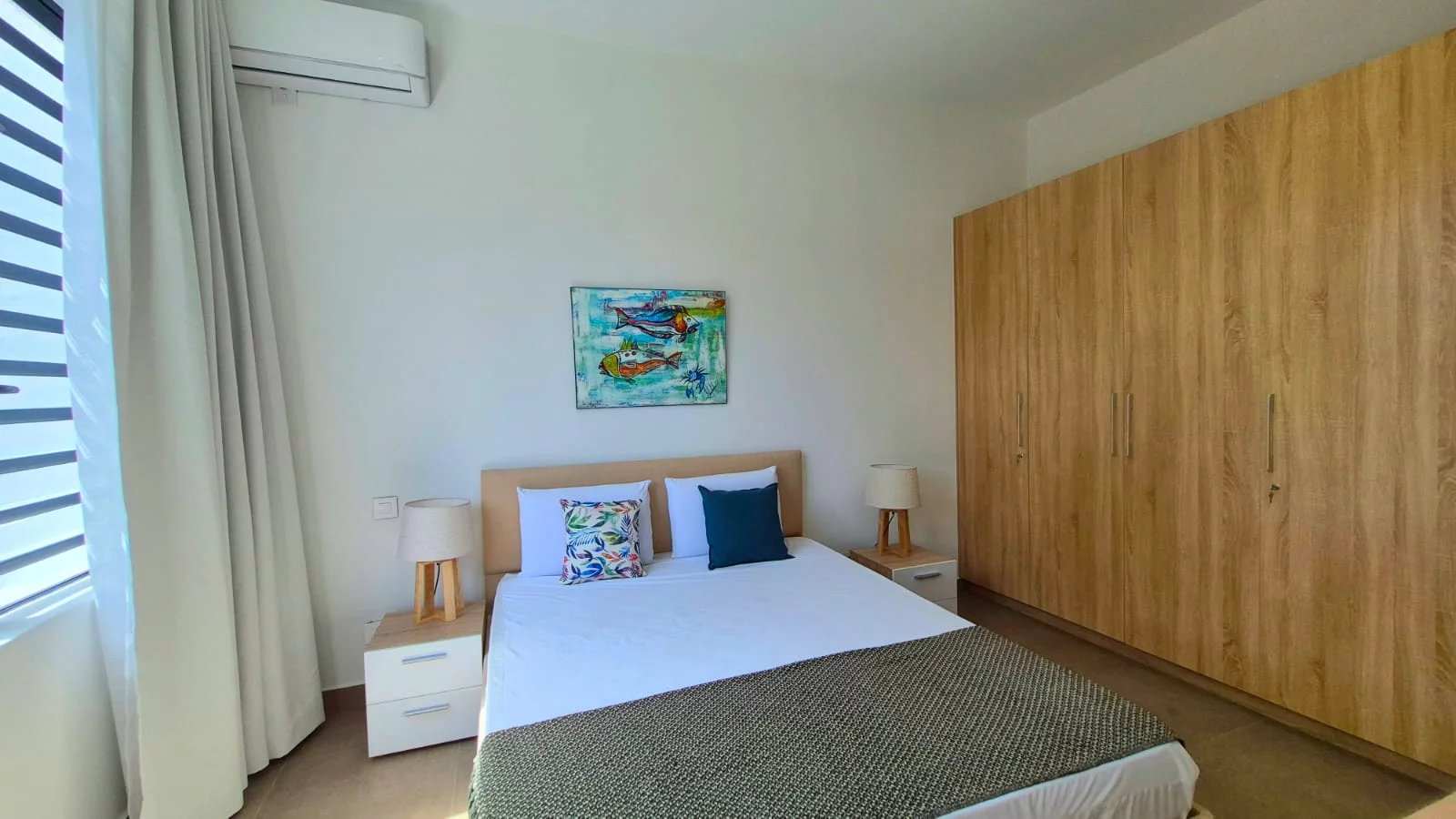 The air-conditioned apartment features three spacious bedrooms and two modern bathrooms, making it ideal for an executive couple or professionals seeking a refined long-term residence near the sea.