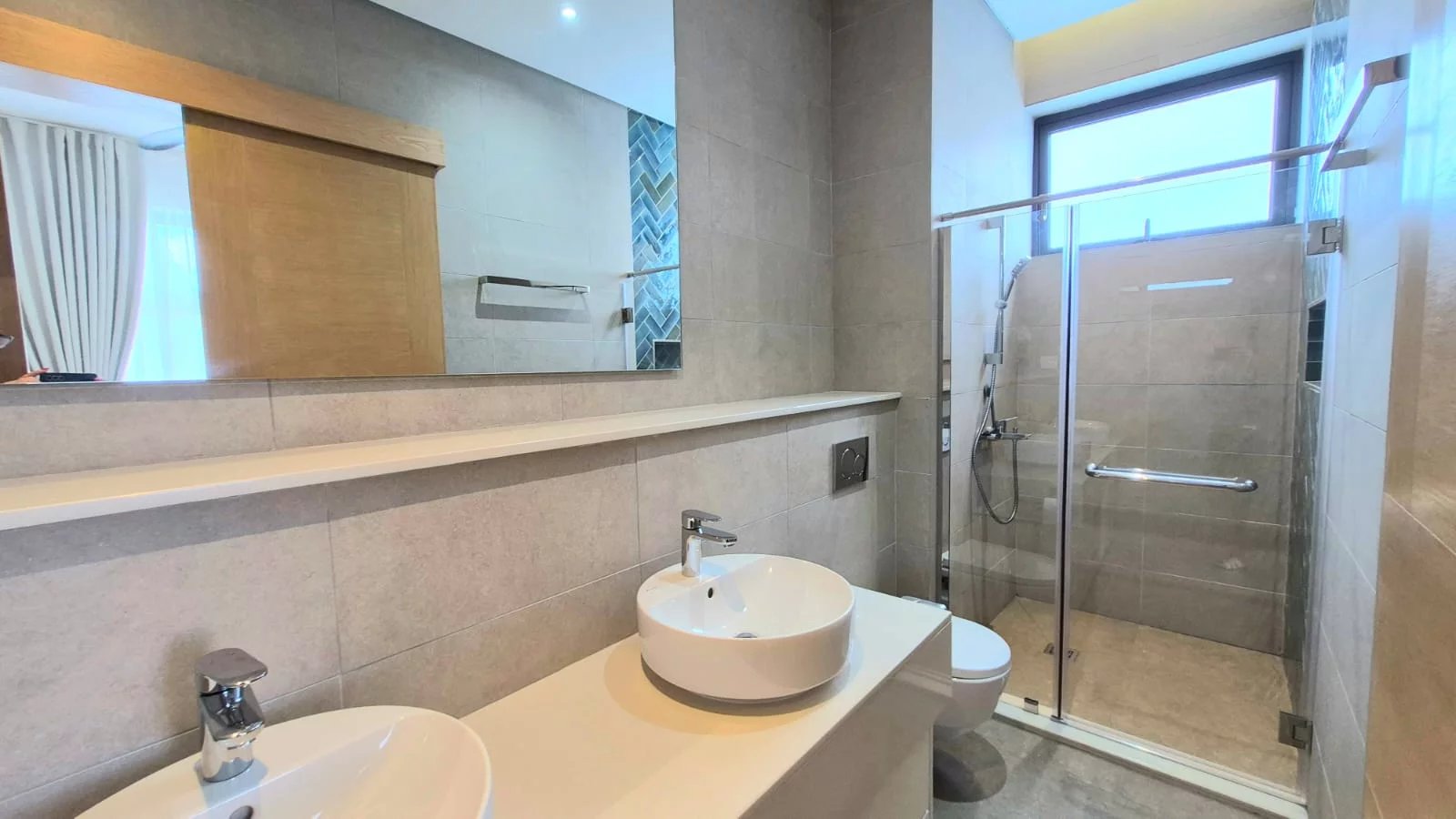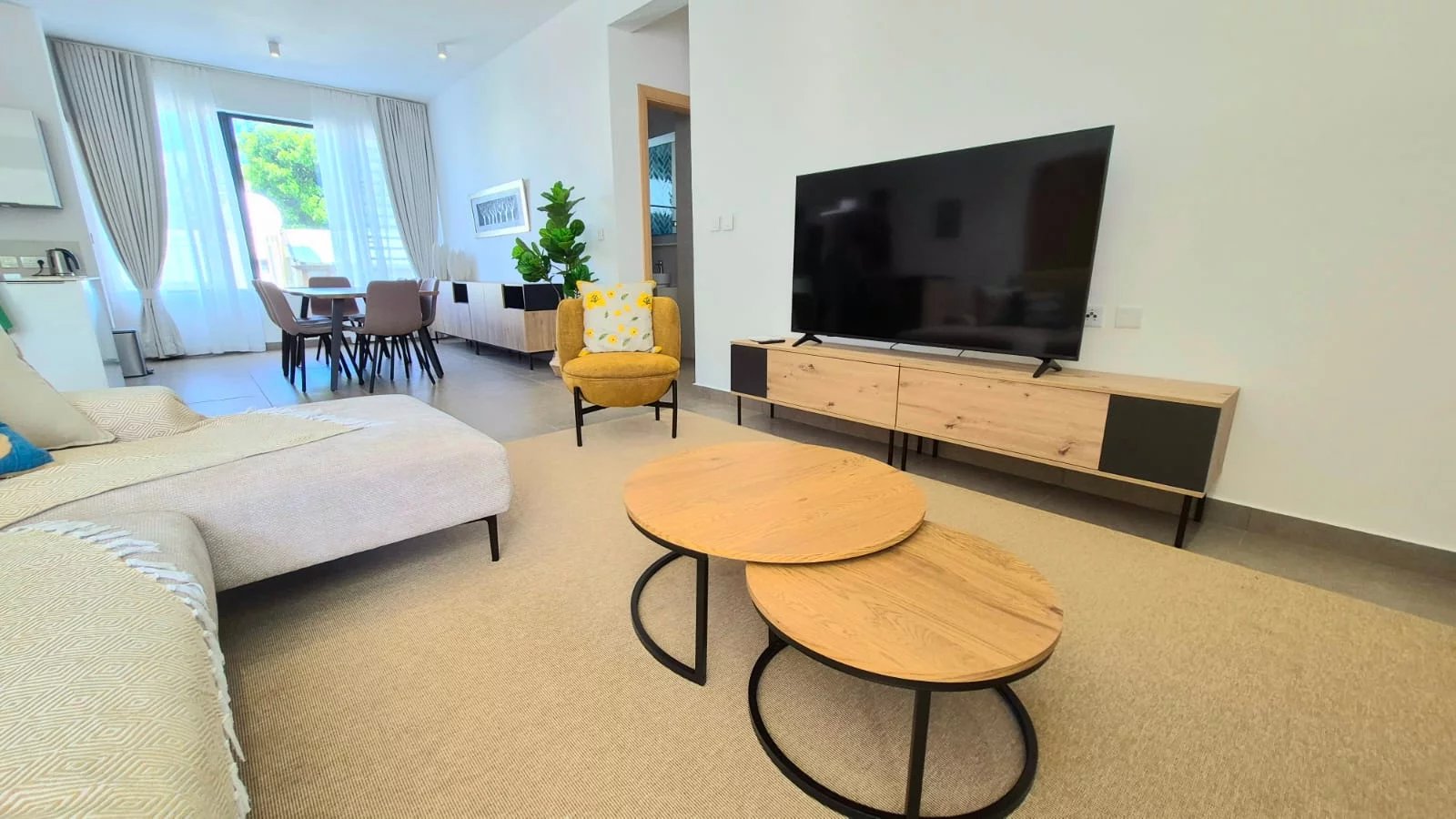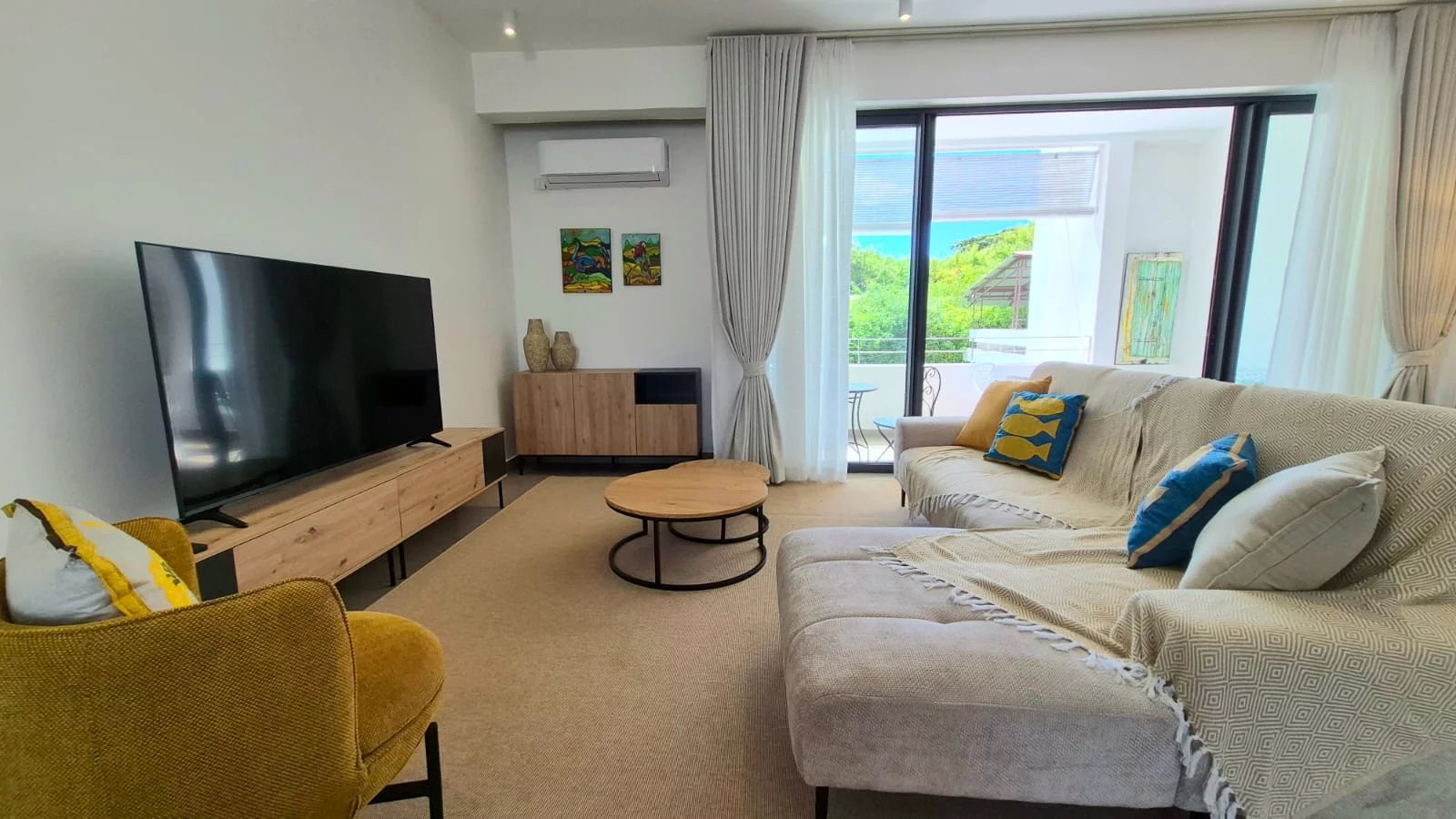 The air-conditioned apartment features three spacious bedrooms and two modern bathrooms, making it ideal for an executive couple or professionals seeking a refined long-term residence near the sea.
