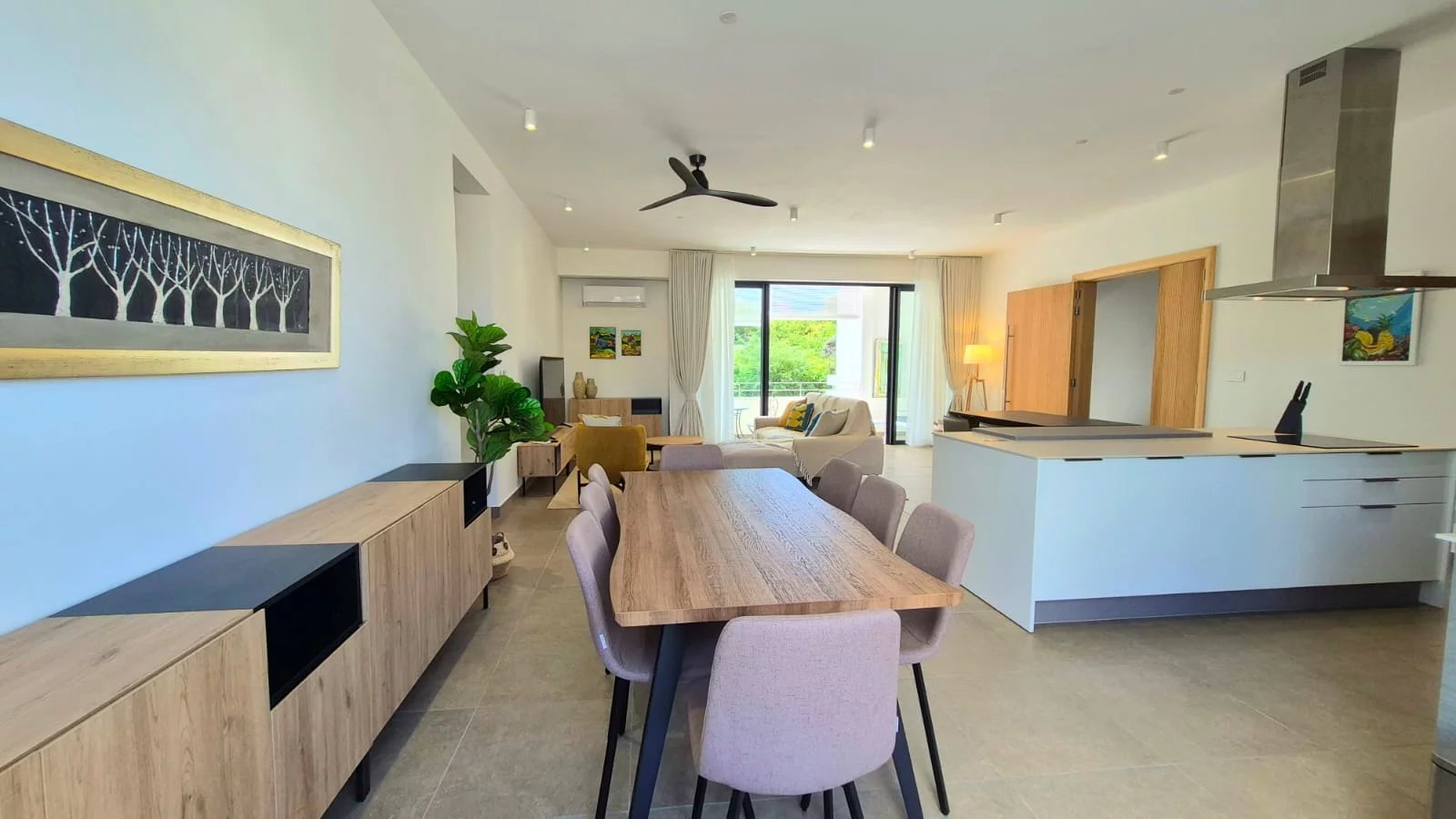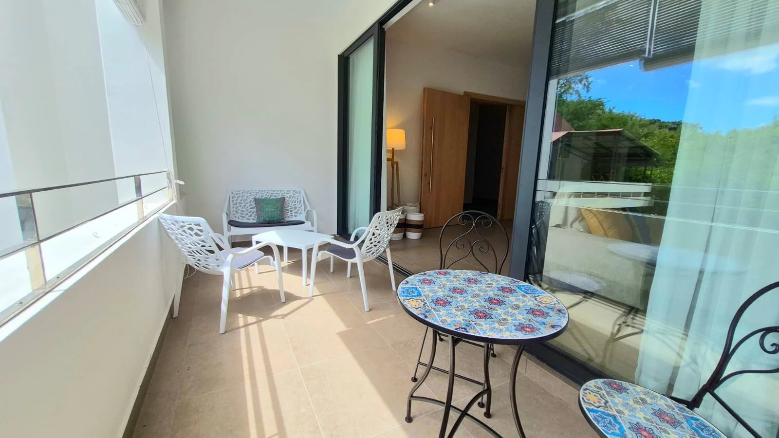 Large doors open from the living space onto a charming private terrace fitted with blinds, creating a relaxed space for outdoor dining or enjoying the tropical climate.