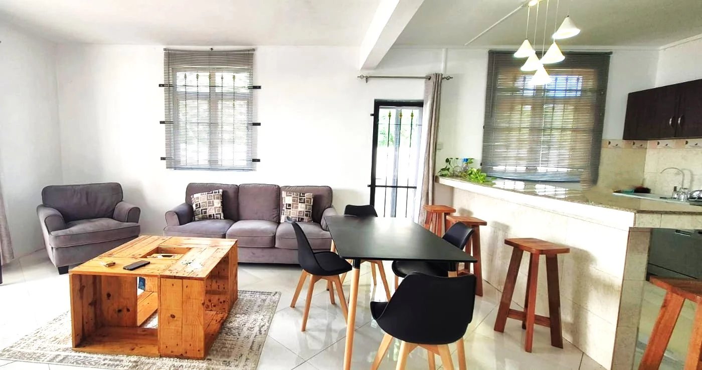 The home features a bright, open-plan layout with a spacious living room, dining area, and a well-equipped kitchen that flows onto a covered terrace — perfect for entertaining.