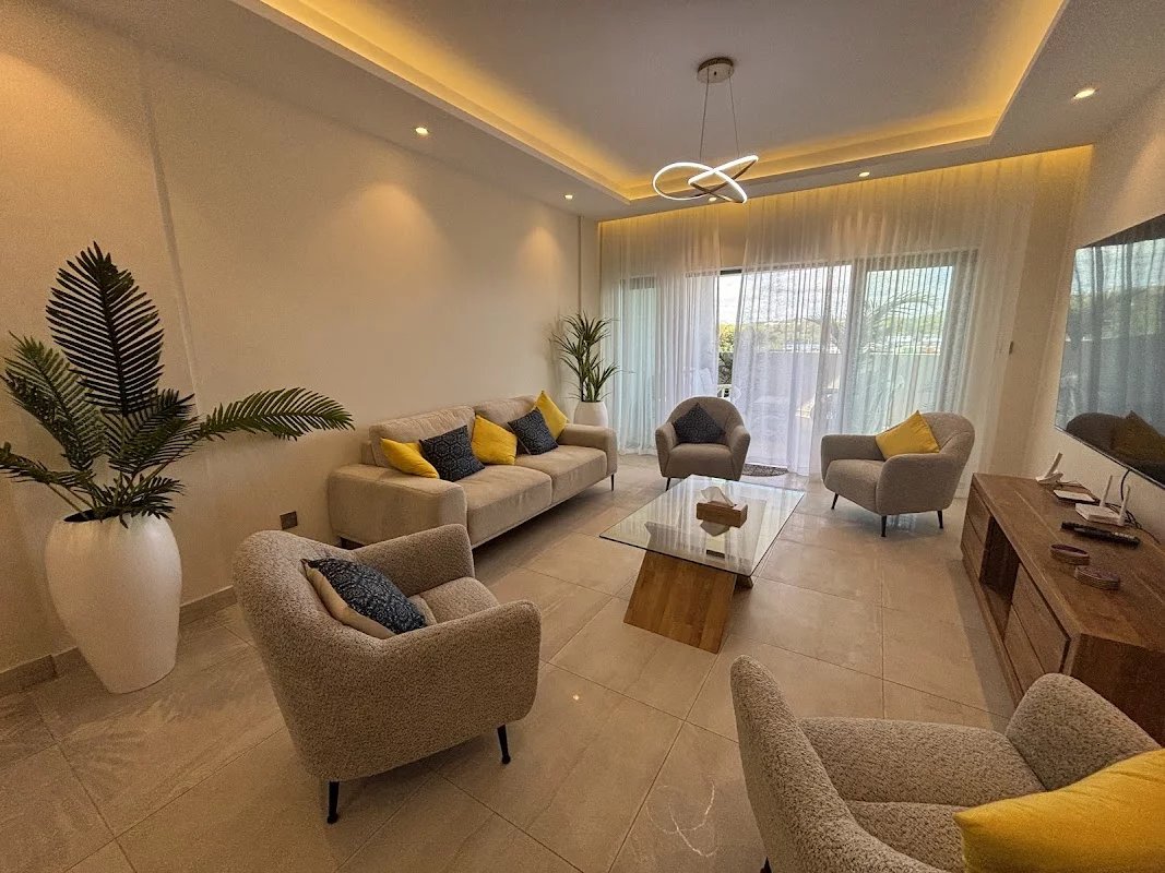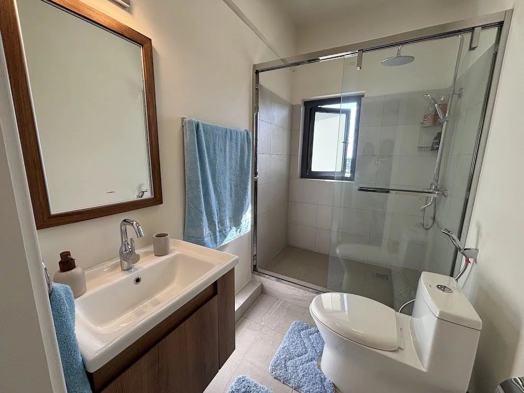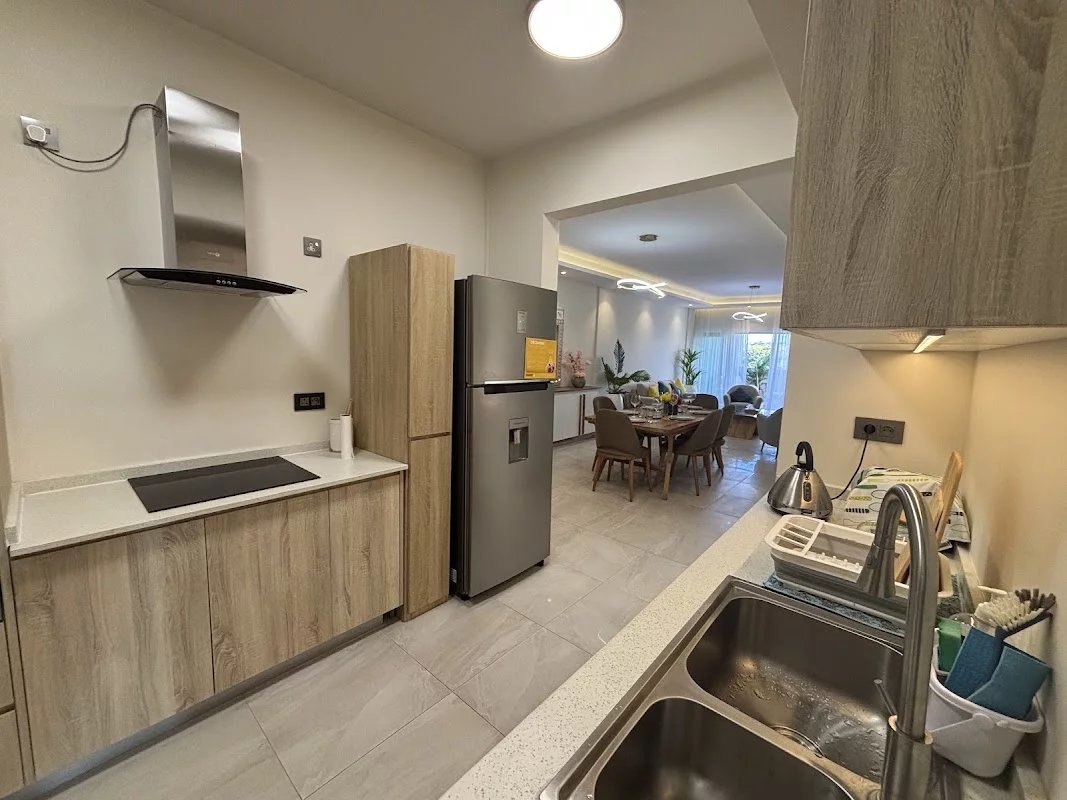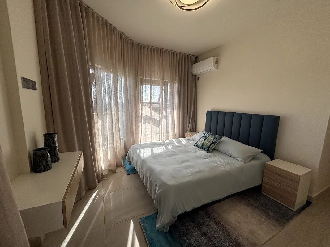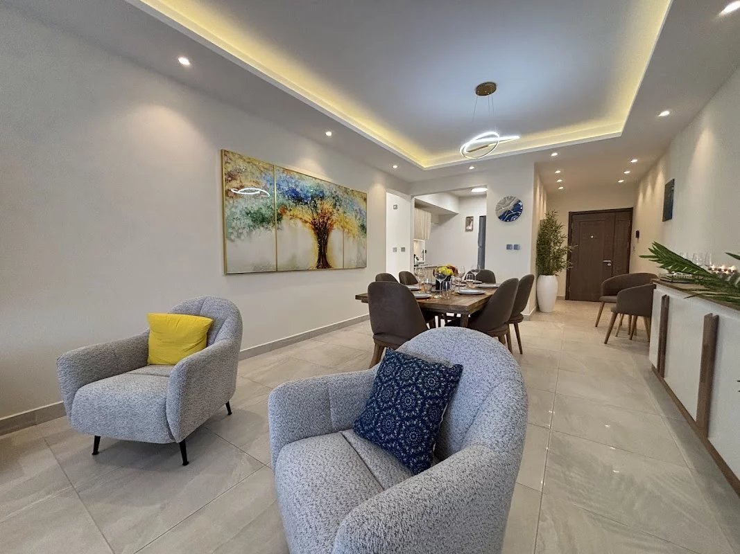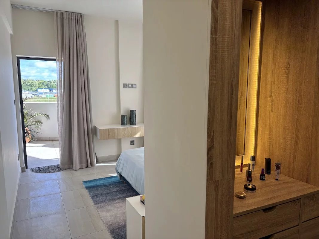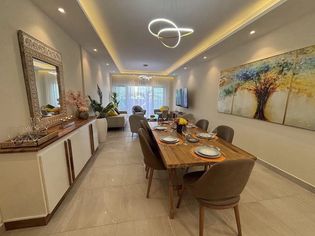 The apartment has a master suite with its dressing room and bathroom, as well as two additional bedrooms which share another bathroom.