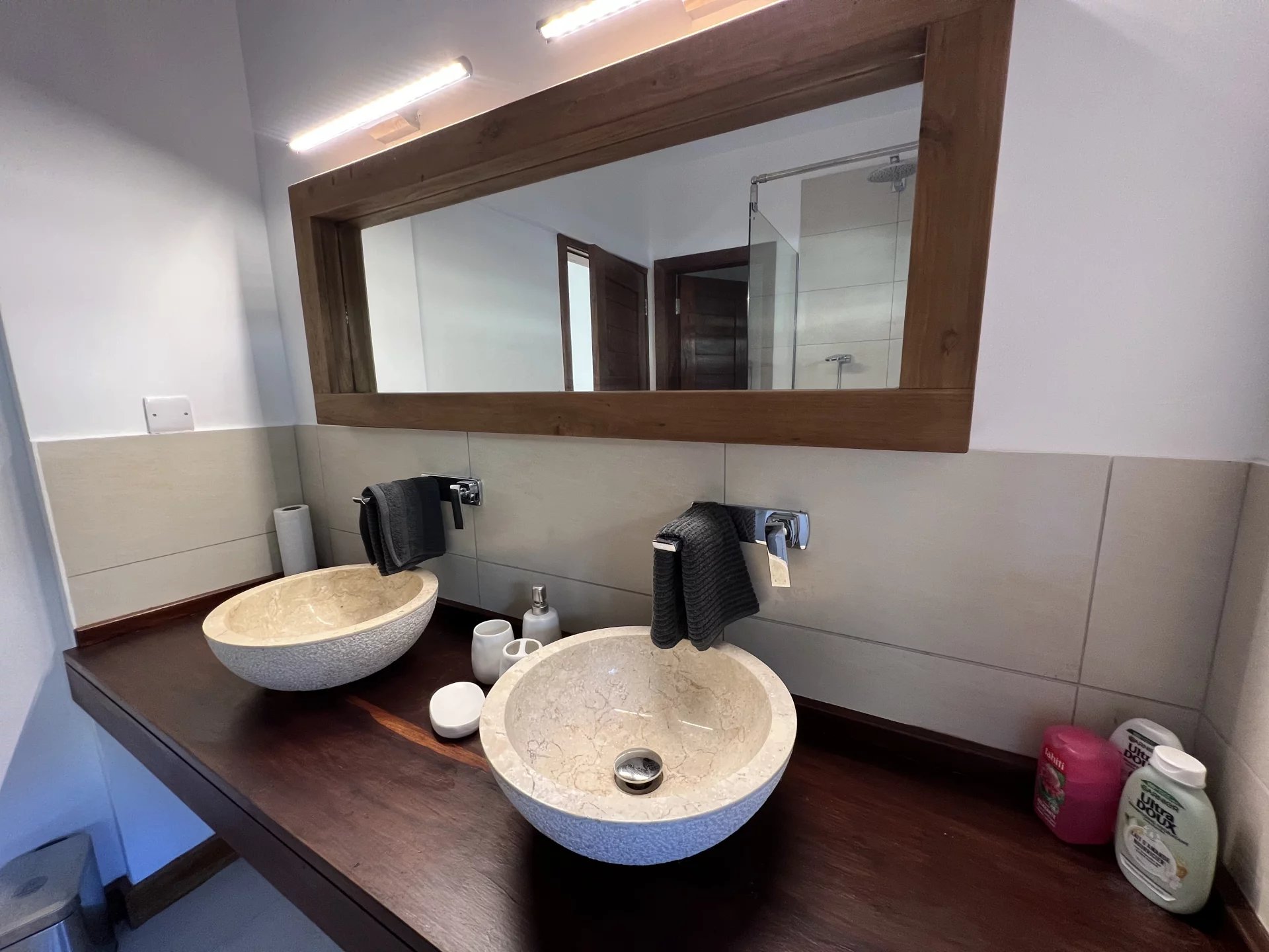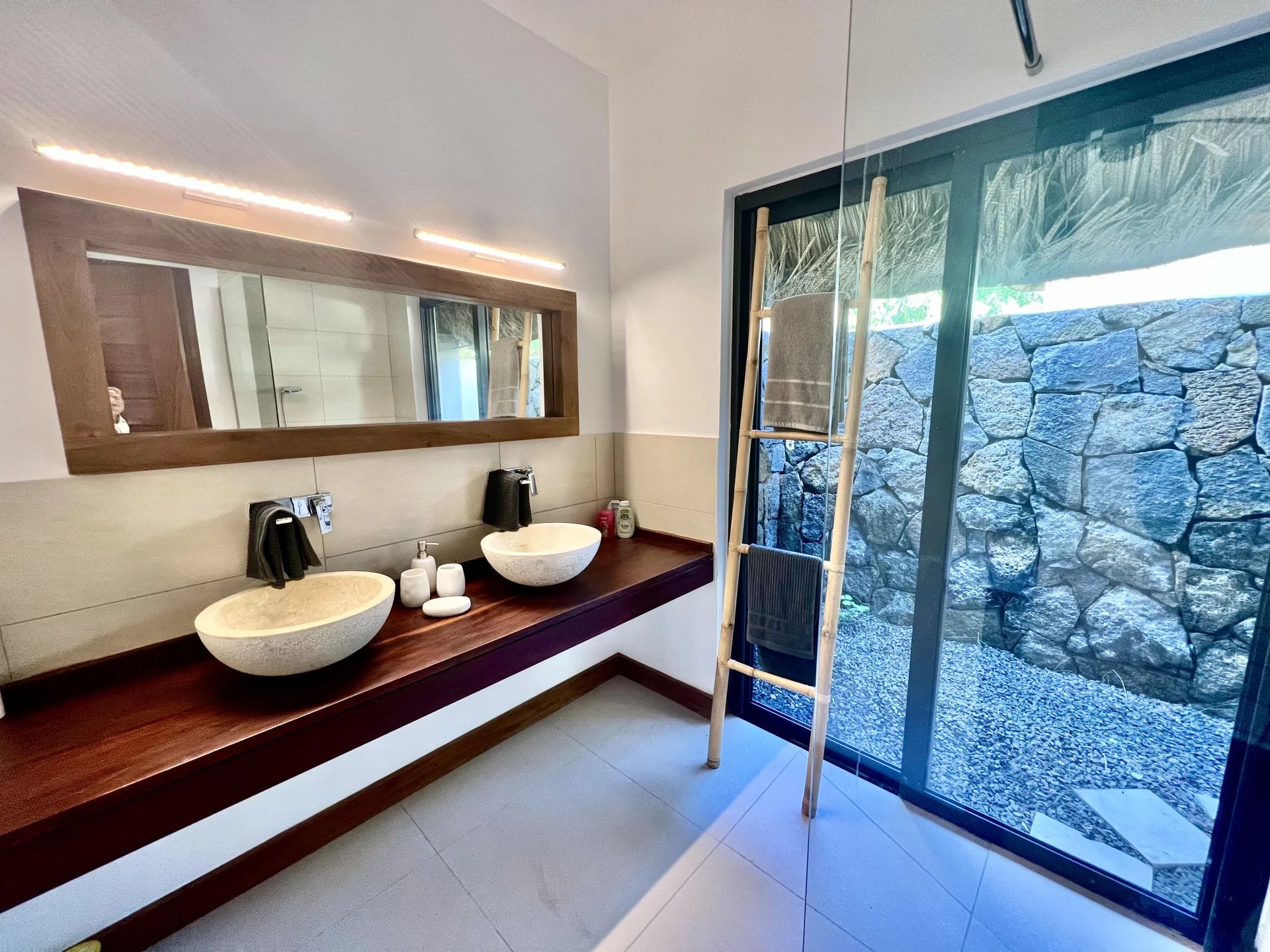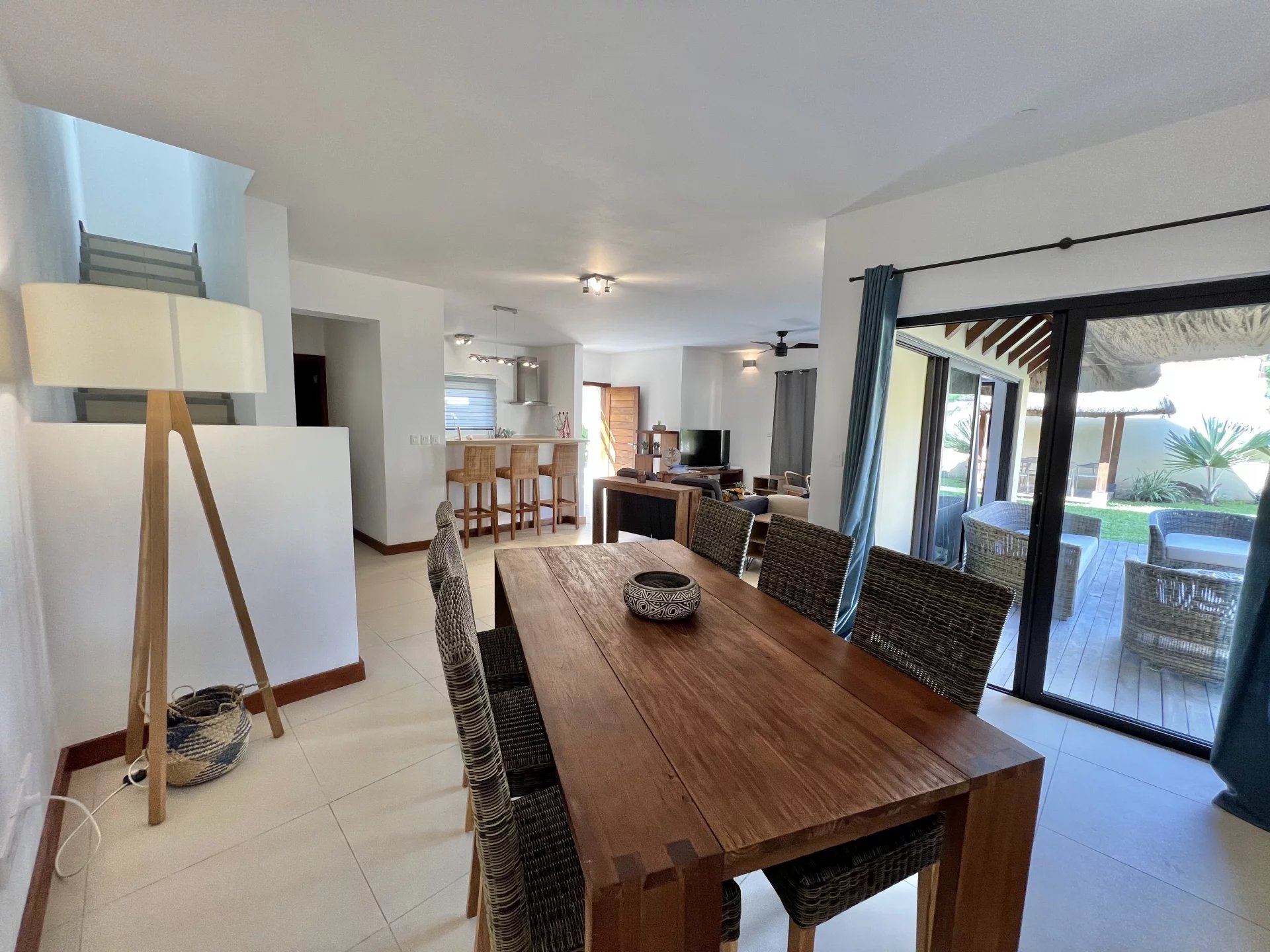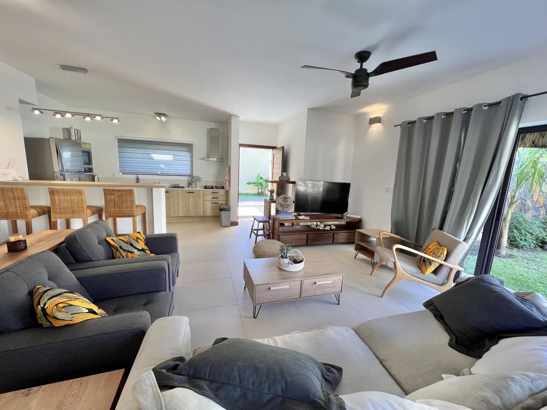 It has 3 air-conditioned bedrooms (1 en suite), 1 other bathroom, a fully equipped and modern kitchen, a laundry room, a superb living room with large openings on the terrace which offers a panoramic view on the beautiful pool in its oasis. It is organized around a covered kiosk that is best arranged for entertaining and sharing pleasant moments with family and friends.