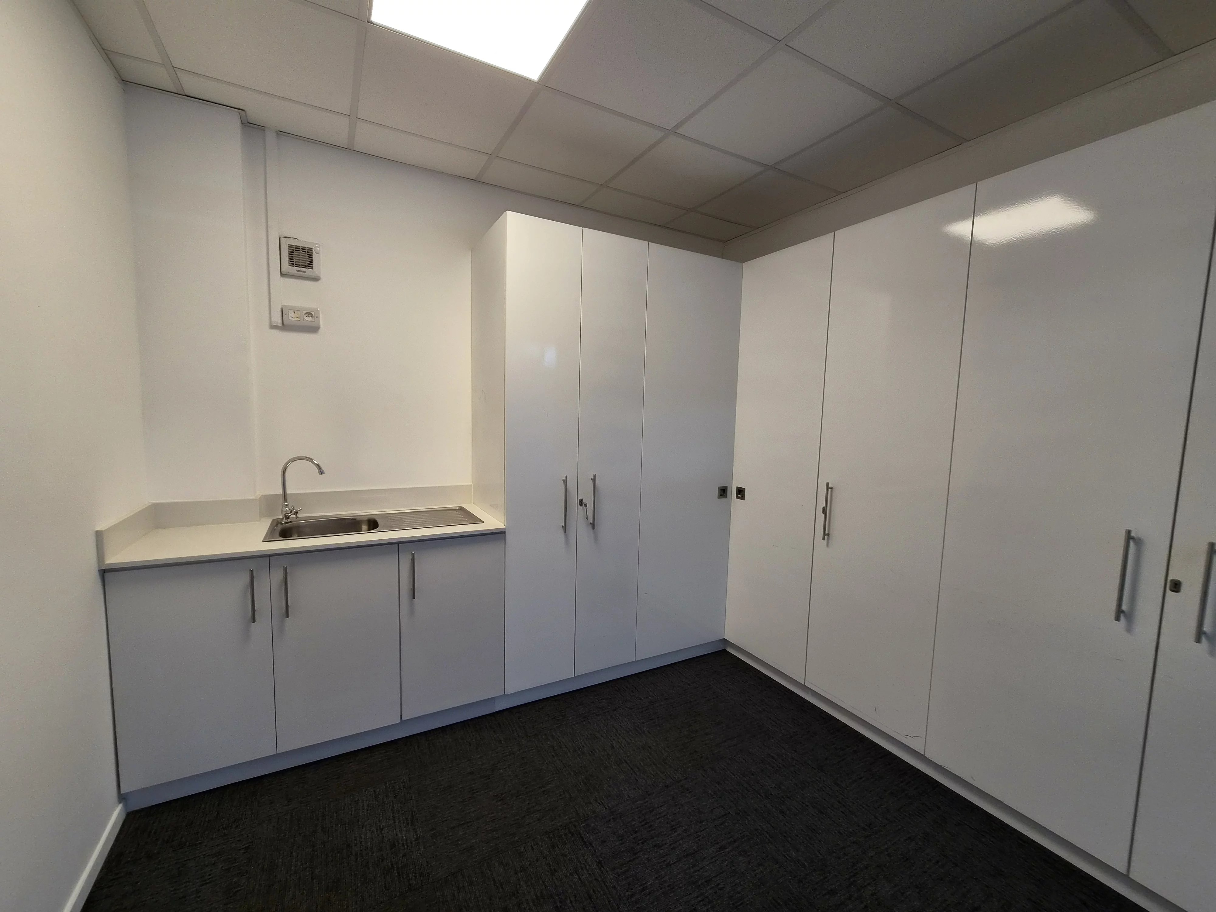 Located on the ground floor of a modern building, this functional workspace features a bright open-plan area, a meeting room, a private office, and a kitchenette with storage.