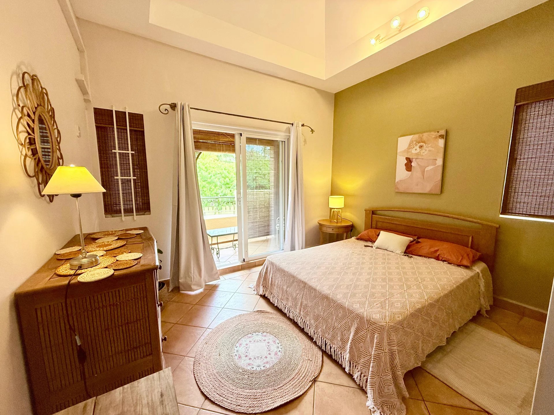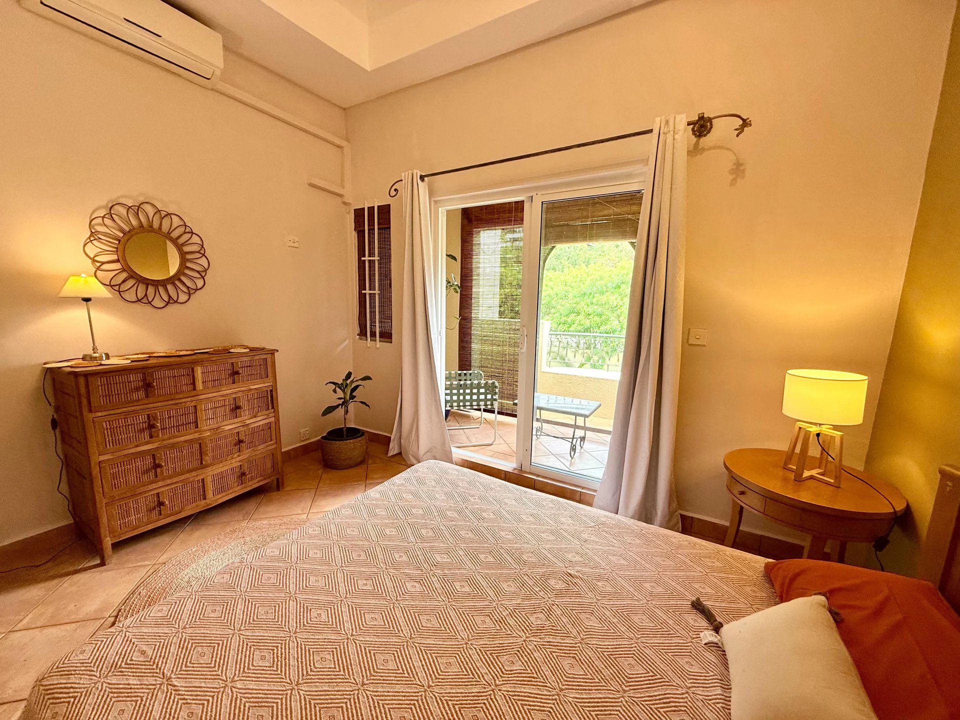 The house features three bedrooms: the first comes with a spacious walk-in closet, the second with a lovely balcony boasting breathtaking views of the iconic La Tourelle Mountain, and the third, equipped with a double bed, is perfect for children or guests. Two bathrooms complete the interior, including one with a large bathtub. Bright living spaces create a cosy-chic atmosphere, and the house is rented fully furnished and equipped, ready to welcome its new tenants.