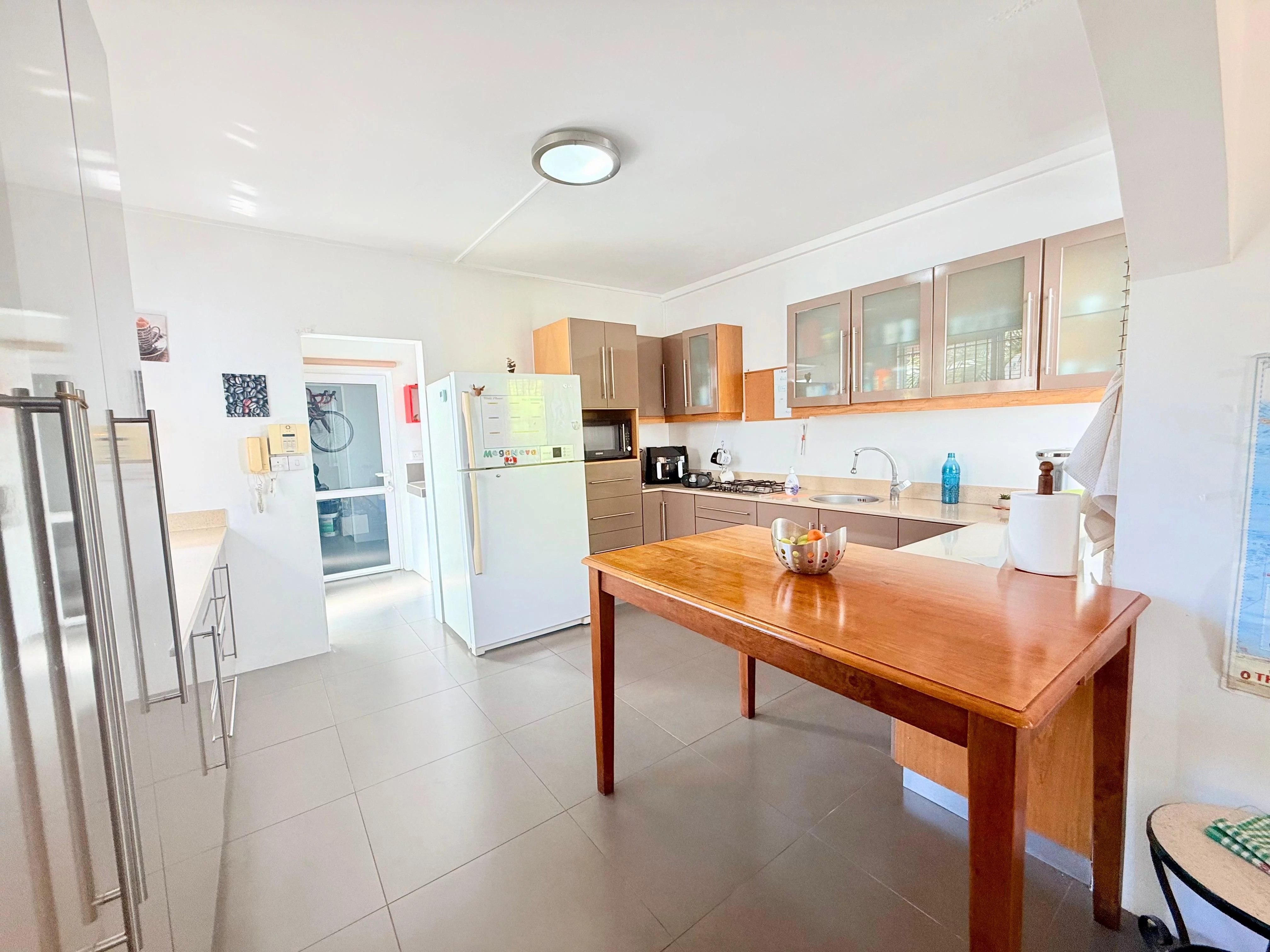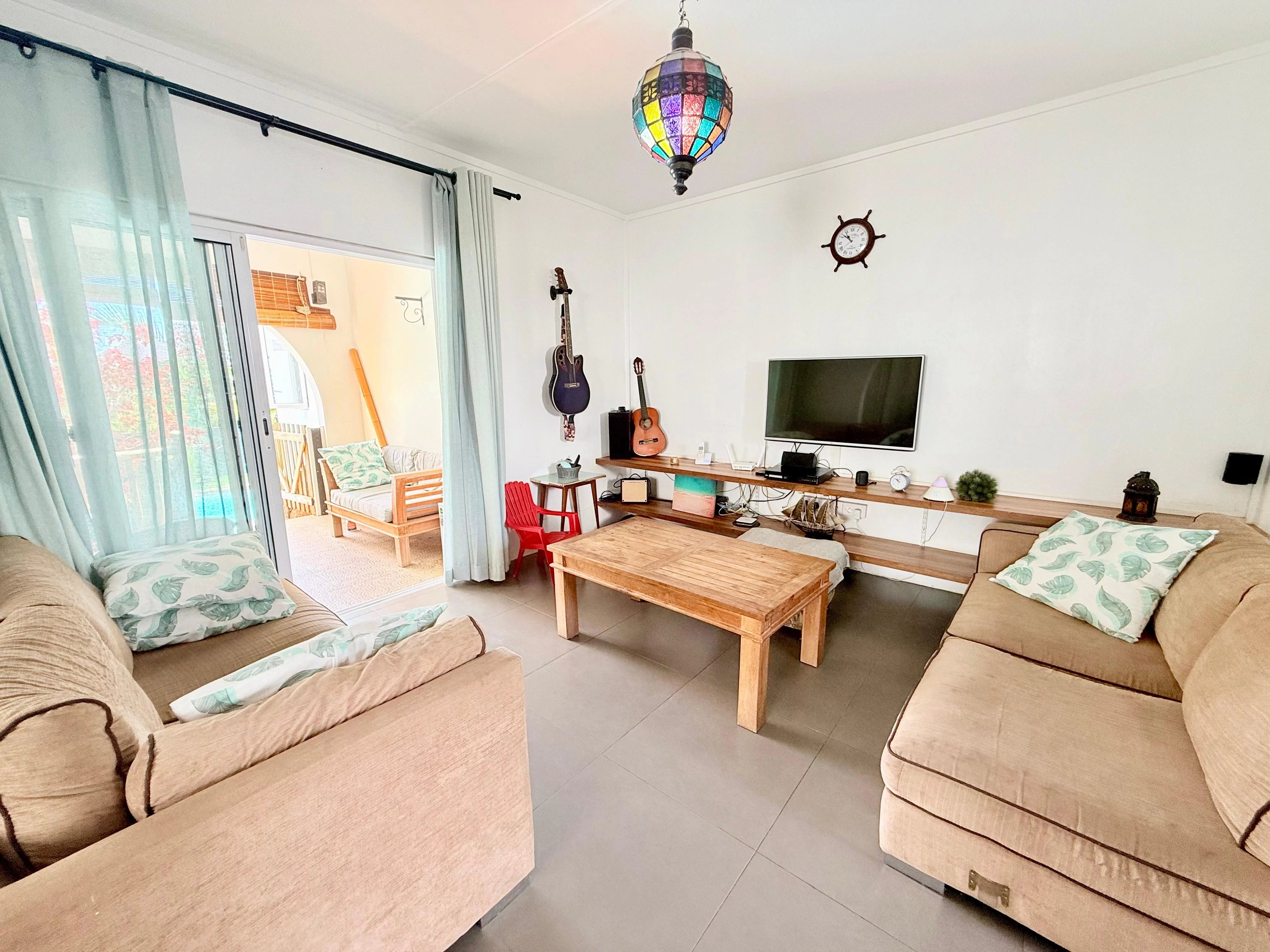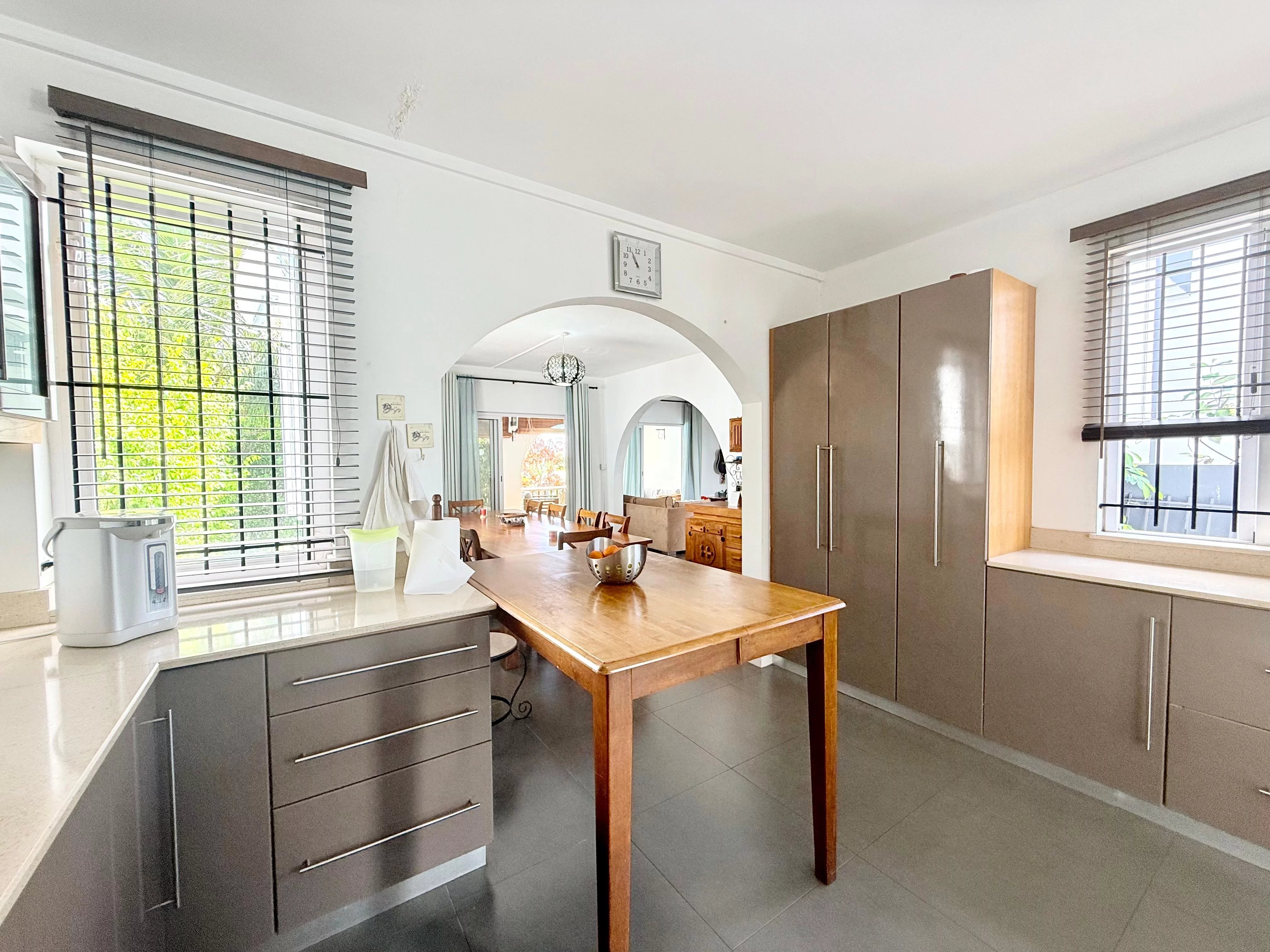 The villa is equipped with several practical features designed to enhance comfort and security. A spacious garage and automatic entrance gate ensure convenience, while a Brinks alarm system provides peace of mind. The property also benefits from a solar water heater, two large water tanks, an automatic irrigation system for the garden, and waterproofing that remains under warranty.
