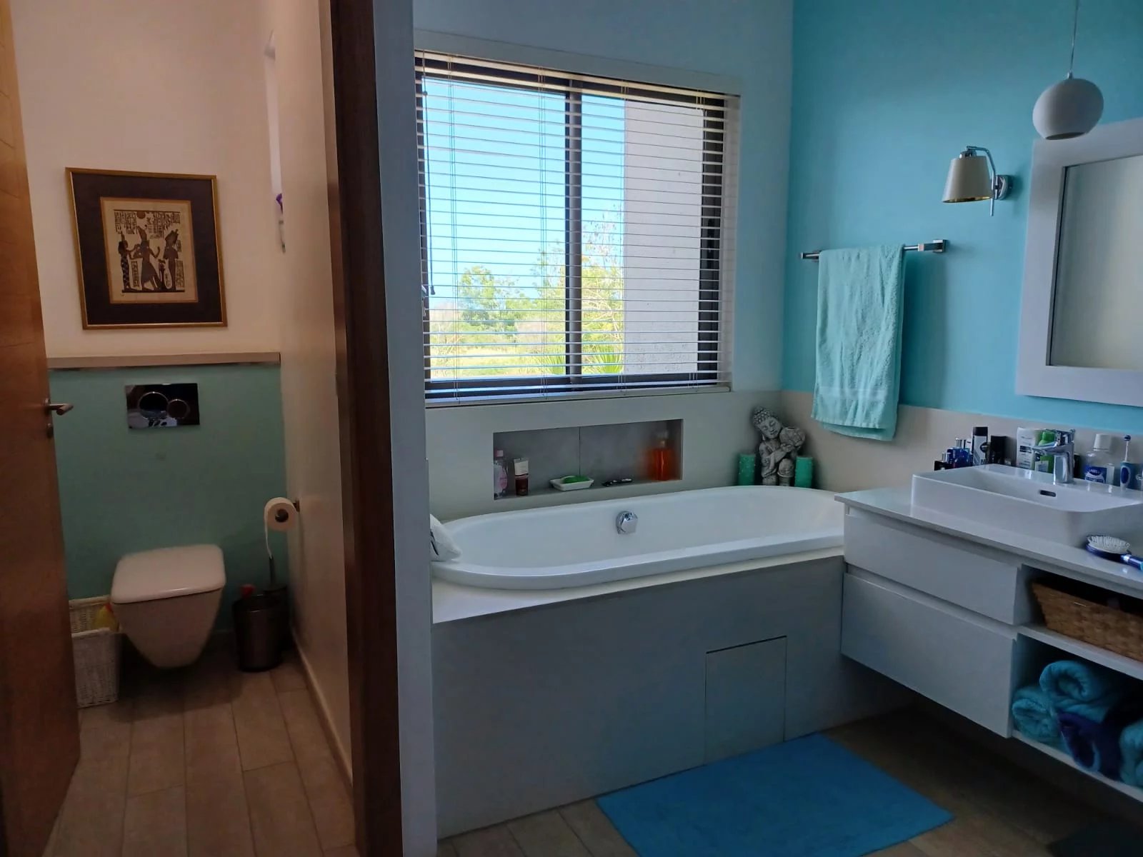 The kitchen is elegantly designed, featuring a double oven and abundant storage space, ideal for culinary enthusiasts and those who love to entertain guests. Additionally, residents can enjoy convenient access to the estate on foot, allowing for leisurely strolls through nature.