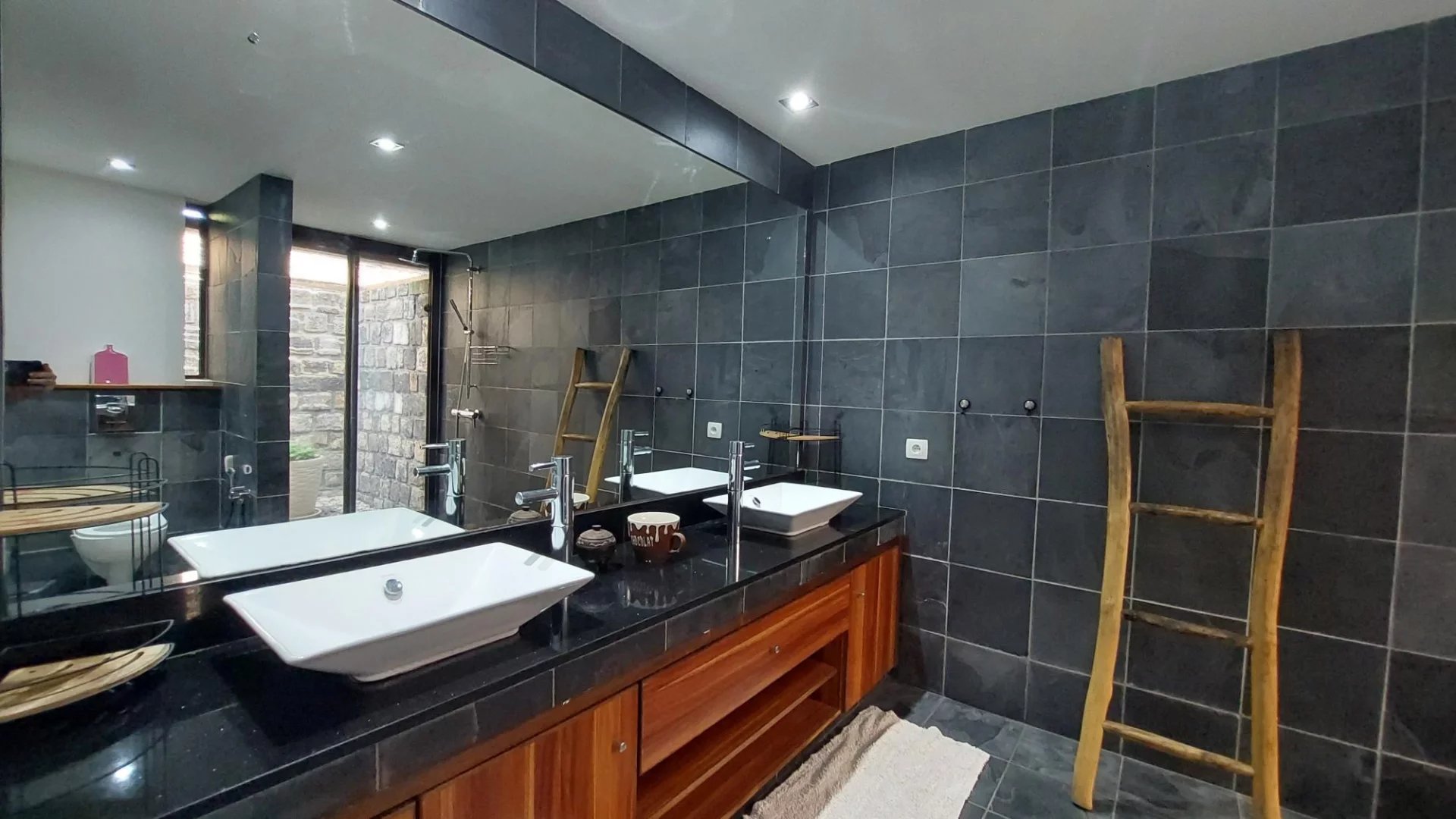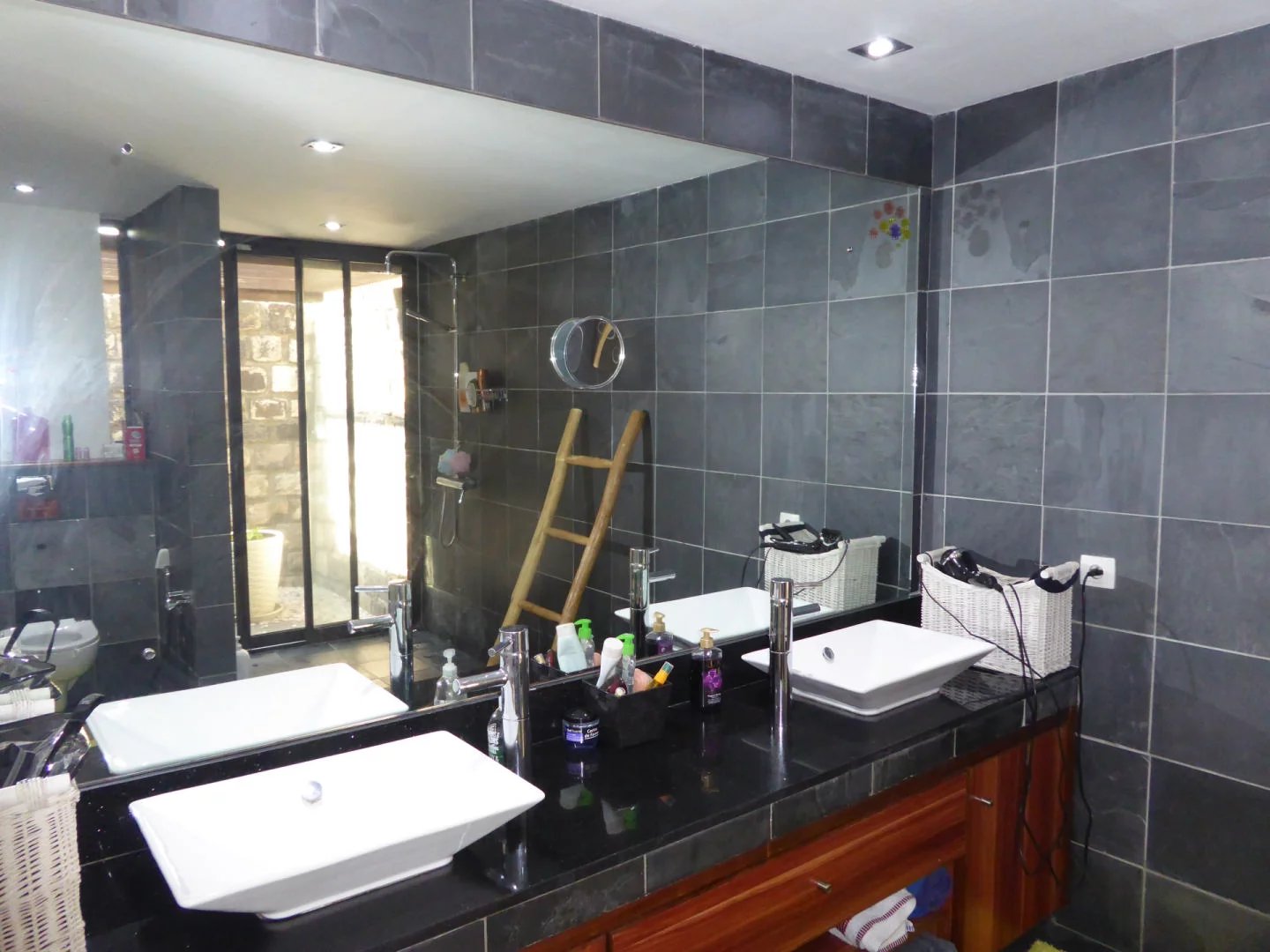 Also on the same landing, a vast, bright living room opens onto the pool on one side and a large garden on the other. Not far from the living room is the well-equipped open-plan kitchen and utility room. The upper floor features a mezzanine office and a 4th bedroom.