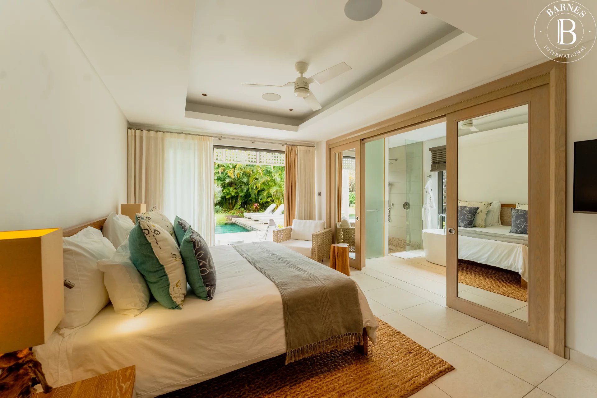 From the moment you step inside, the generous volumes and natural light create an immediate sense of harmony. The spacious living area opens onto a contemporary, fully equipped kitchen designed with openness and conviviality in mind. This beautiful living space extends effortlessly onto a large outdoor terrace featuring a second lounge area overlooking the pool and lush tropical garden, offering total privacy and an atmosphere of peace and serenity.