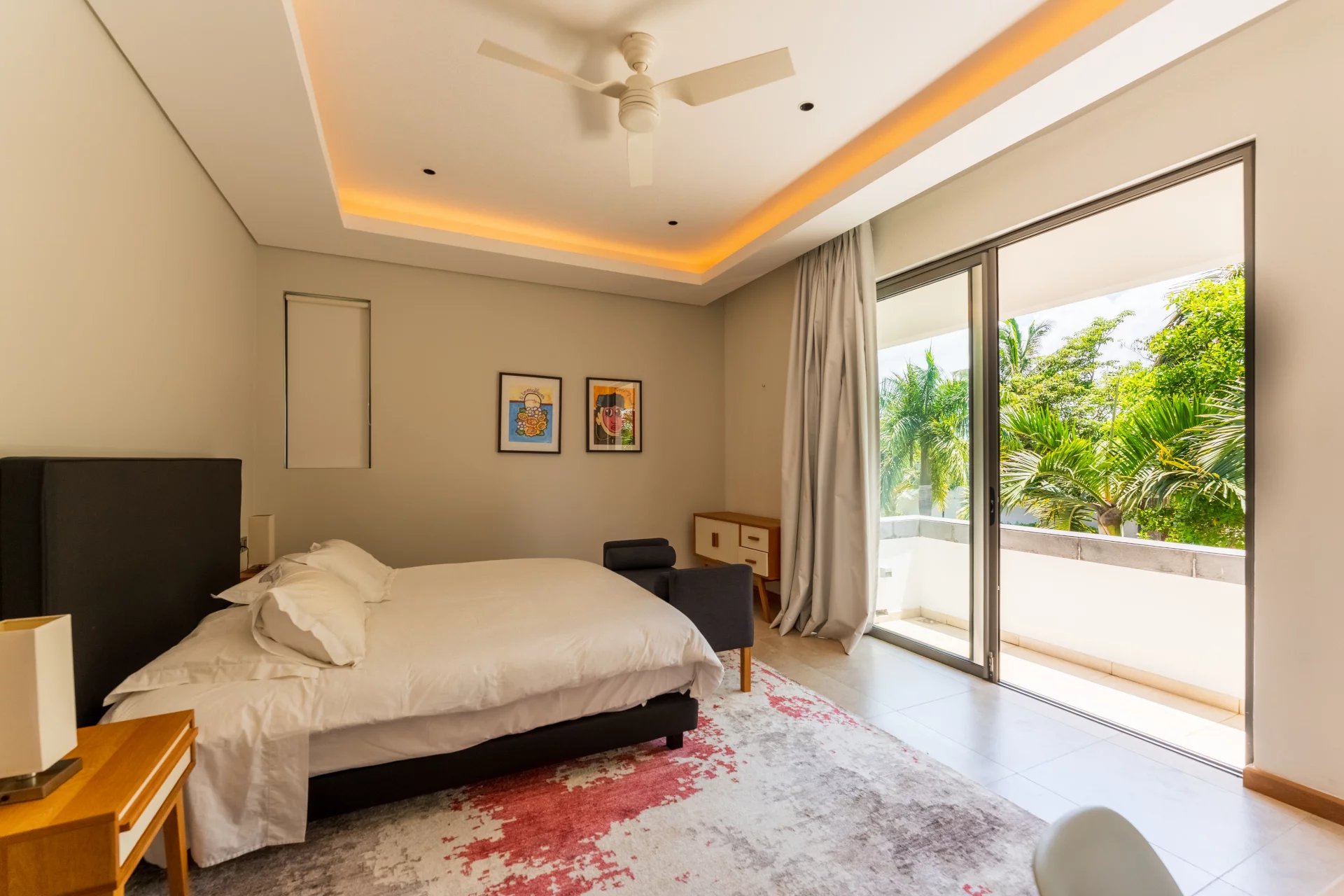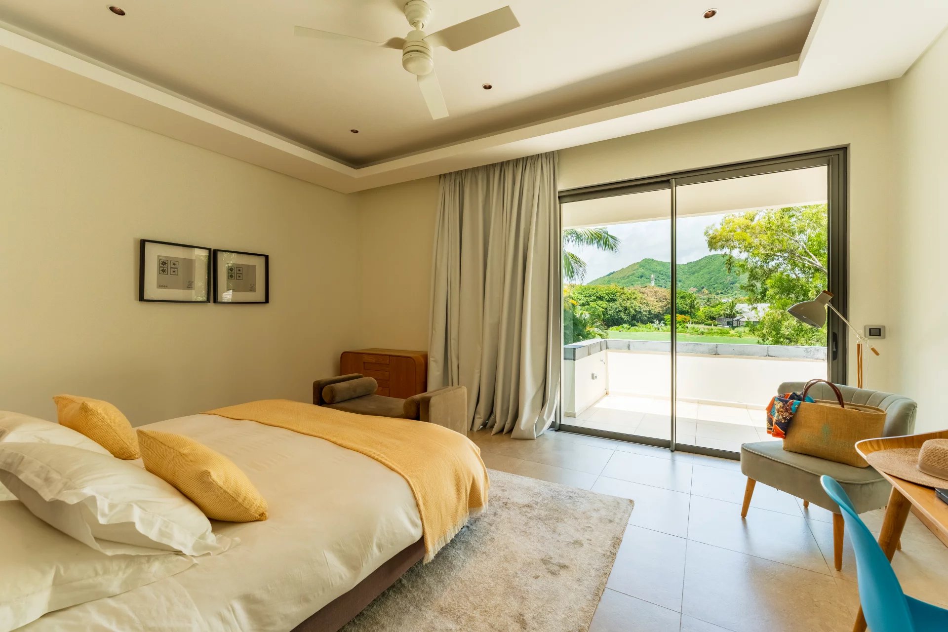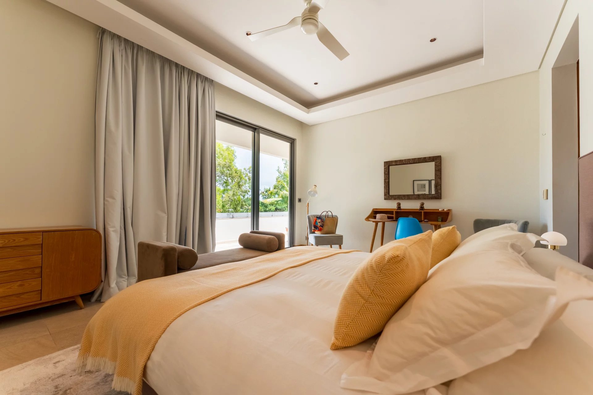 Upstairs, four exquisite en-suite bedrooms each offer a private bathroom and access to wide balconies, with calming views over the garden and lush surroundings of the resort.