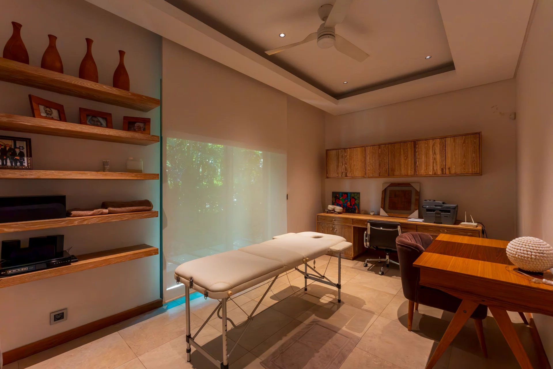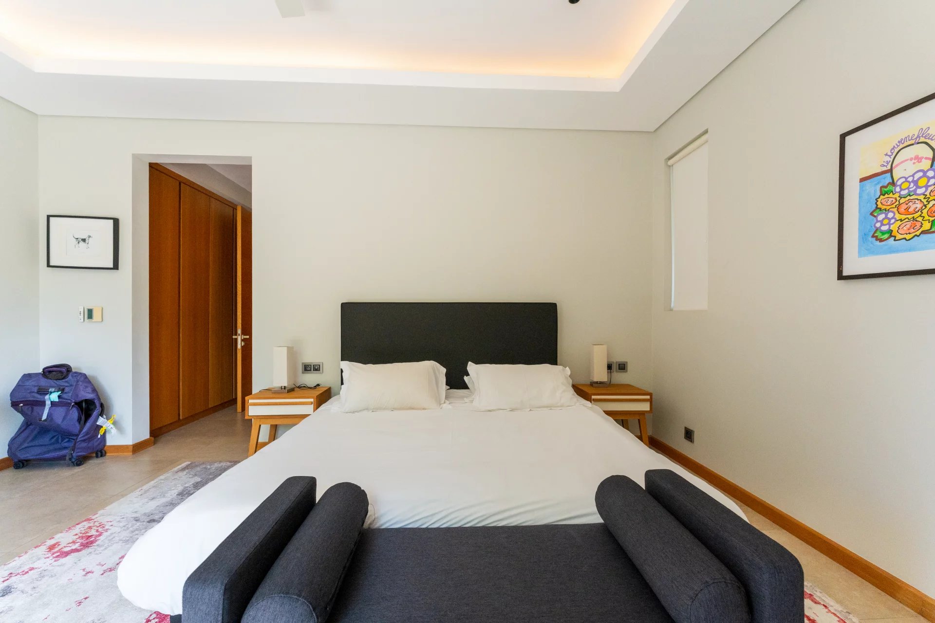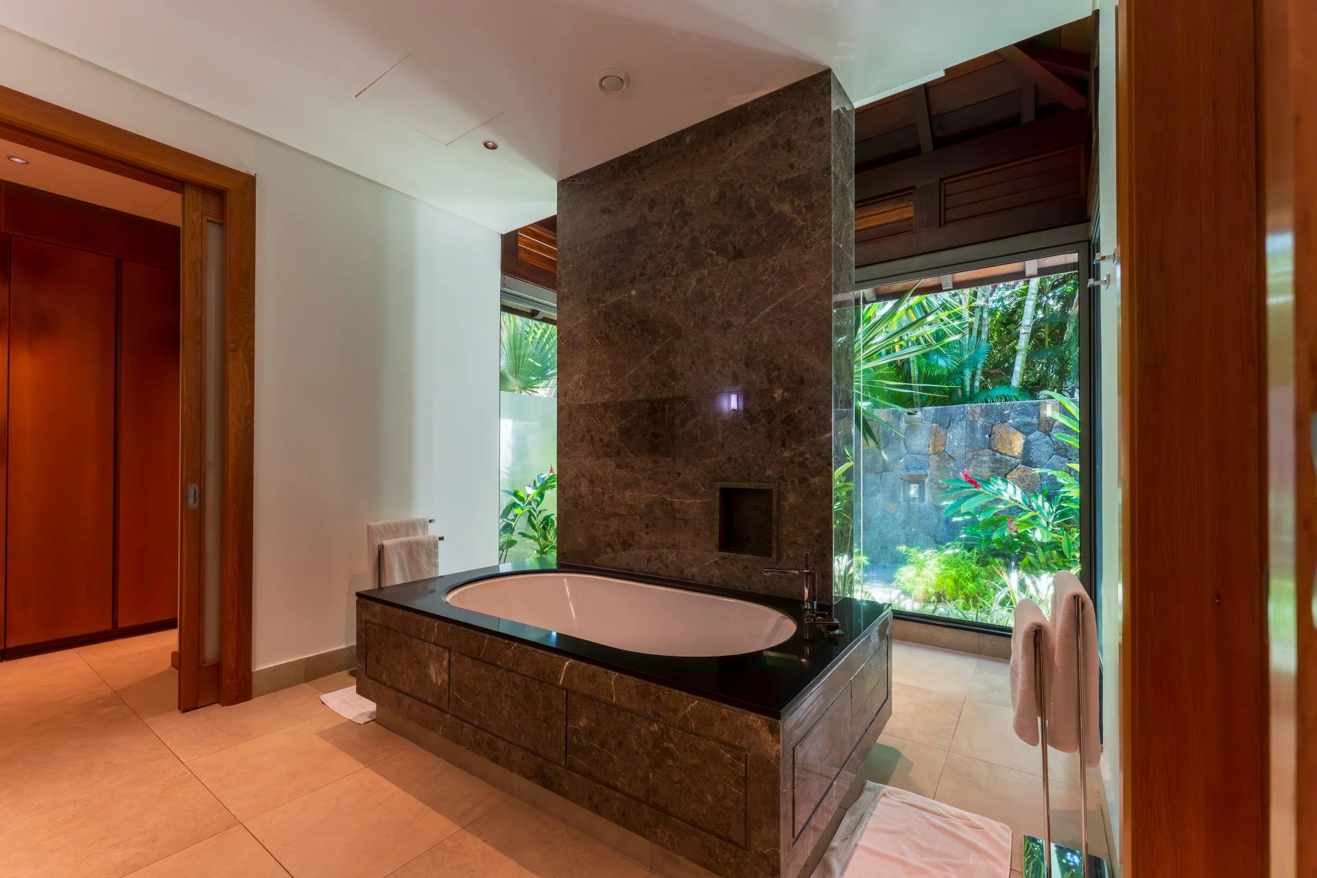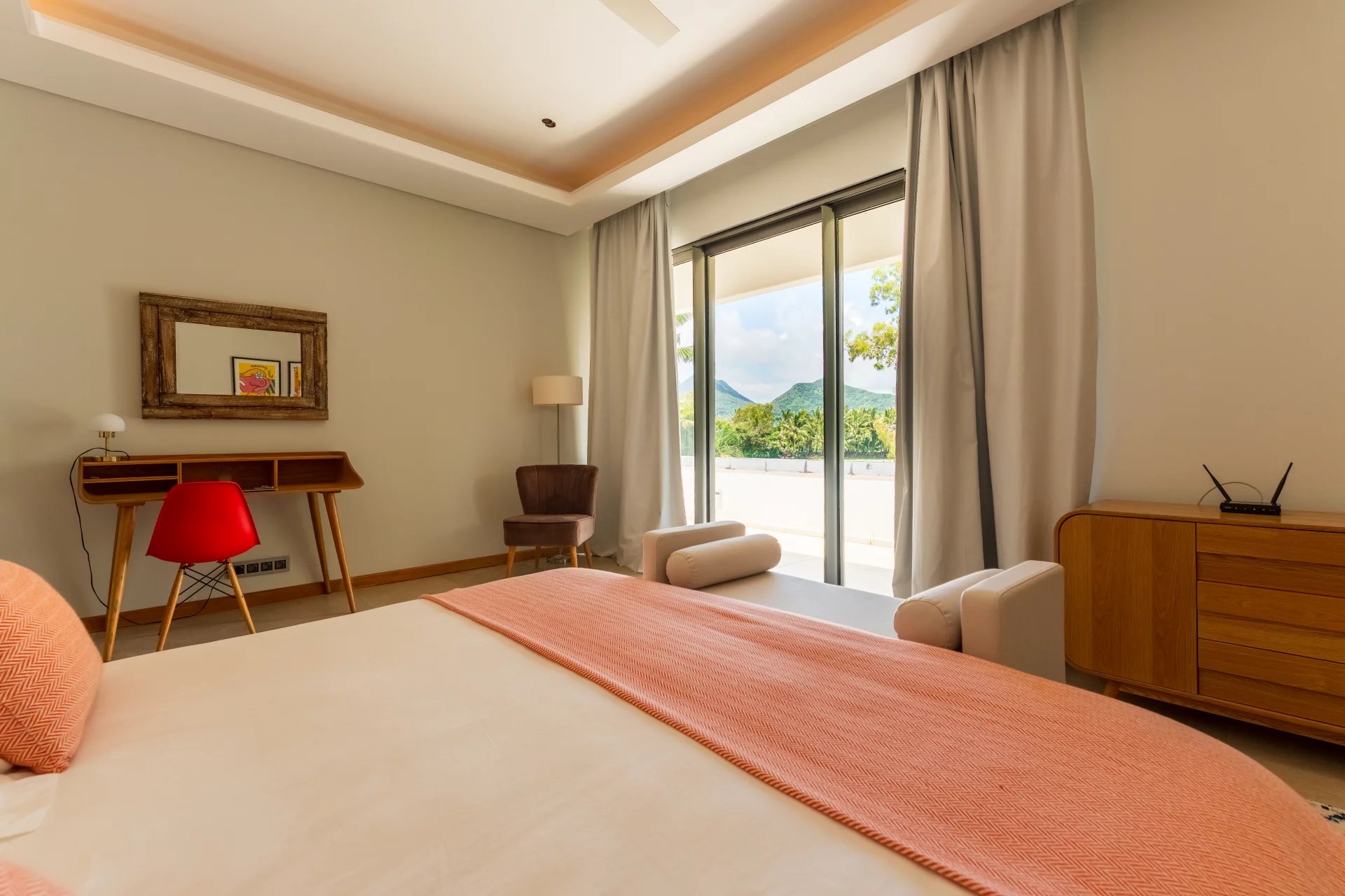 Upstairs, four exquisite en-suite bedrooms each offer a private bathroom and access to wide balconies, with calming views over the garden and lush surroundings of the resort.