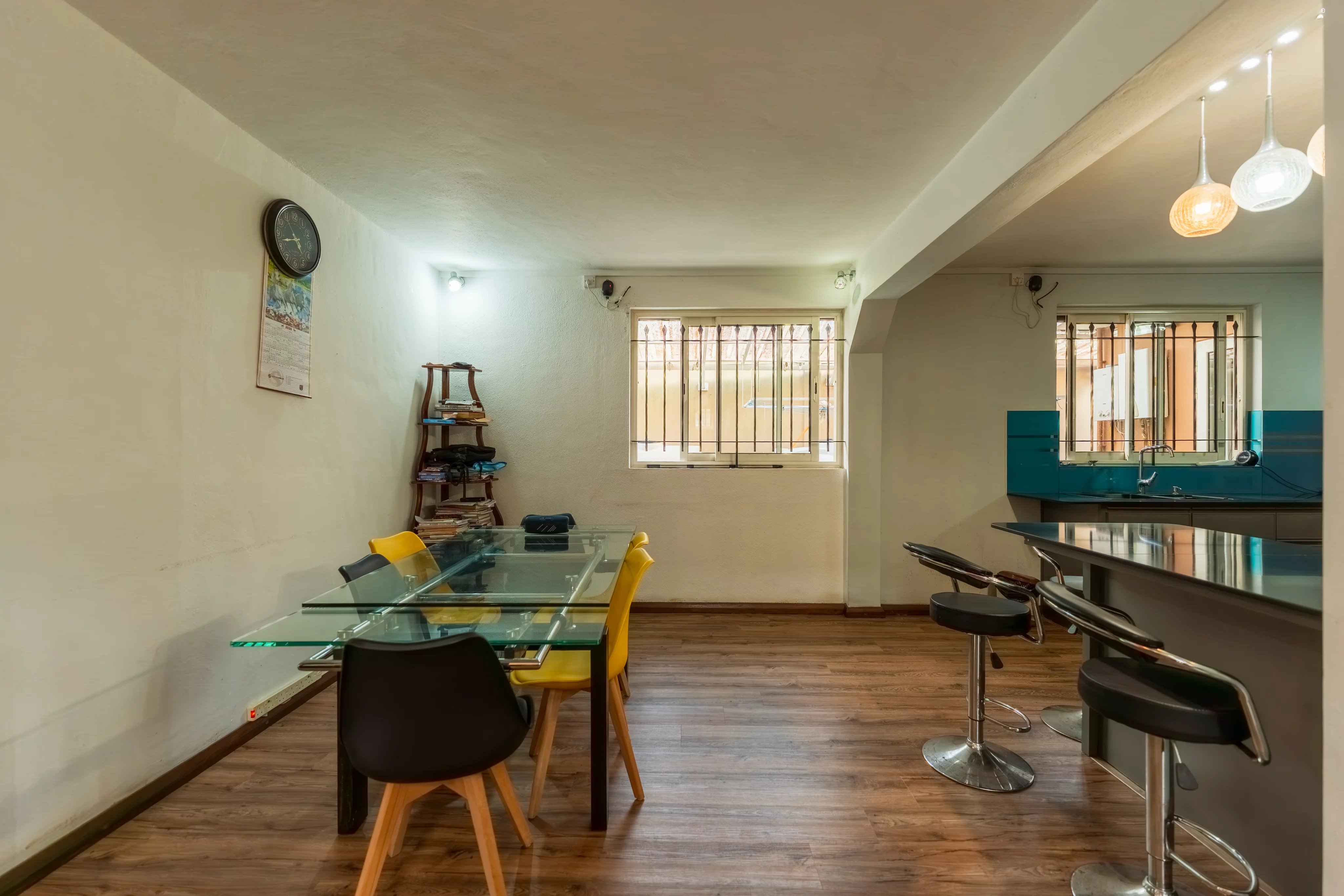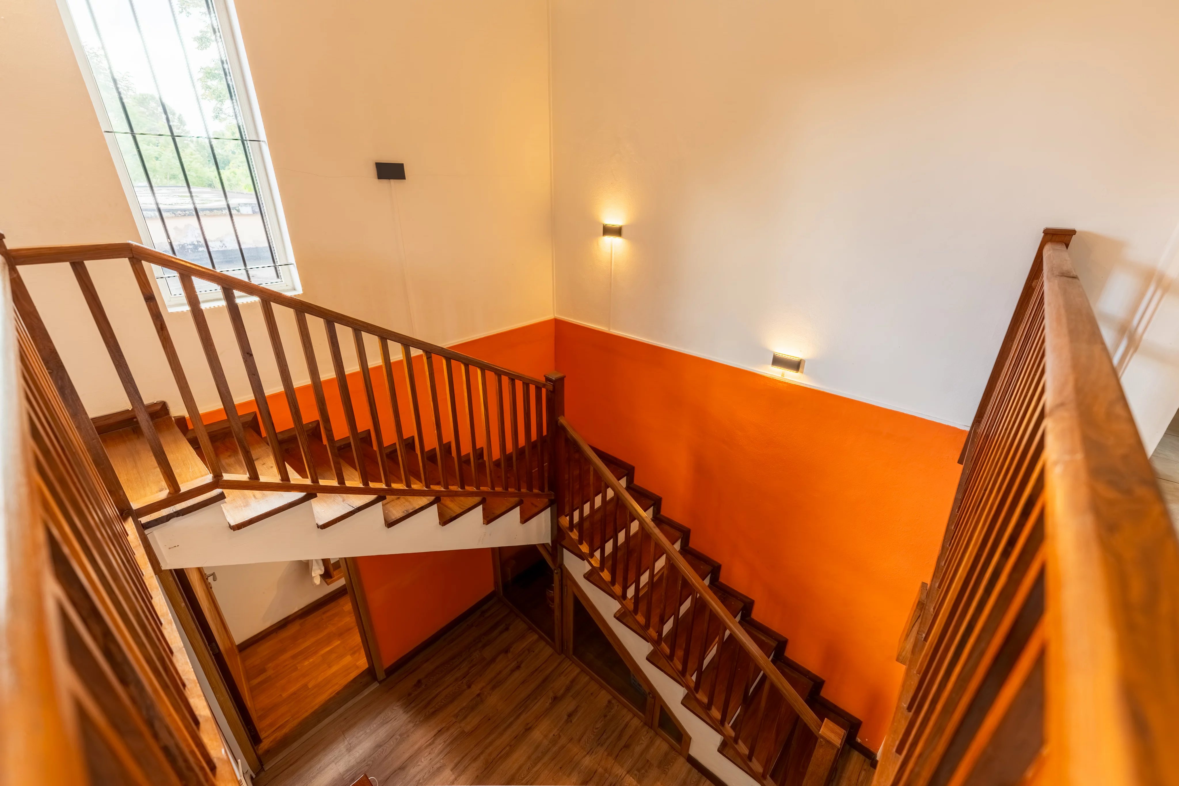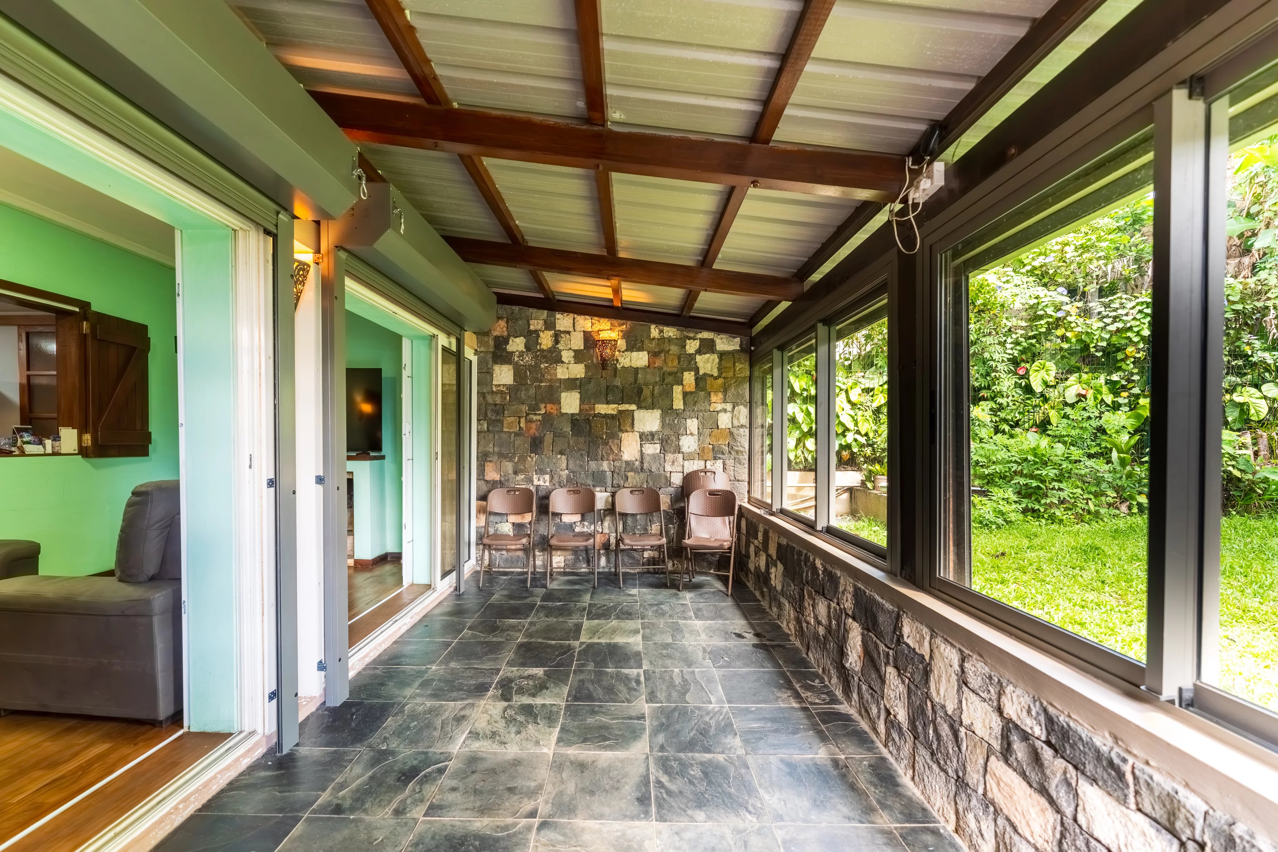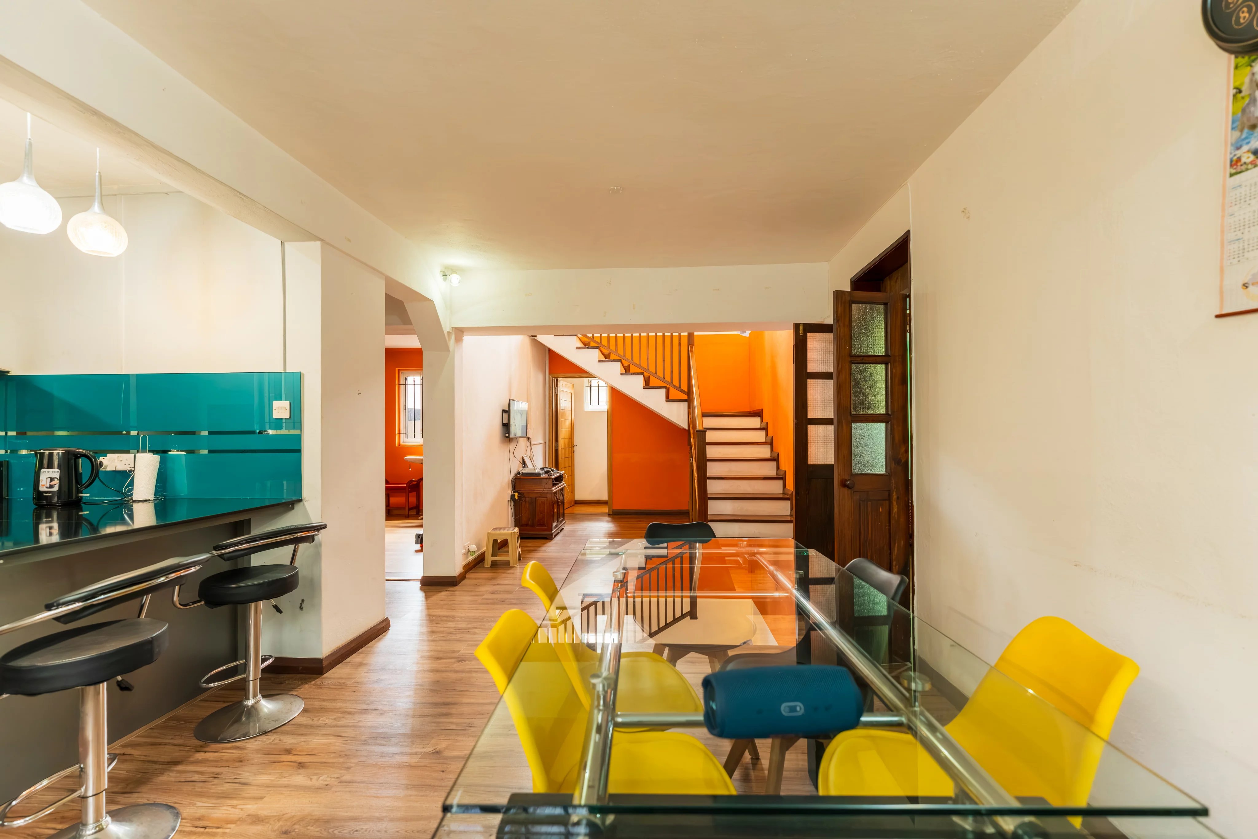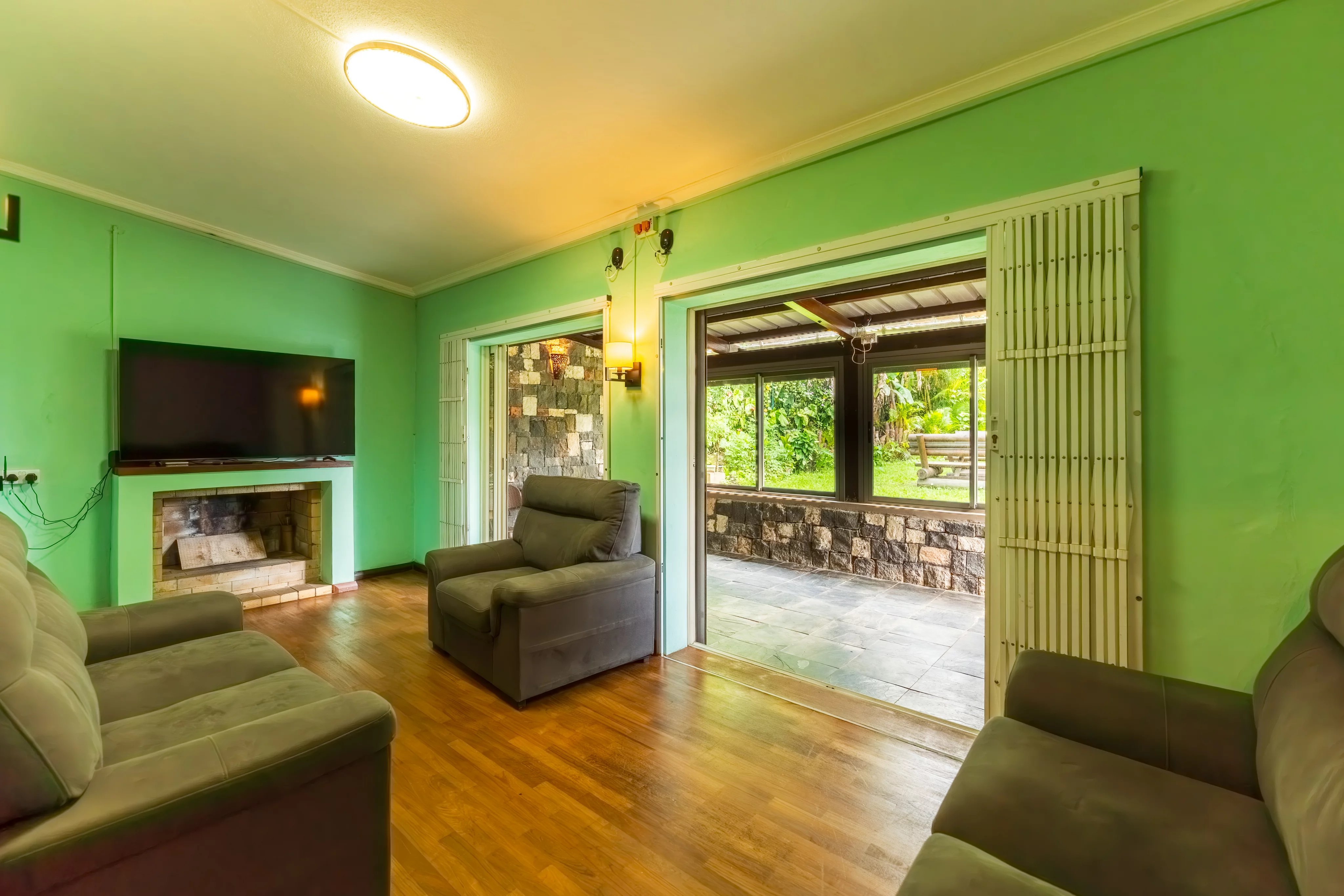 The ground floor features a welcoming living area with an open-plan kitchen, connecting to a TV lounge on one side and a dining area on the other. The living room, equipped with a fireplace, creates a cosy and inviting atmosphere for winters. A charming veranda with stone finishes adds a touch of refined rustic style.