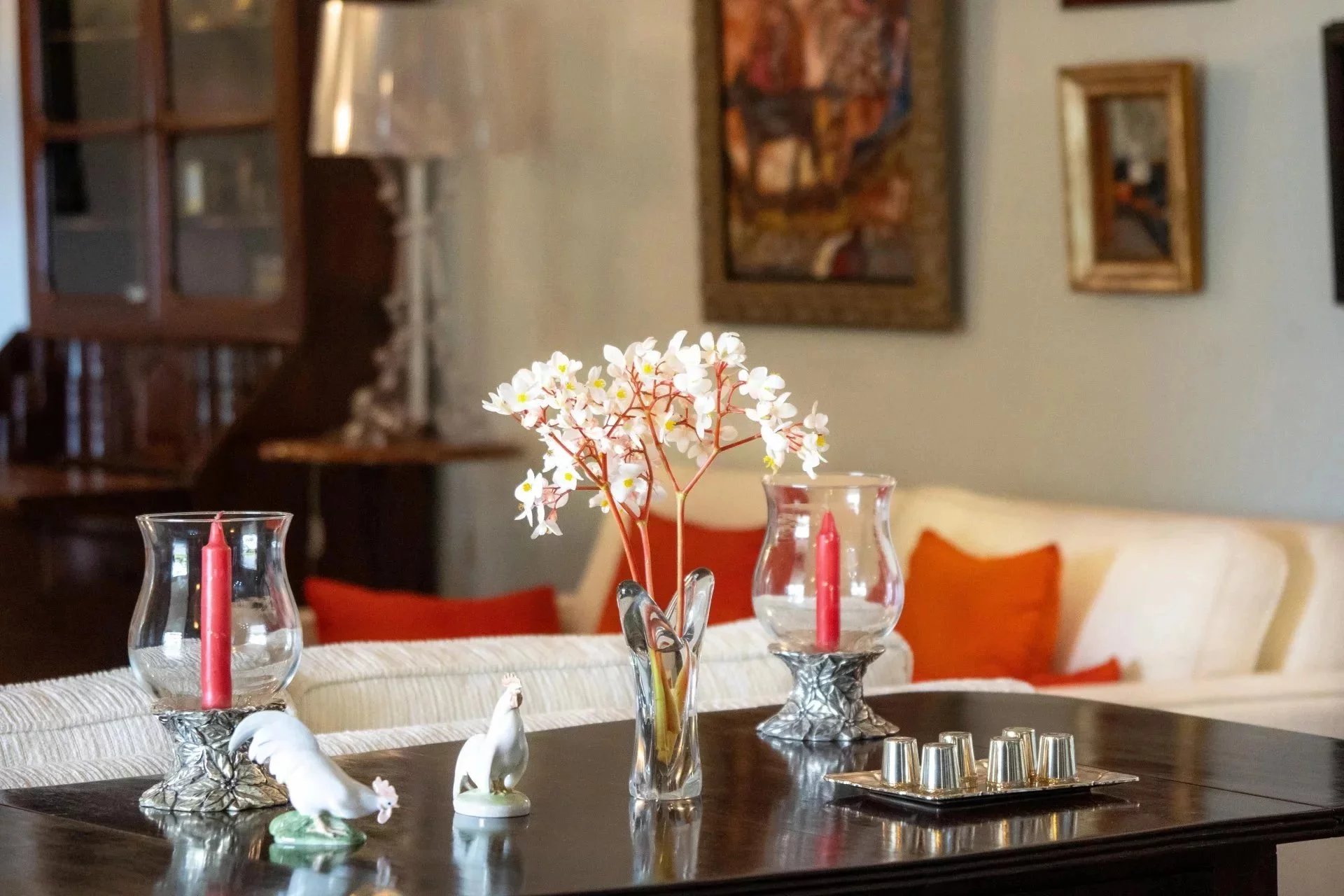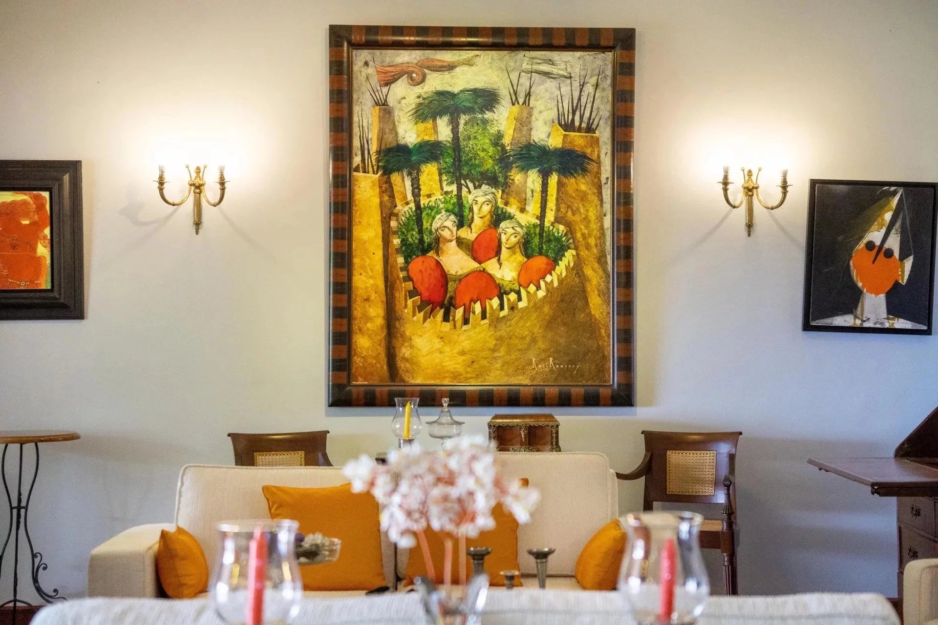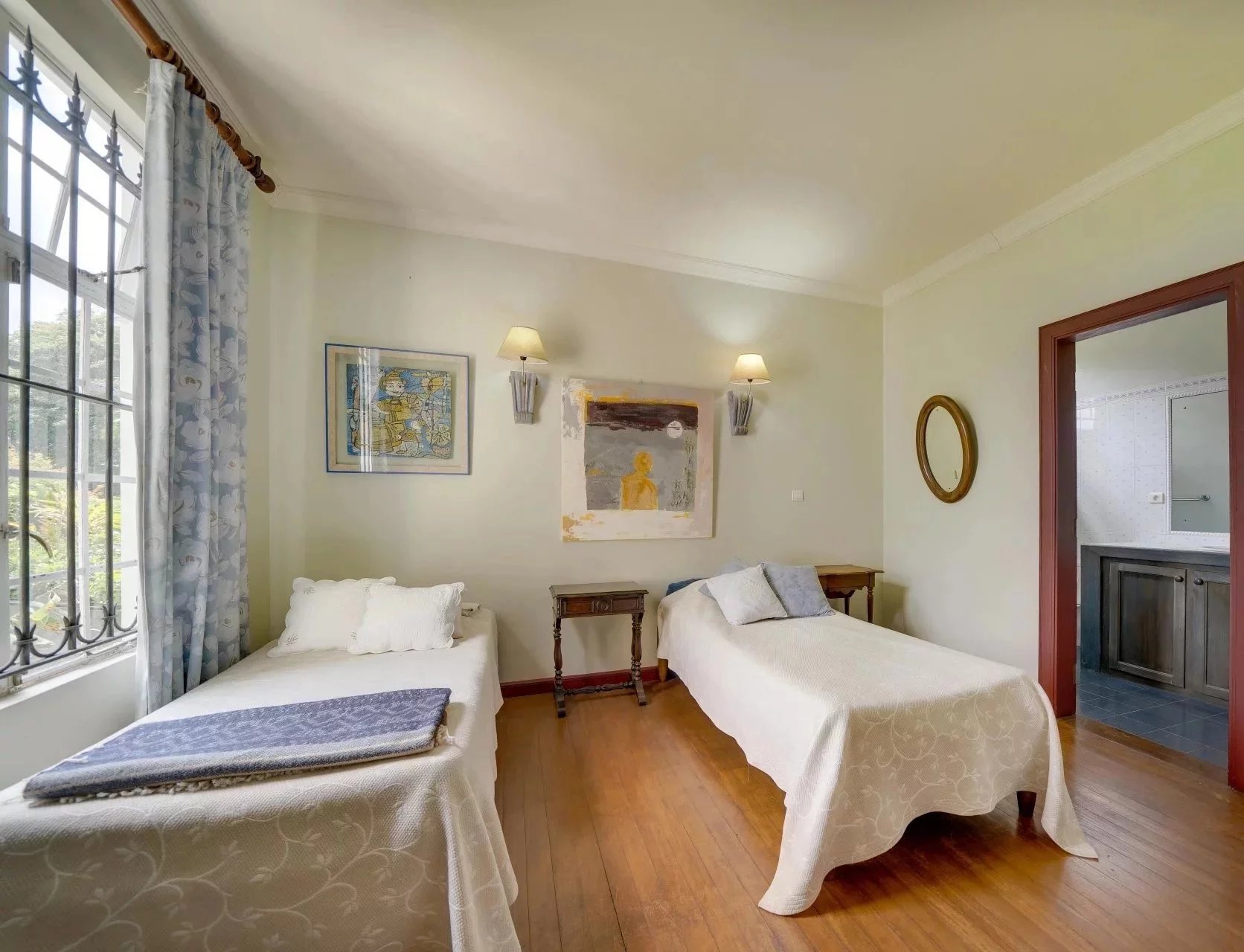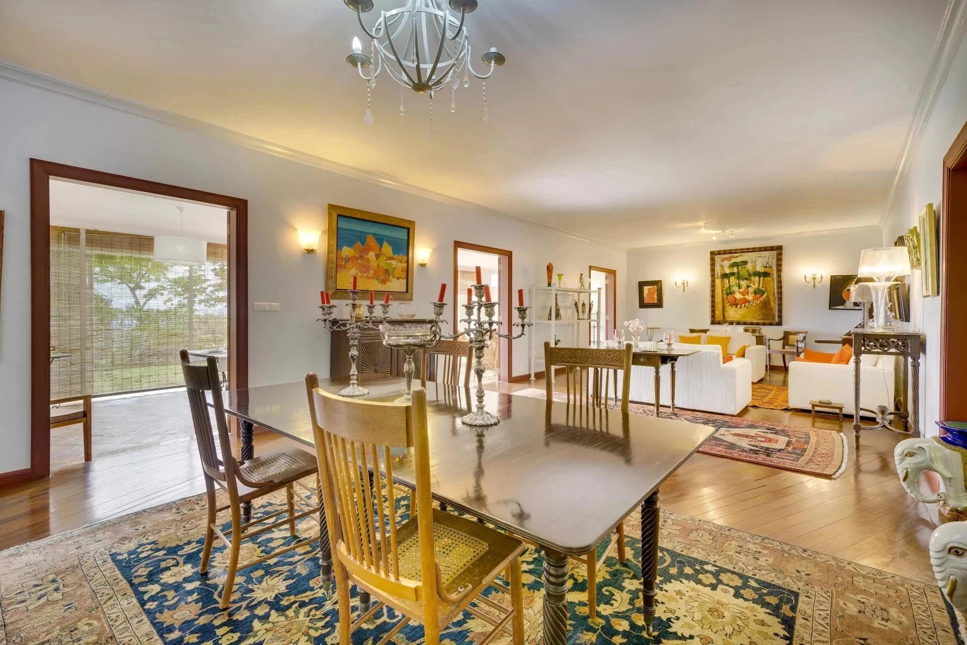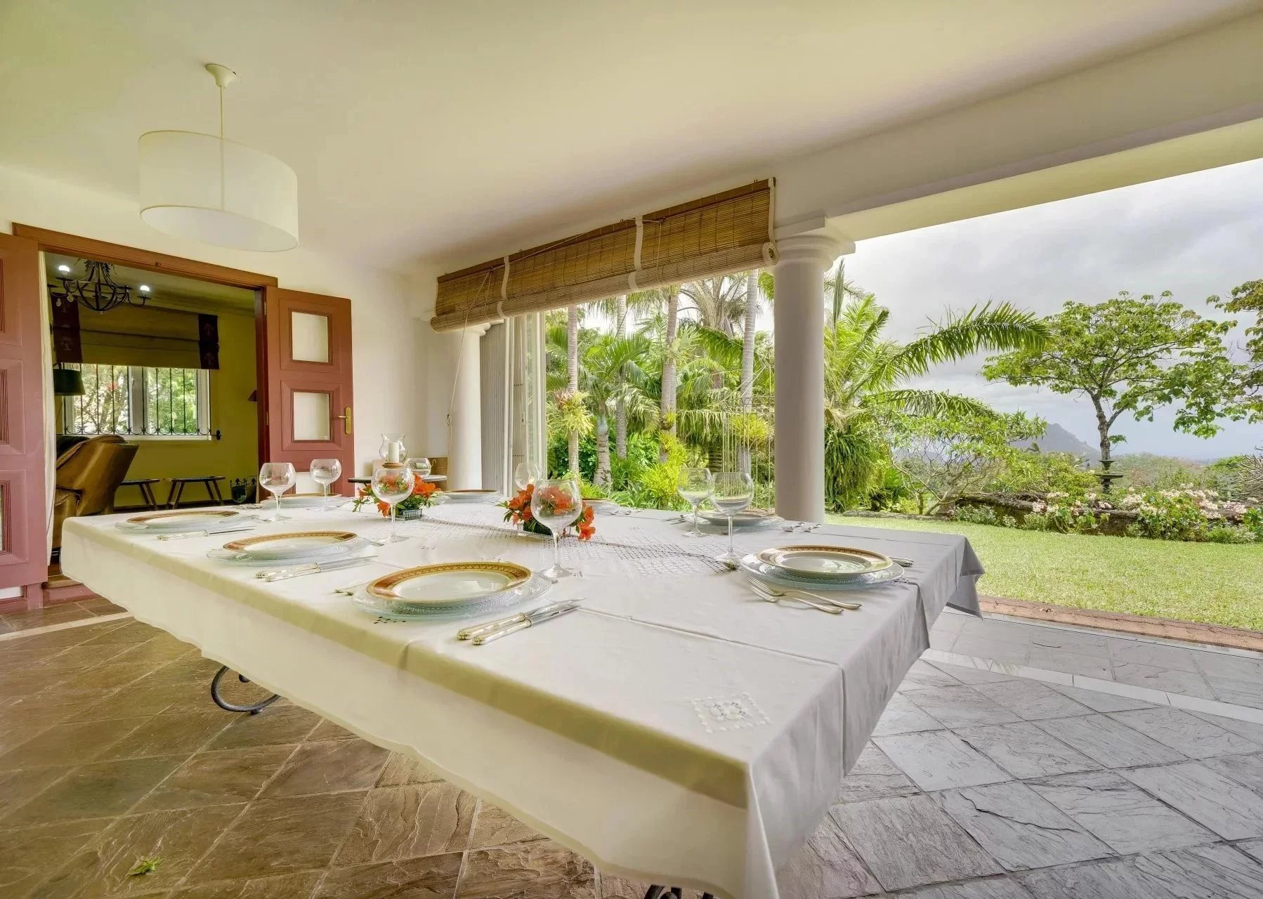 This hall leads to the different living areas: straight ahead we have the dining room and the lounge which opens onto a beautiful veranda overlooking the garden. The TV room with its fireplace is also accessible from the veranda.