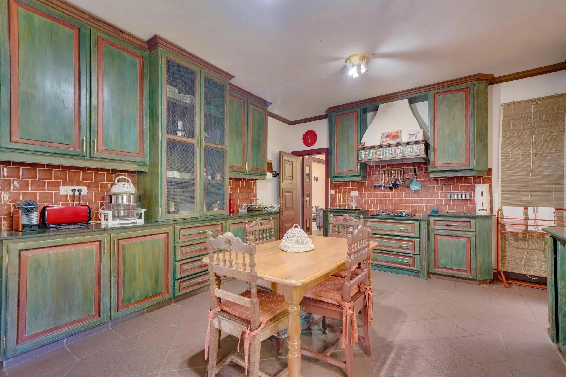 On the left we have the kitchen with its convivial table in the centre, as well as a beautiful wooden staircase that leads to the attic and the basement.