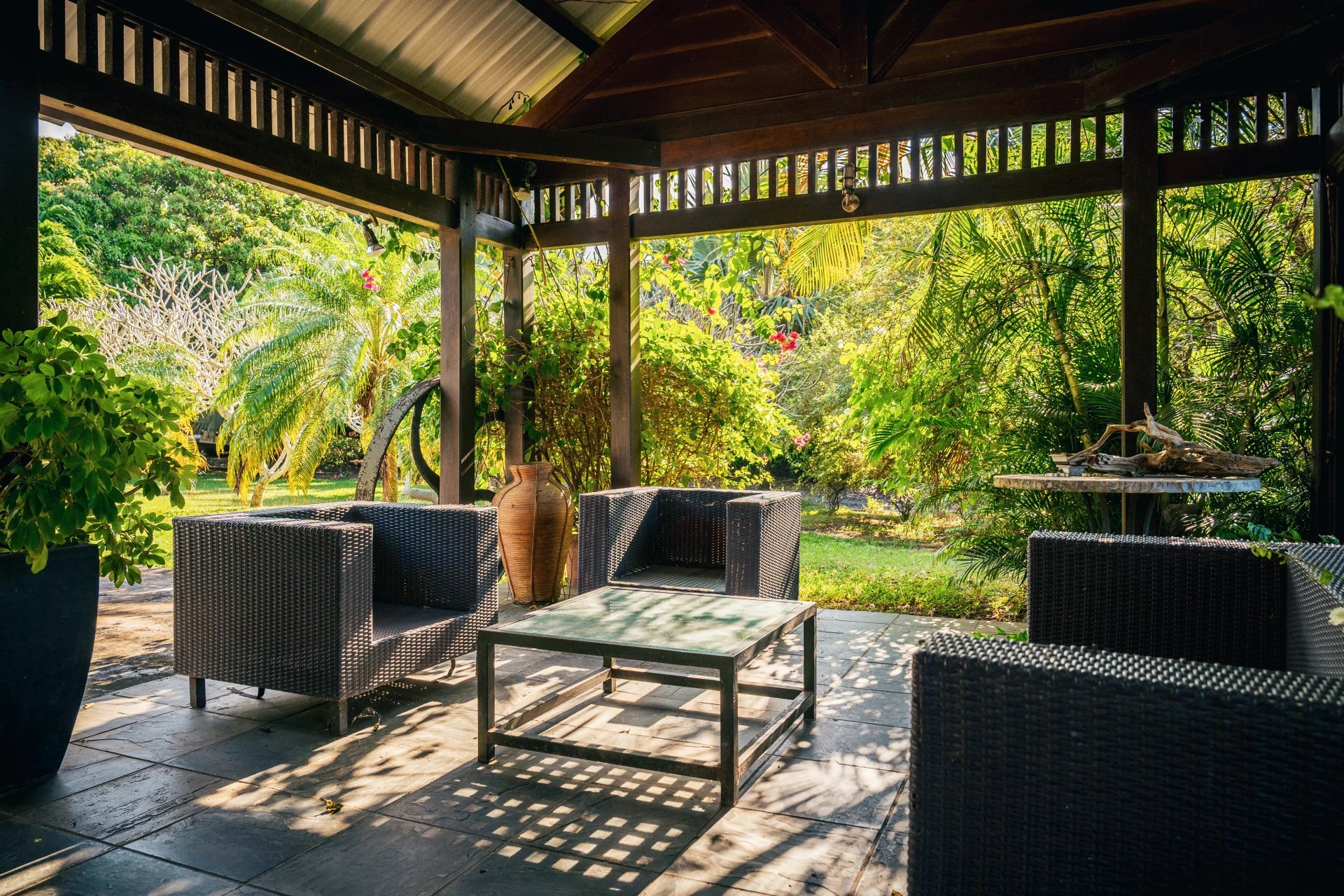 Located on a 10,000 m² plot of land, this exceptional 446 m² property features a beautiful varangue opening onto the swimming pool and landscaped garden.