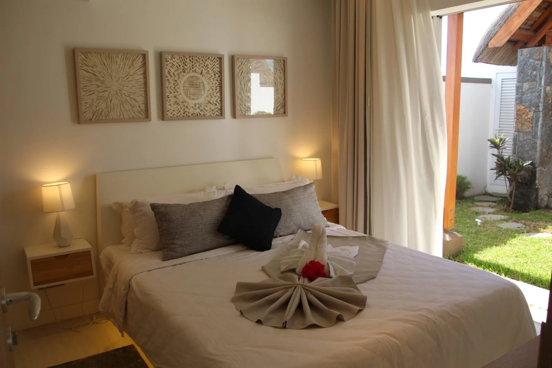 Situated within a secure complex that features a spa and gym, this newly built villa in a contemporary style is perfectly located just 5 minutes from the center of Grand Baie, as well as nearby shops and restaurants. Tastefully furnished, comfortable, and modern, this villa includes an American-style kitchen, a living room, and a dining room. You will also find a spacious terrace with a swimming pool set in a charming tropical garden, along with a gazebo and outdoor storage space. The master bedroom features an en-suite bathroom and a dressing room that opens onto the garden, while the other two bedrooms share a bathroom.