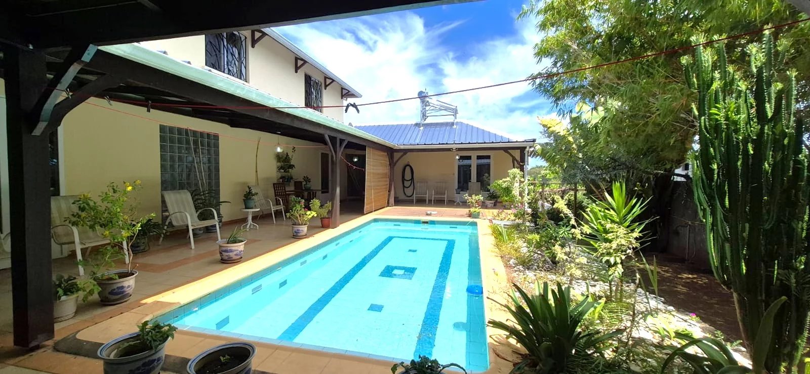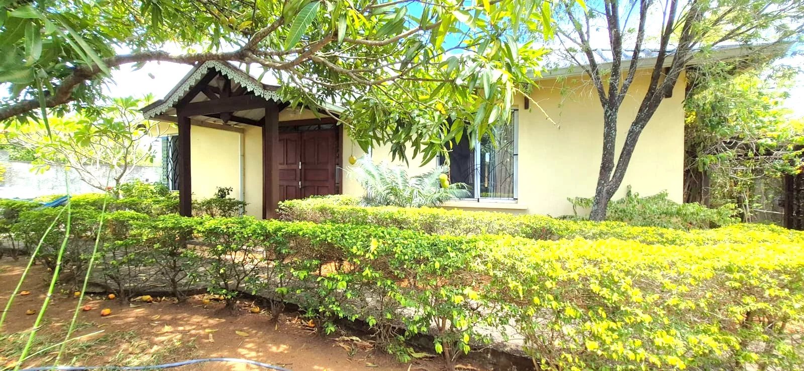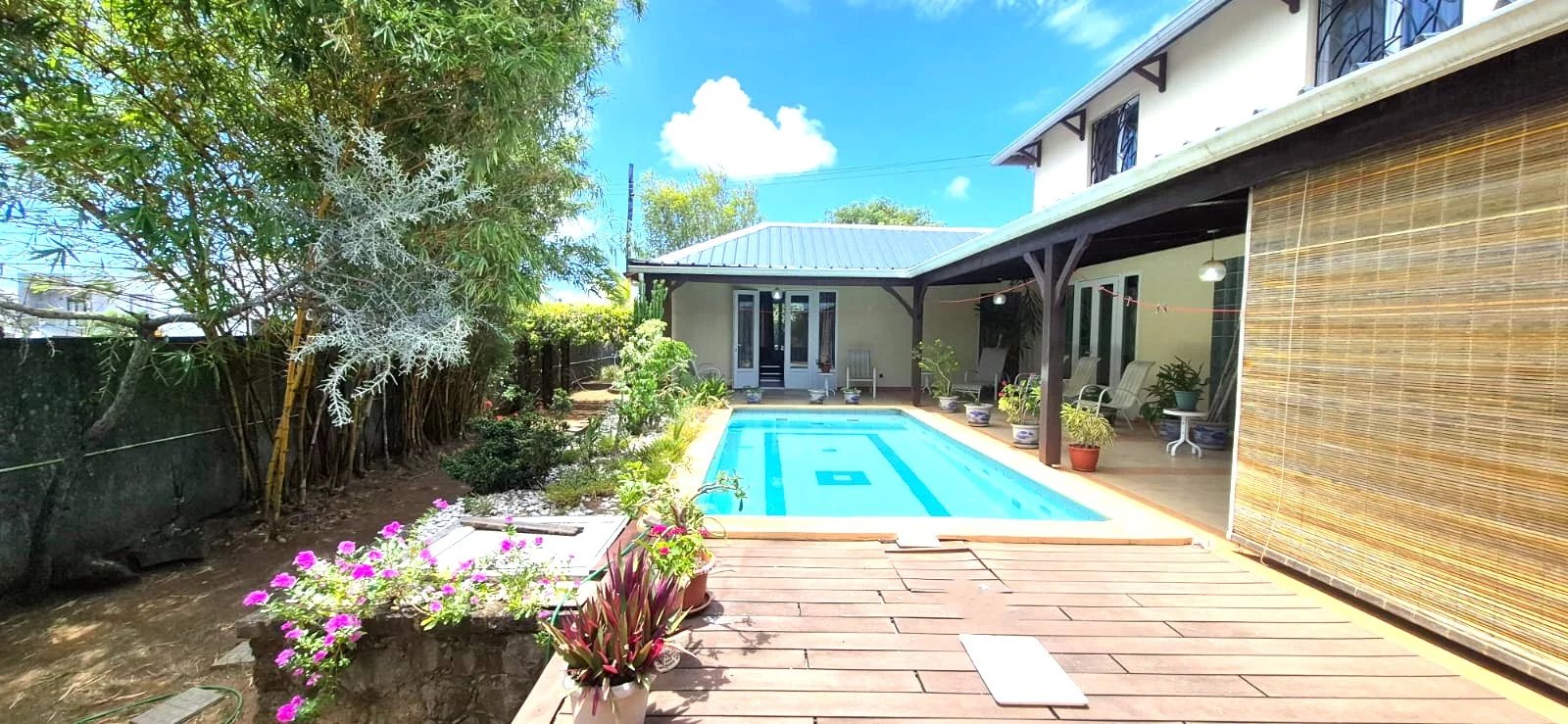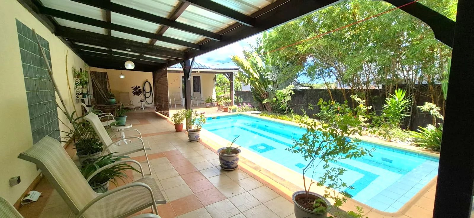 The lush tropical garden adds to the home's charm, featuring mature mango, banana, and granadilla trees, creating a peaceful and private outdoor setting around the pool.