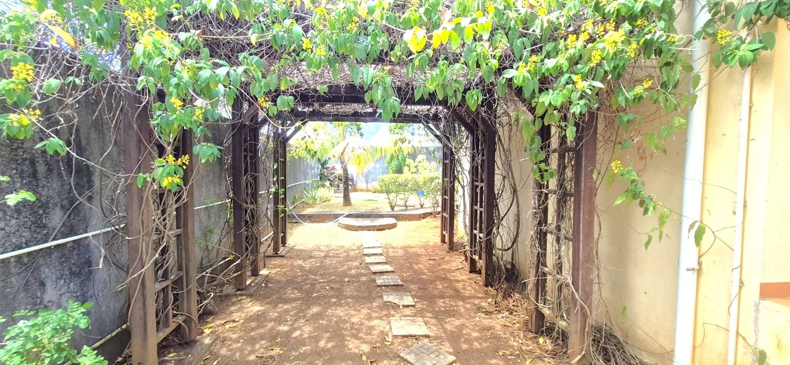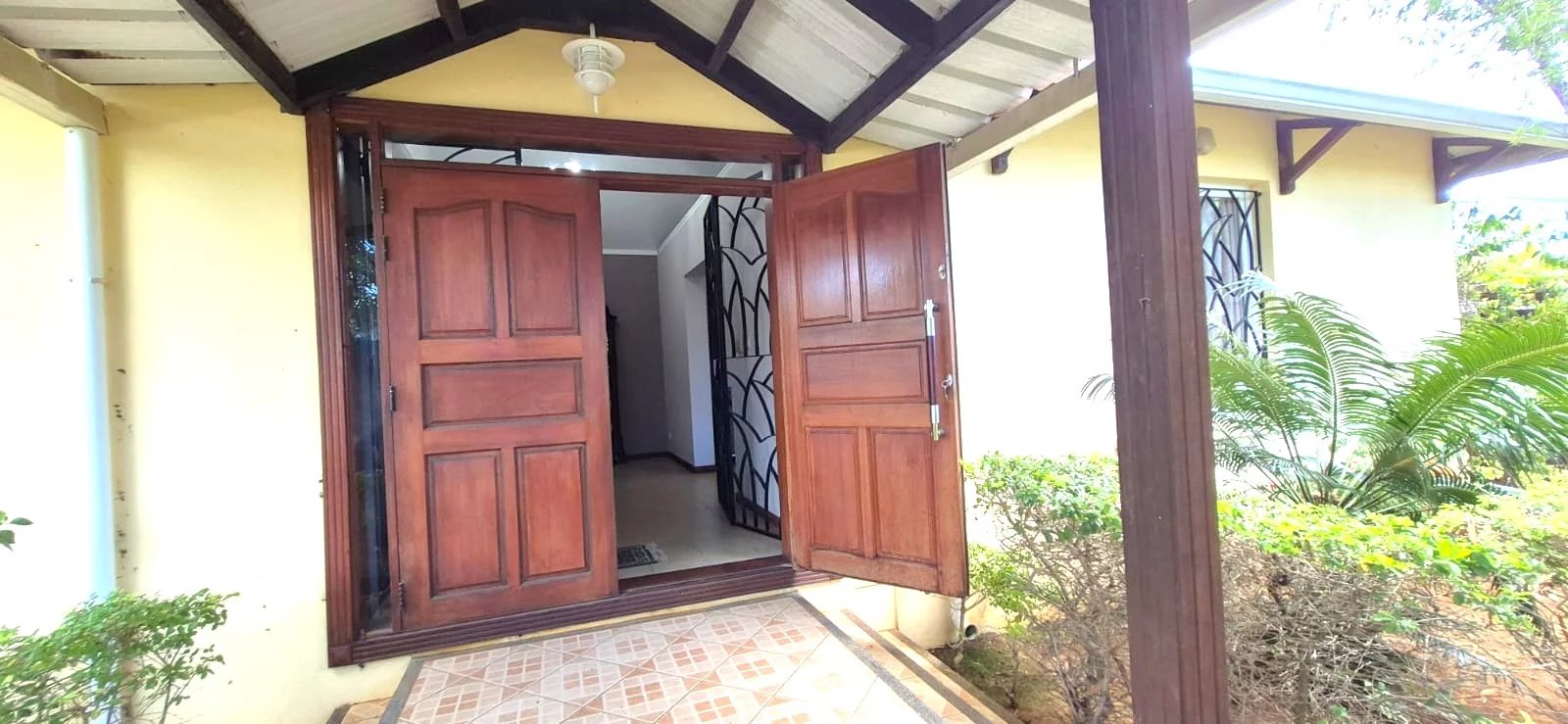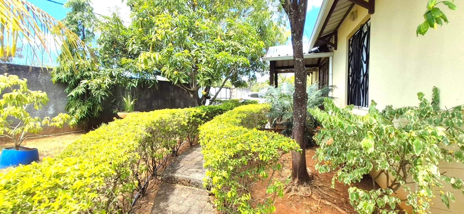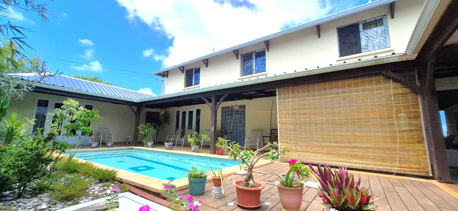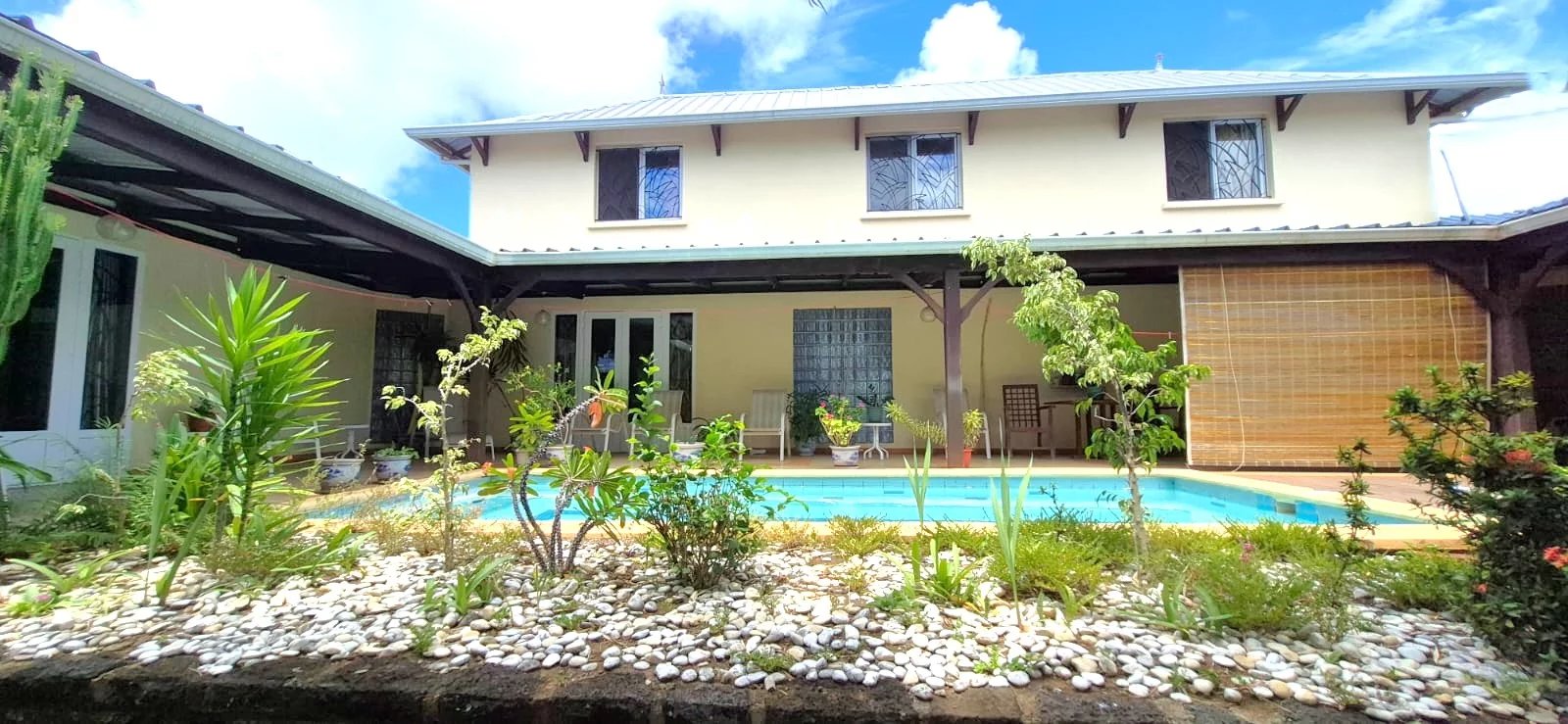 The lush tropical garden adds to the home's charm, featuring mature mango, banana, and granadilla trees, creating a peaceful and private outdoor setting around the pool.