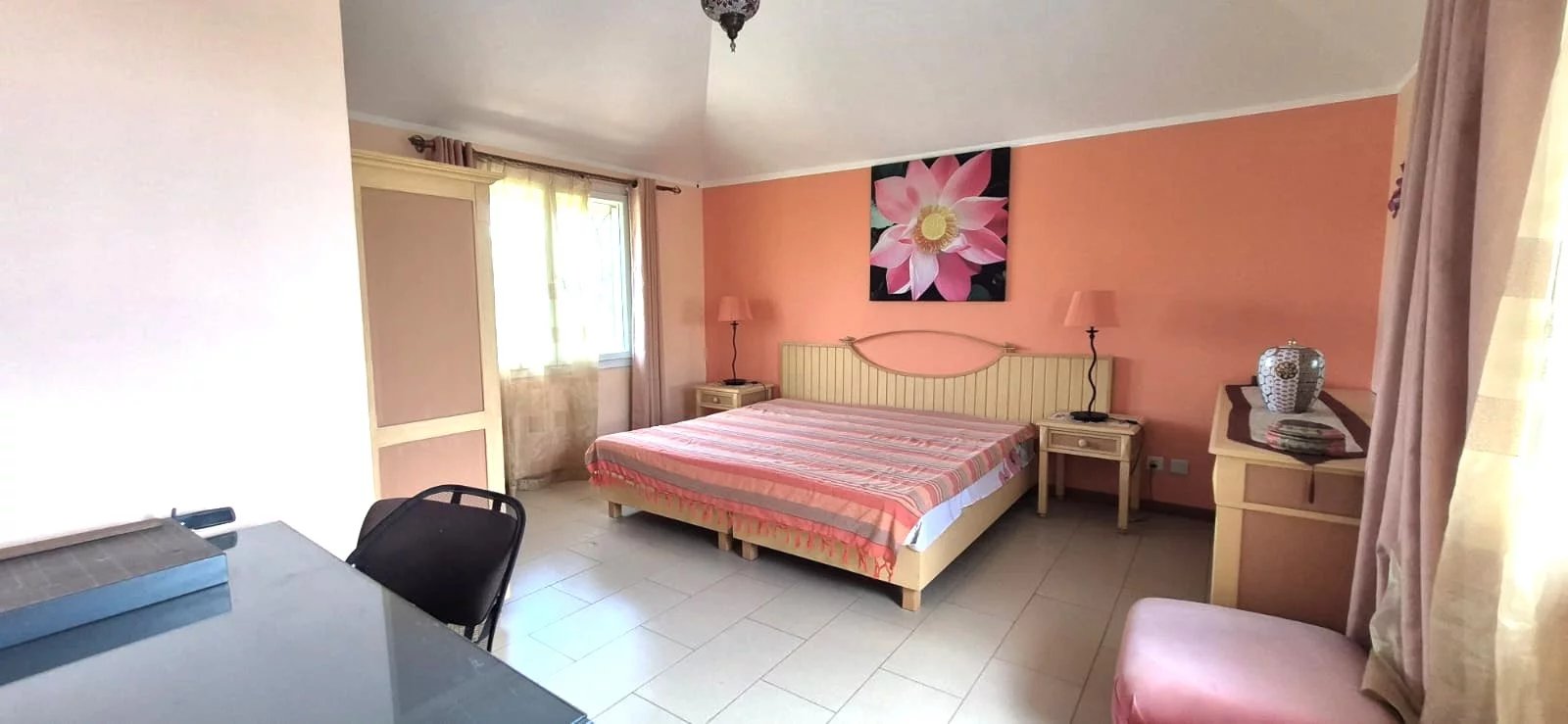 The ground-floor bedroom provides a private retreat with its own en-suite bathroom and walk-in closet, and enjoys direct access to the pool area, making it perfect for guests or convenient single-level living.