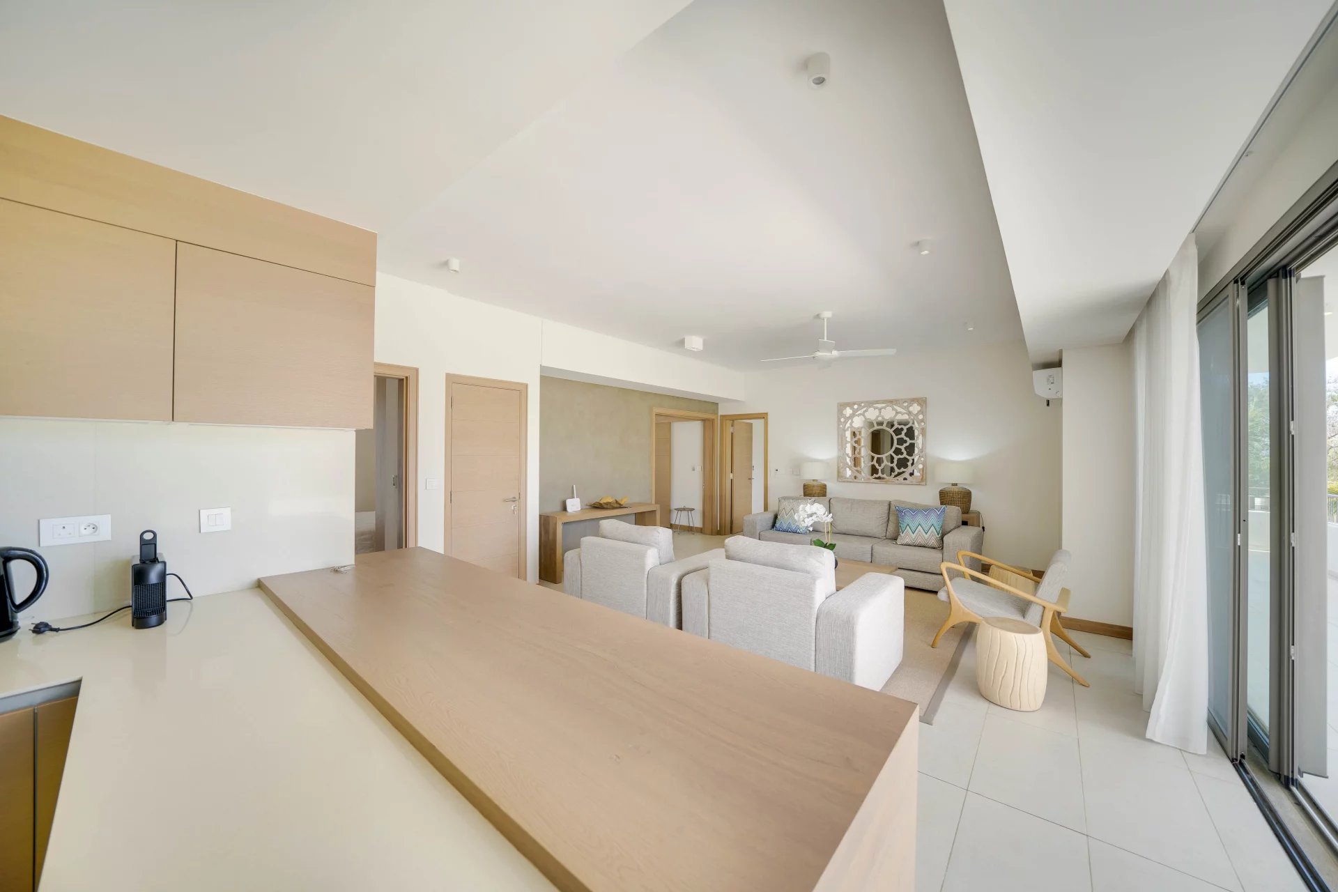 The bright and airy living area opens onto a magnificent panoramic terrace, seamlessly extending from the open-plan kitchen and elegant lounge. The night area features three en-suite, air-conditioned bedrooms, ensuring comfort and privacy.