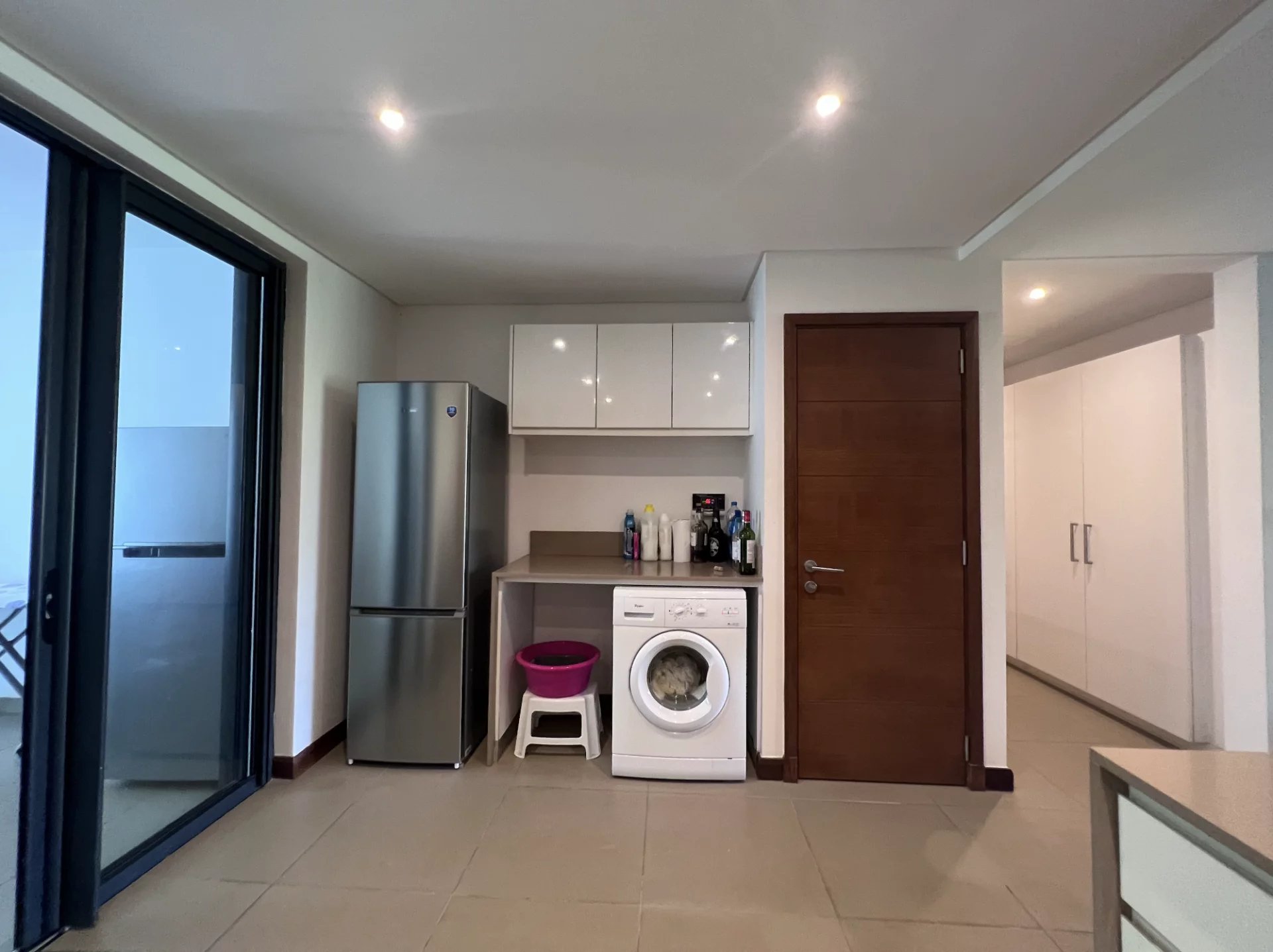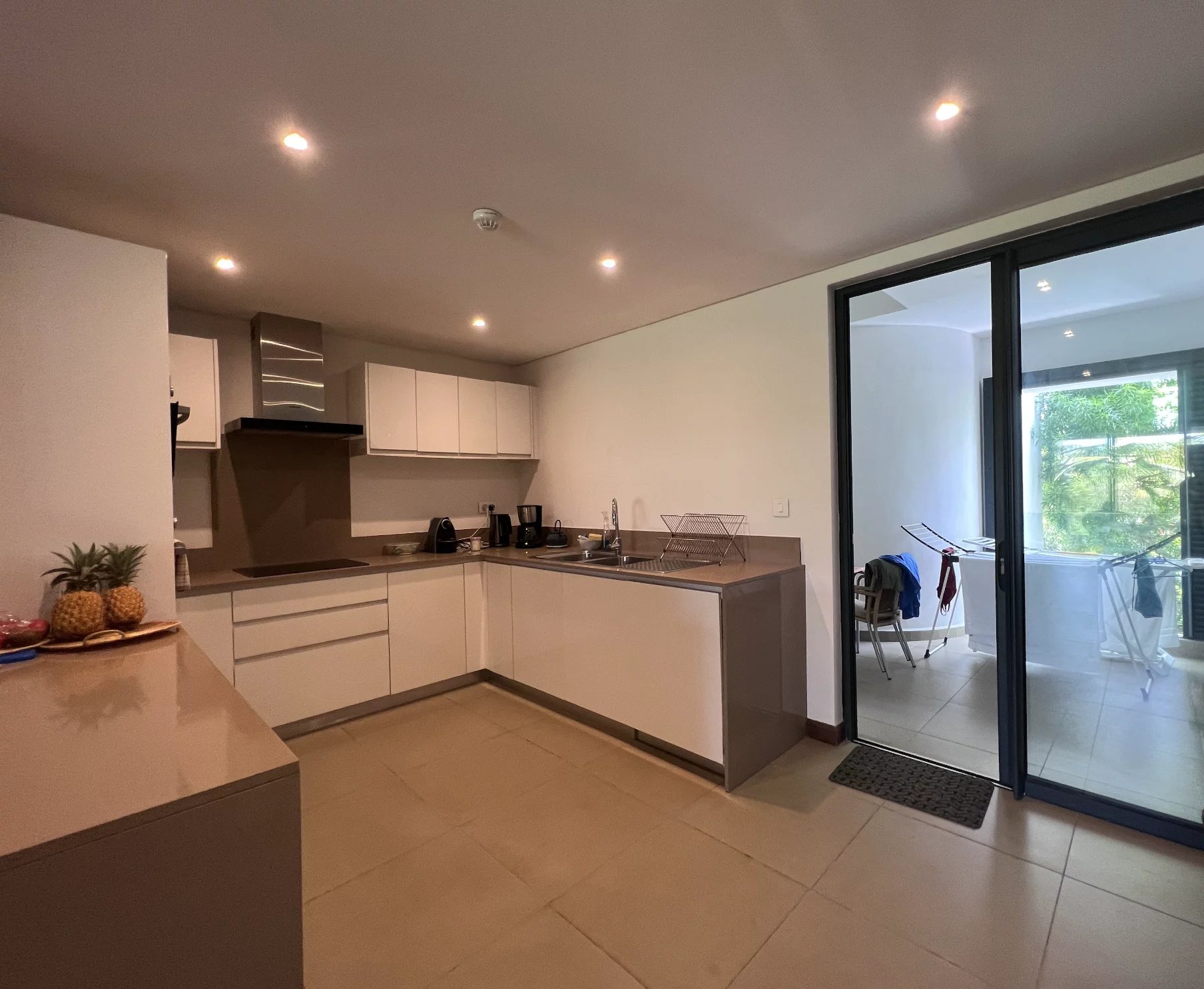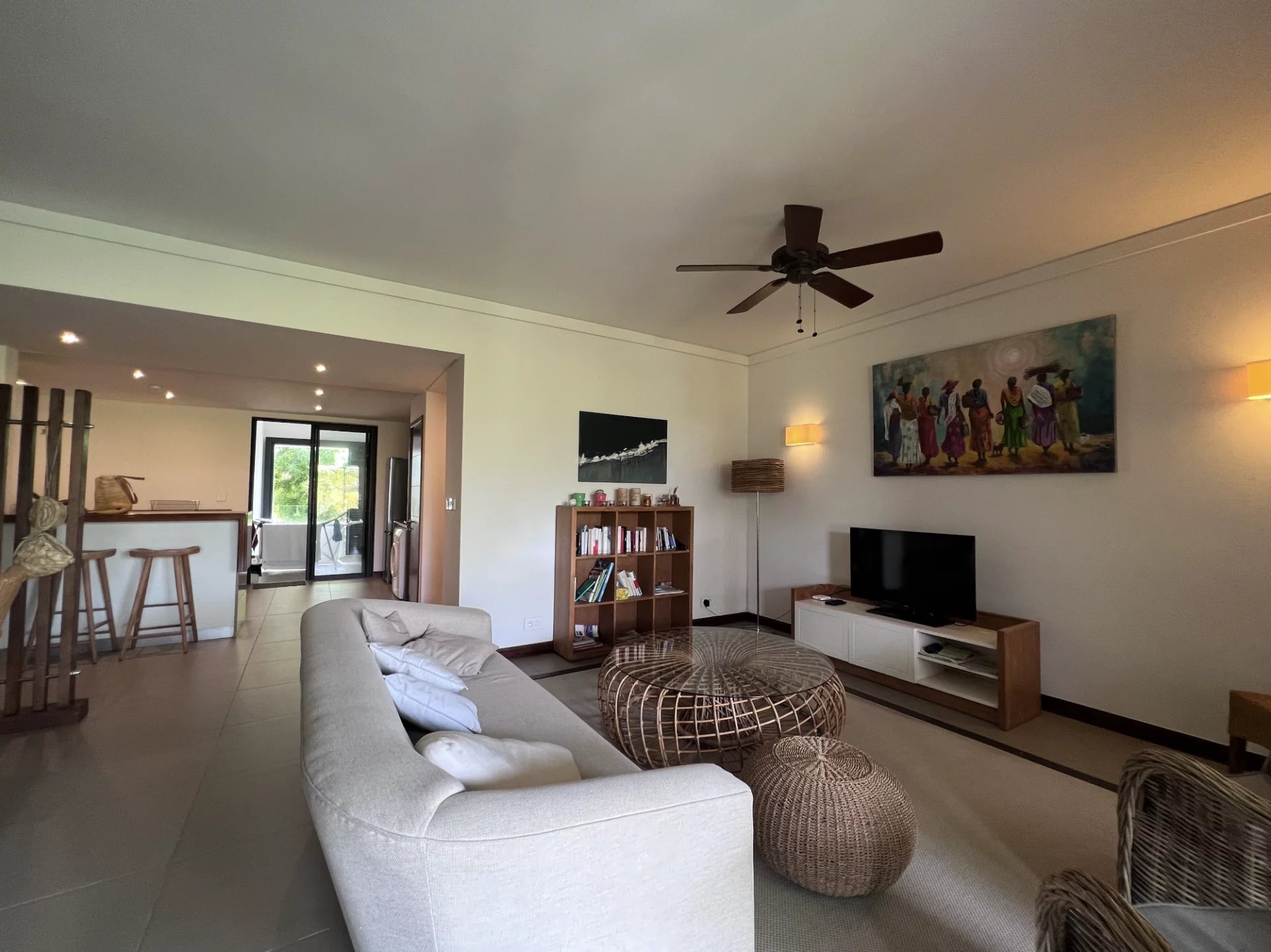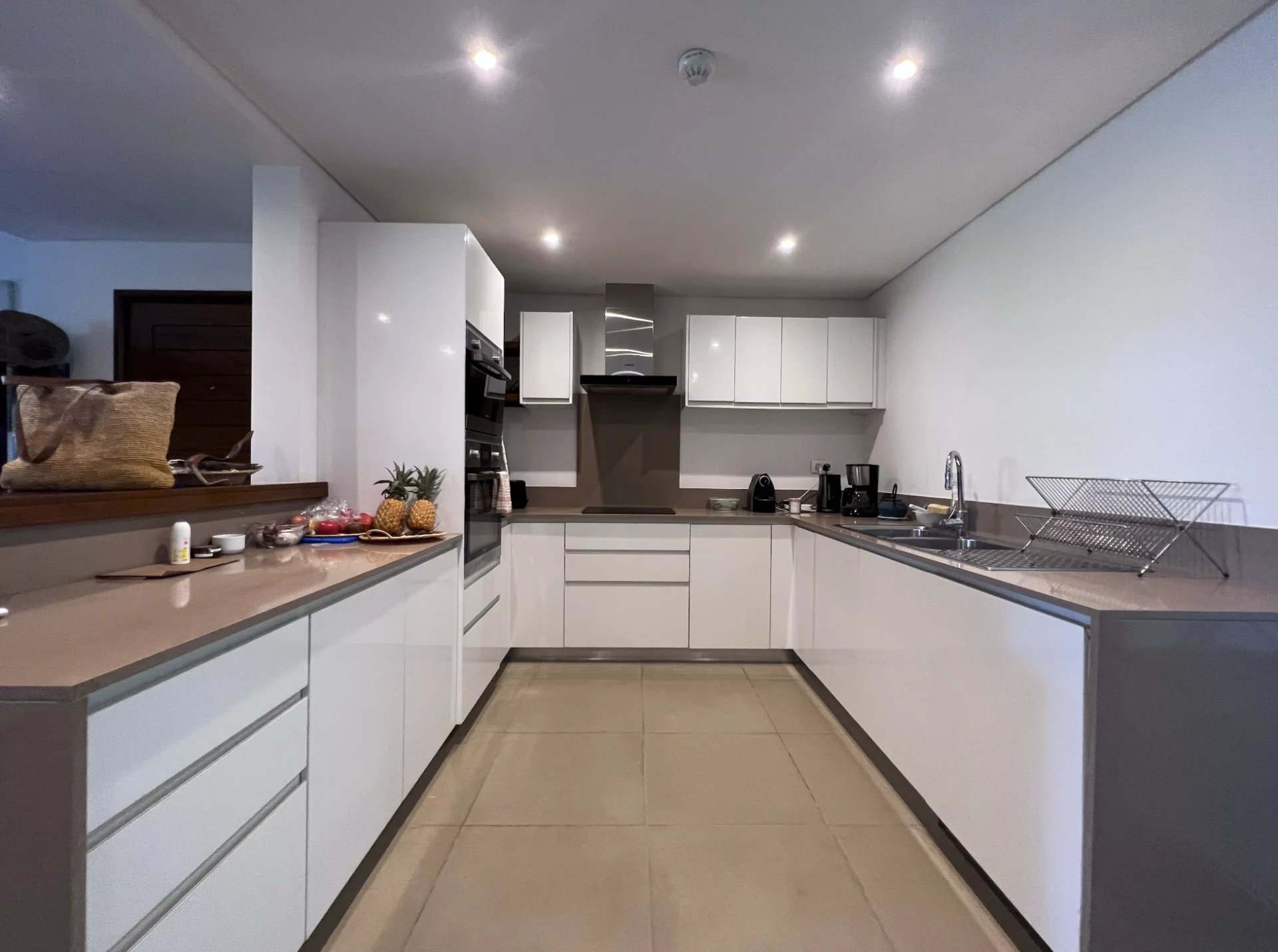 This 3-bedroom, 2-bathroom apartment offers a comfortable and functional living space. The open-plan kitchen opens onto the spacious living room, which leads to a terrace with a beautiful view of the garden and the distant sea. The master bedroom, with an en-suite bathroom, also has direct access to the terrace. The two other bedrooms share a shower room and separate toilets located in the corridor. The property also includes an enclosed veranda, two additional storage rooms, and a private parking space.