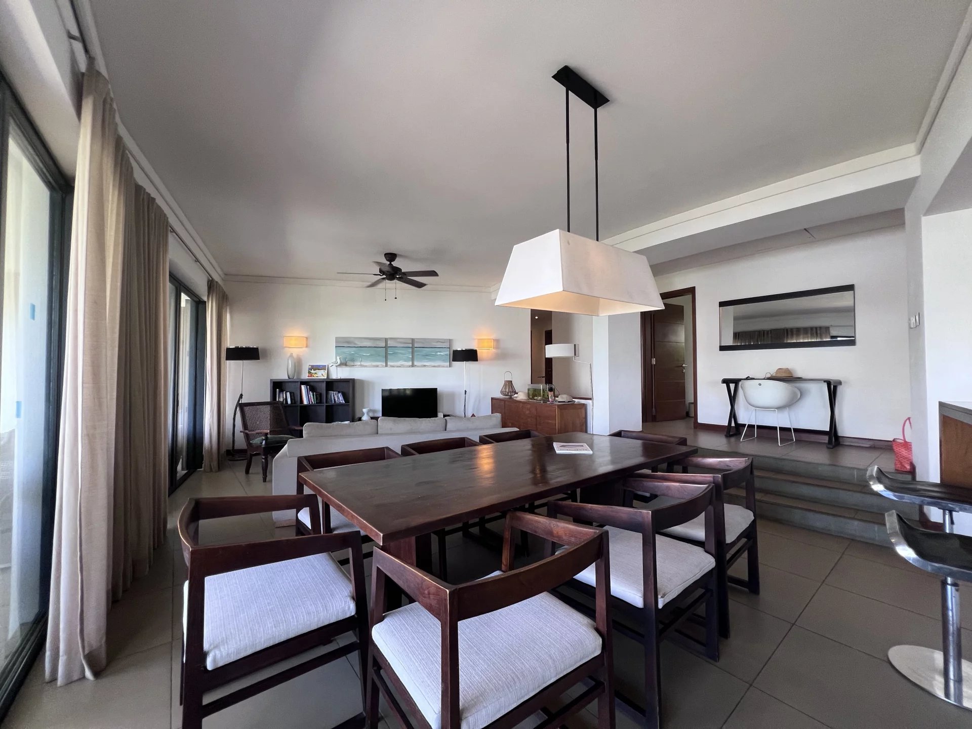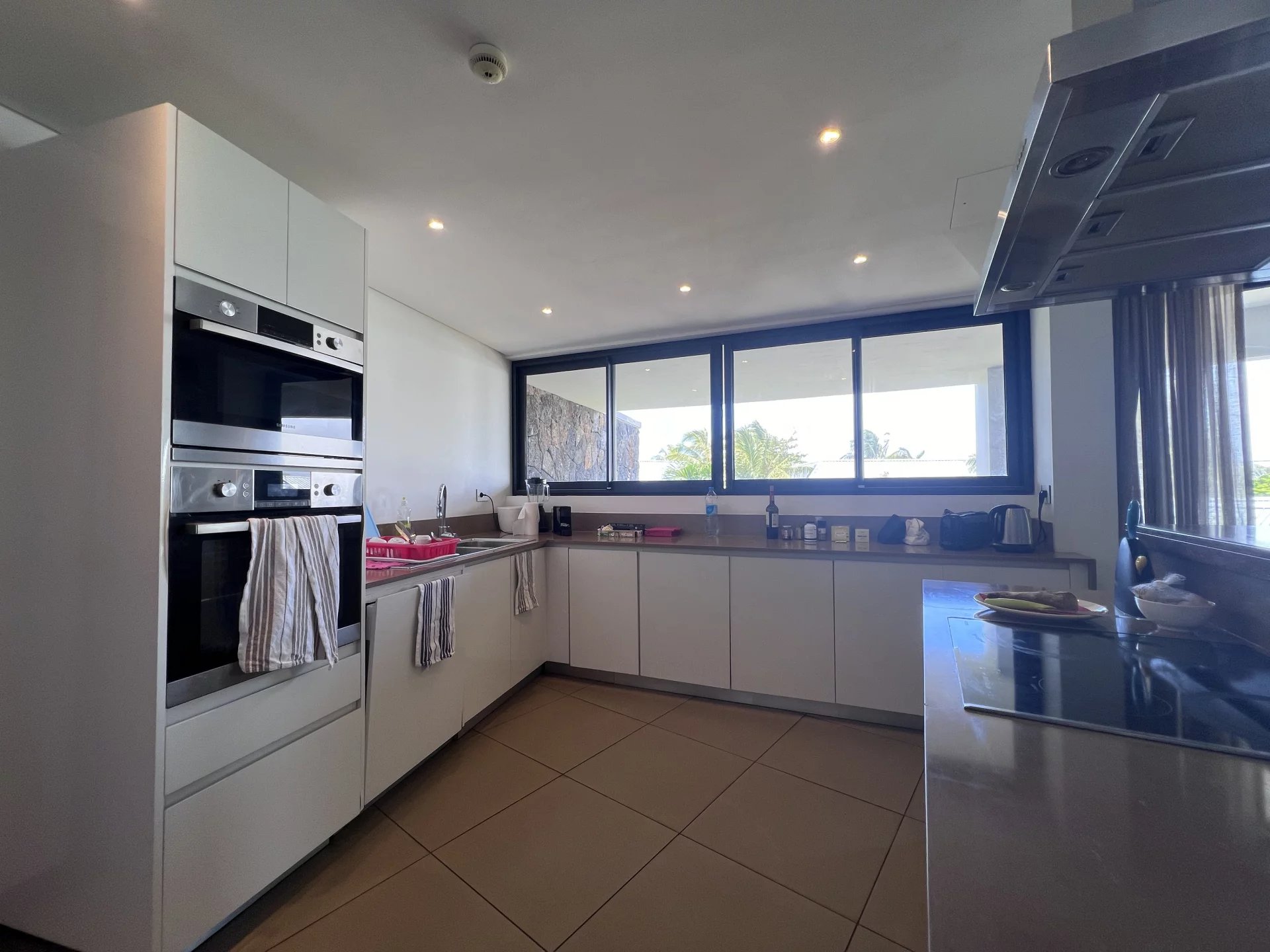 A fully equipped open-plan kitchen and an elegant dining area.