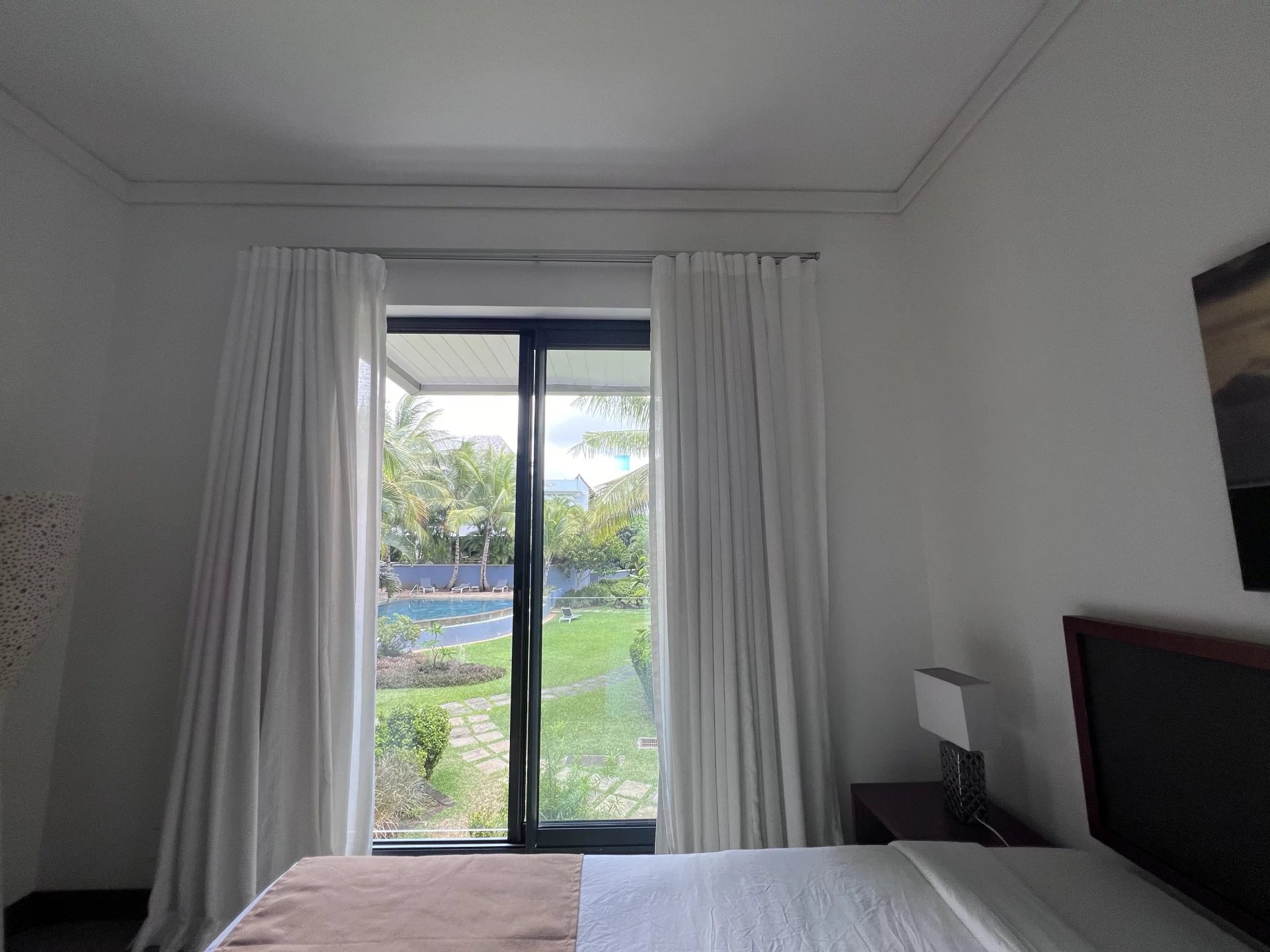 A spacious, light-filled living room opening onto a large terrace with a private pool.