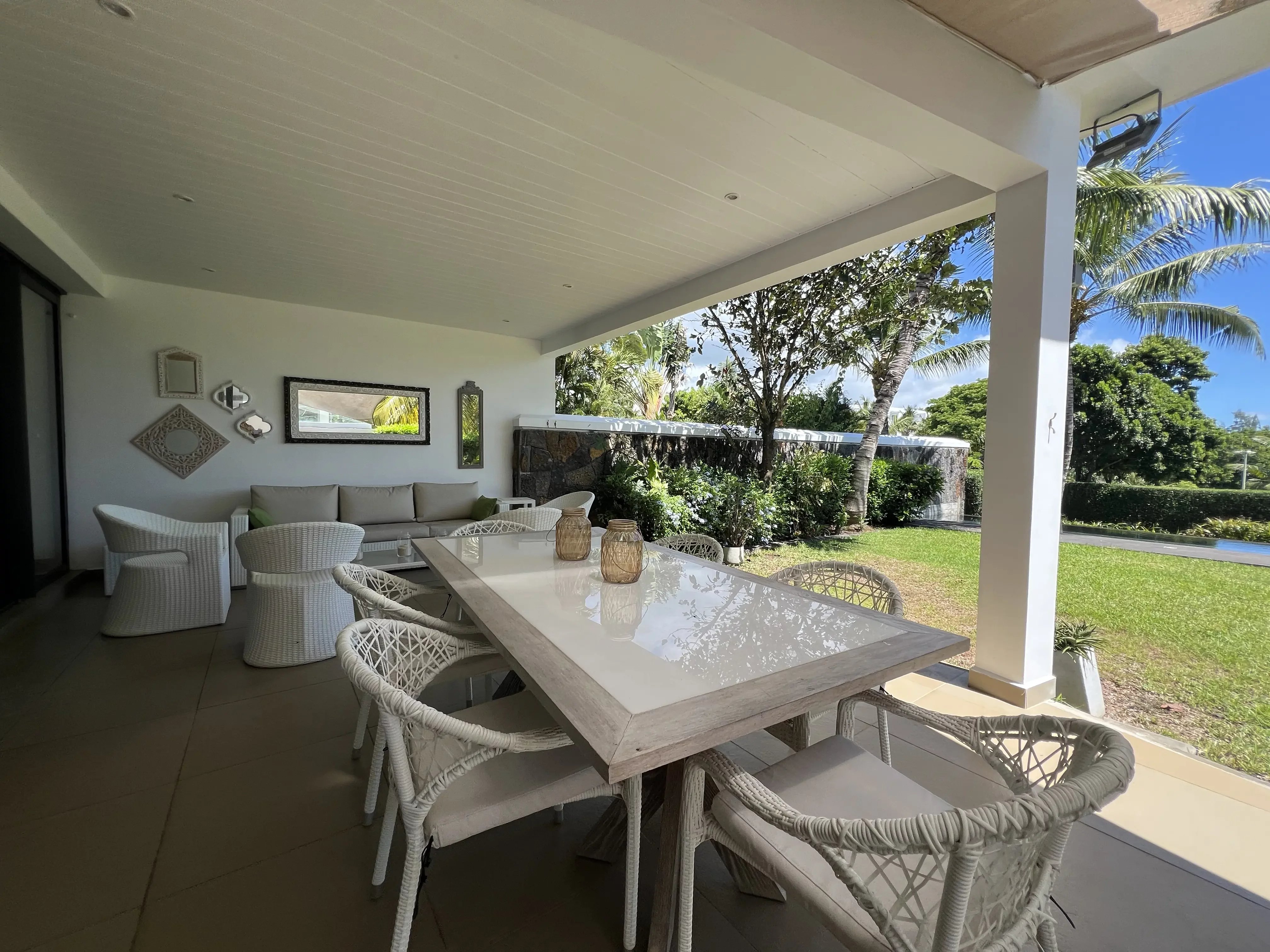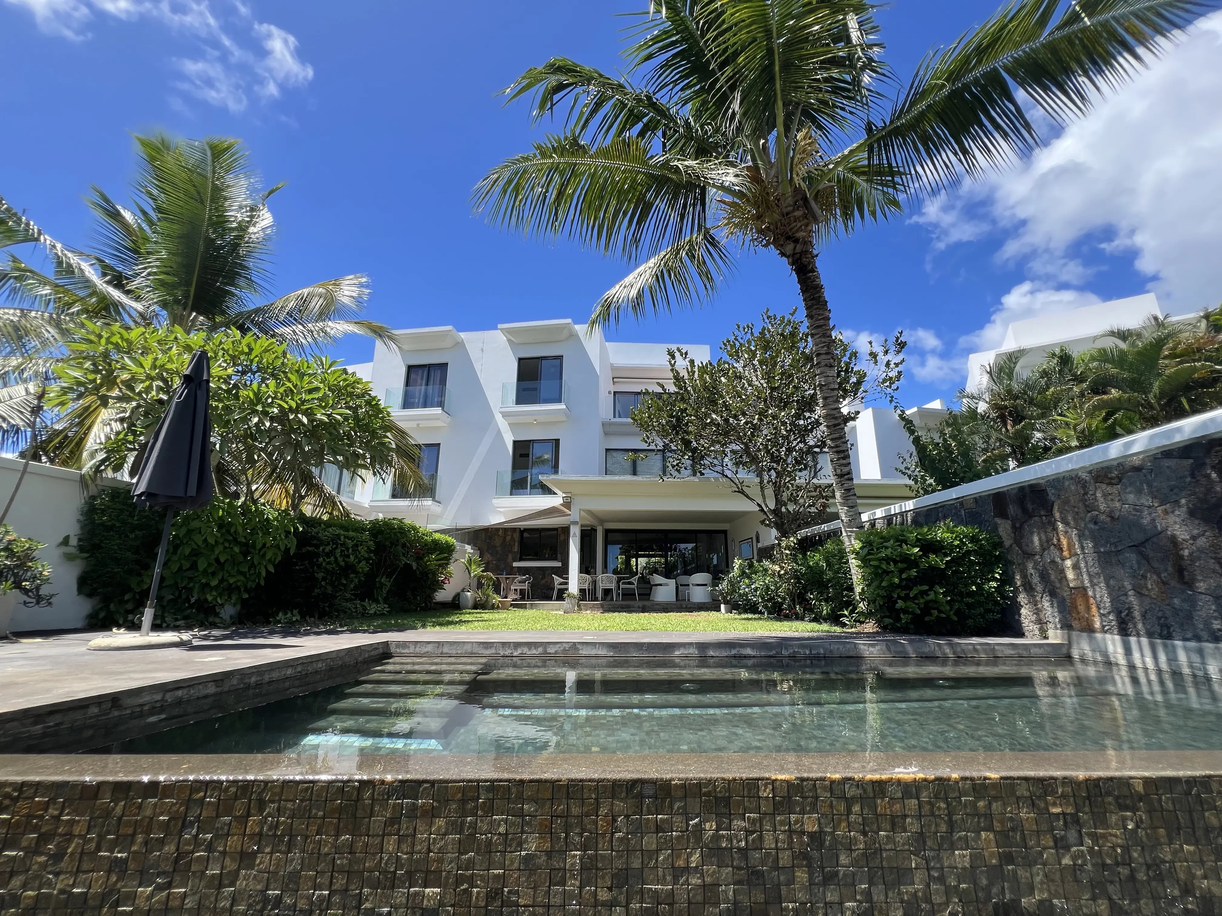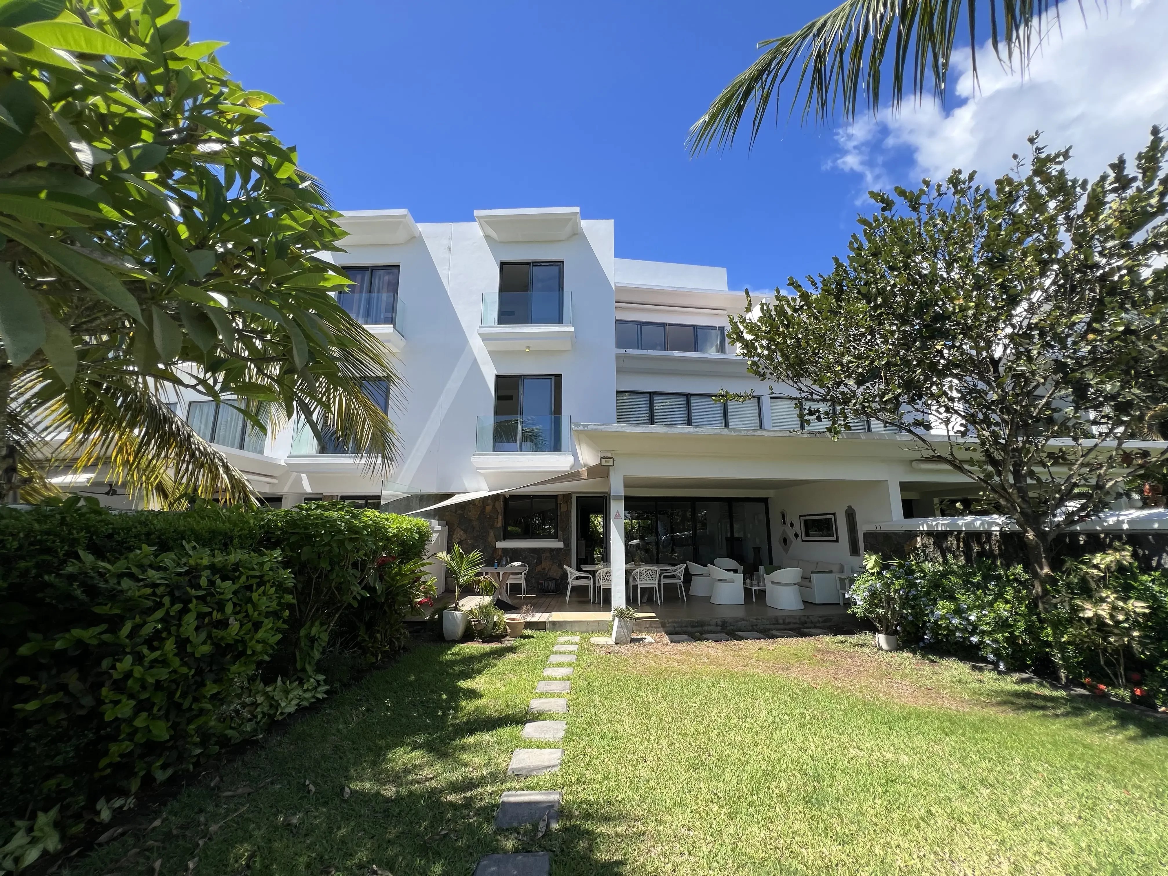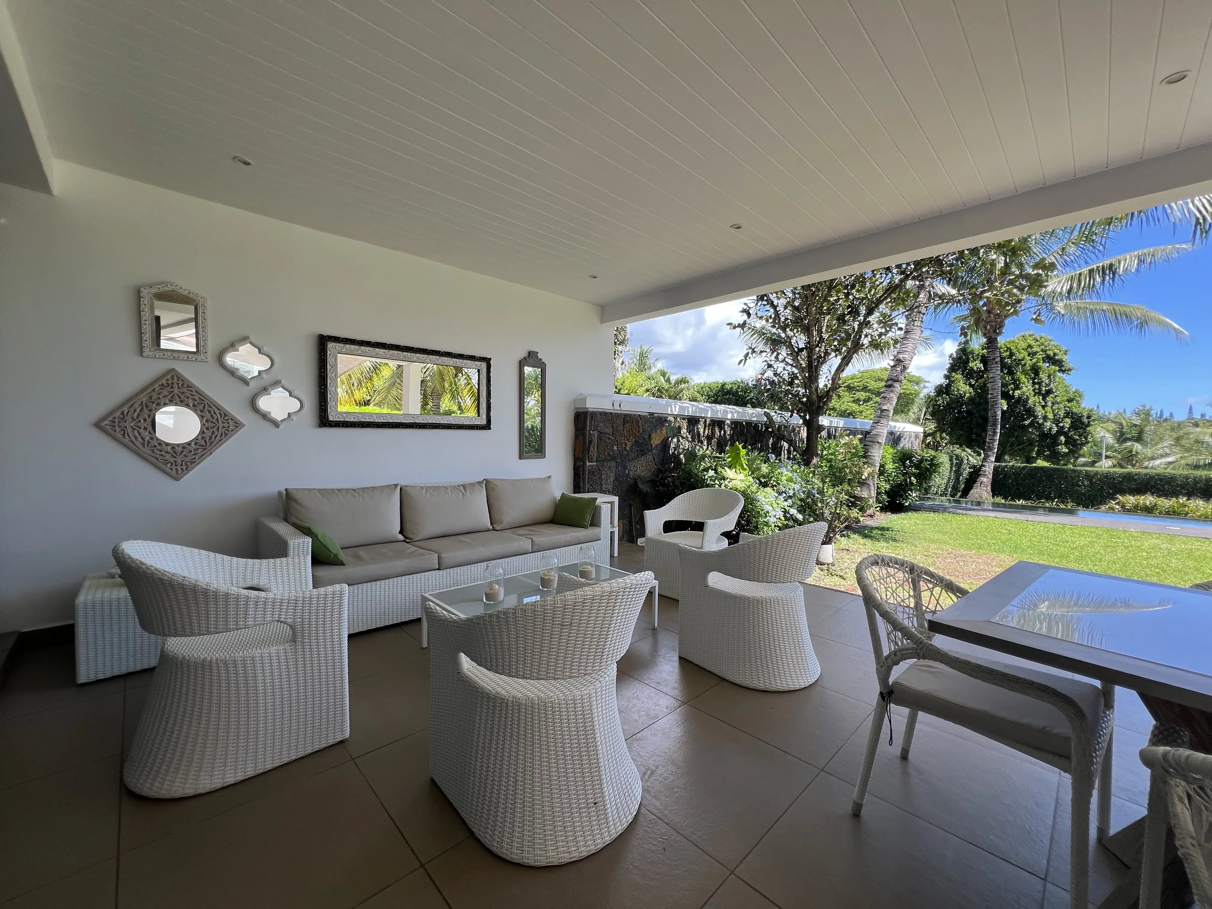 This stunning 328 m² villa offers total privacy, with no street or garden-facing views and no passing traffic nearby. Exceptionally bright and well-ventilated due to cross-ventilation and large windows, it boasts spectacular sunsets from the pool deck. The spacious living areas, large balconies, and generous covered terrace enable year-round outdoor living, sheltered from rain and wind. The villa features a cathedral-style living room, a modern open-plan kitchen with a dining area, four en-suite bedrooms including a luxurious master suite with panoramic terraces, and a carport with storage space. The beautifully landscaped garden and the large, inviting pool create an ideal setting for relaxation and entertaining. Ideally located within walking distance of the Azuri village center—shops, restaurants, and beach—this property combines high-end finishes, comfort, and convenience. Recently renovated, the villa includes roof waterproofing with a 10-year guarantee, a new solar water heater, and modern air conditioning units, making it move-in ready and perfectly maintained.