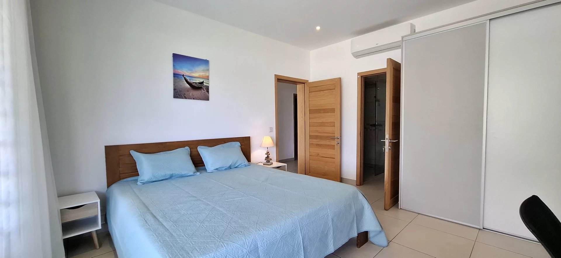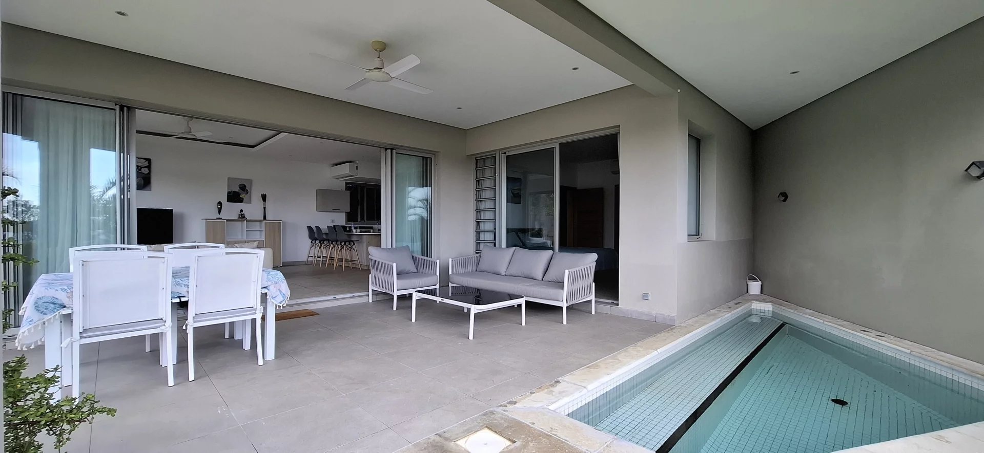 This exceptional property features three spacious bedrooms, two elegant bathrooms, and a beautifully designed open-plan living area. The fully equipped kitchen and lounge seamlessly extend onto a charming terrace with a private swimming pool, perfect for enjoying Mauritius’ warm and gentle climate.