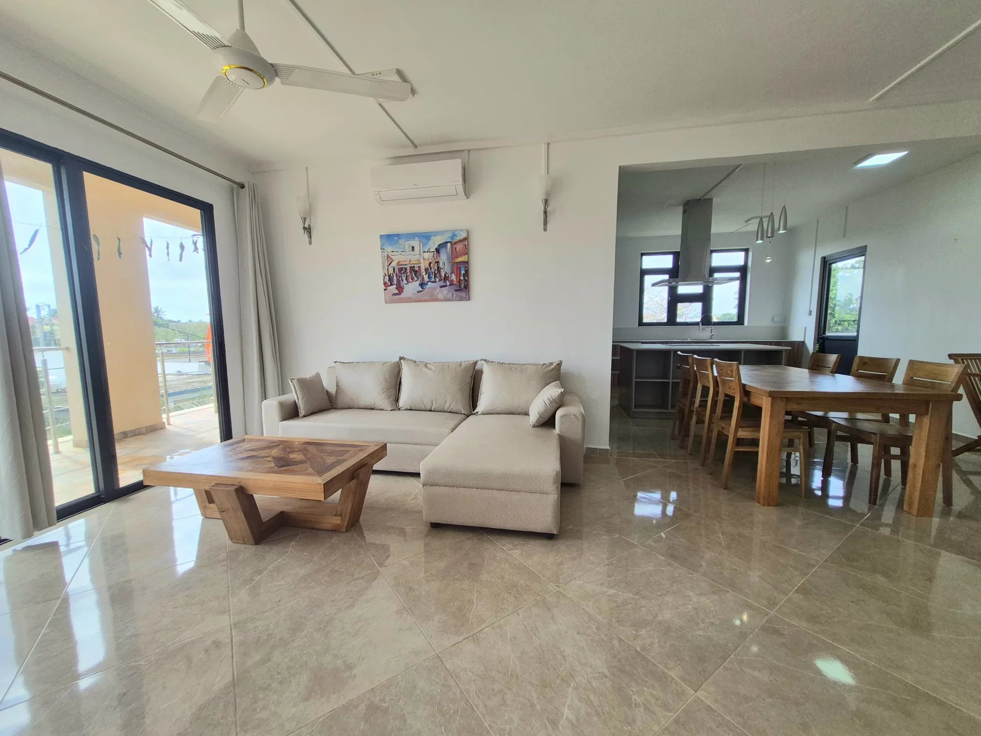 The apartment boasts a bright, open-plan kitchen, lounge, and dining area, all air-conditioned for year-round comfort, with a seamless transition to a private terrace—ideal for relaxation or entertaining.