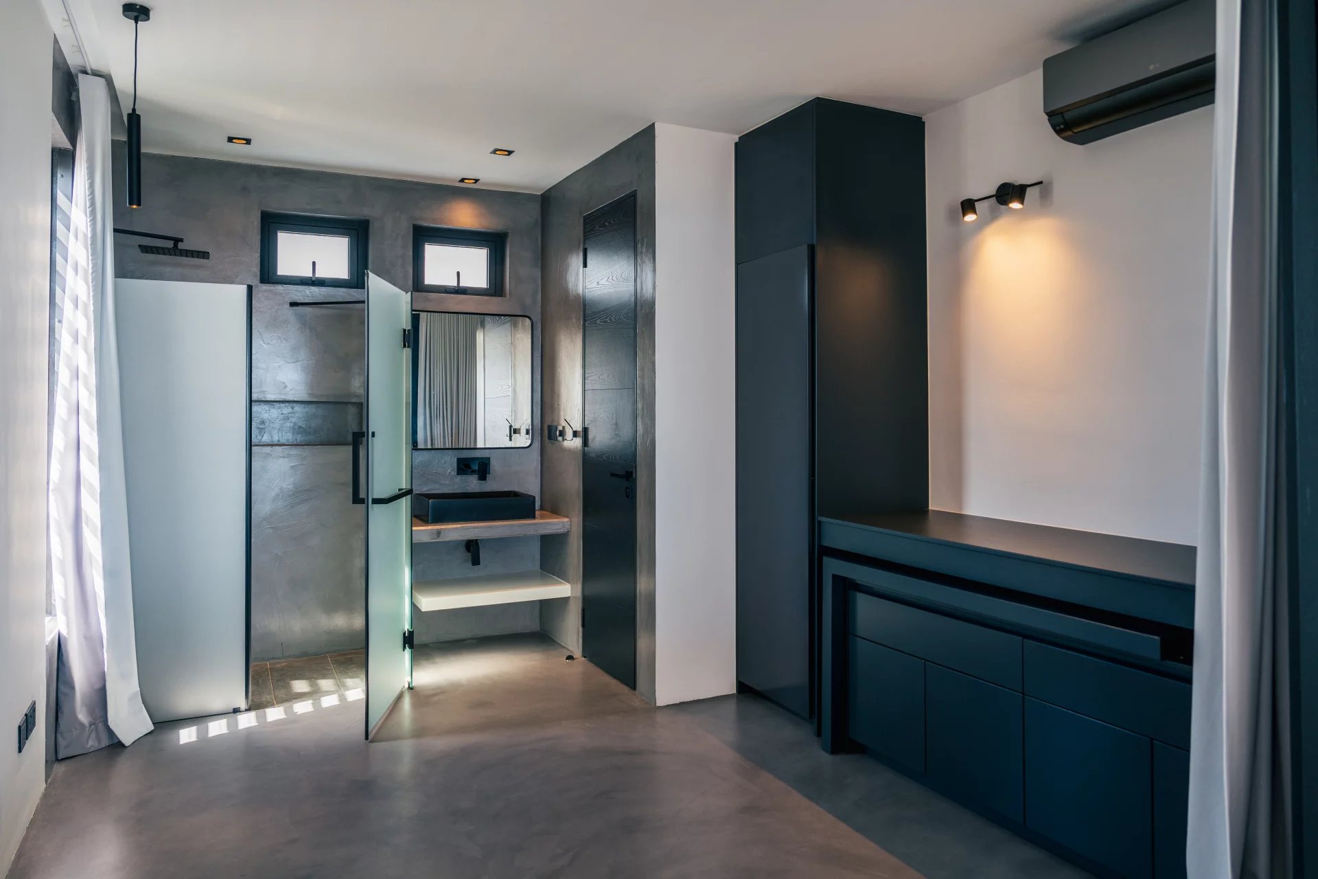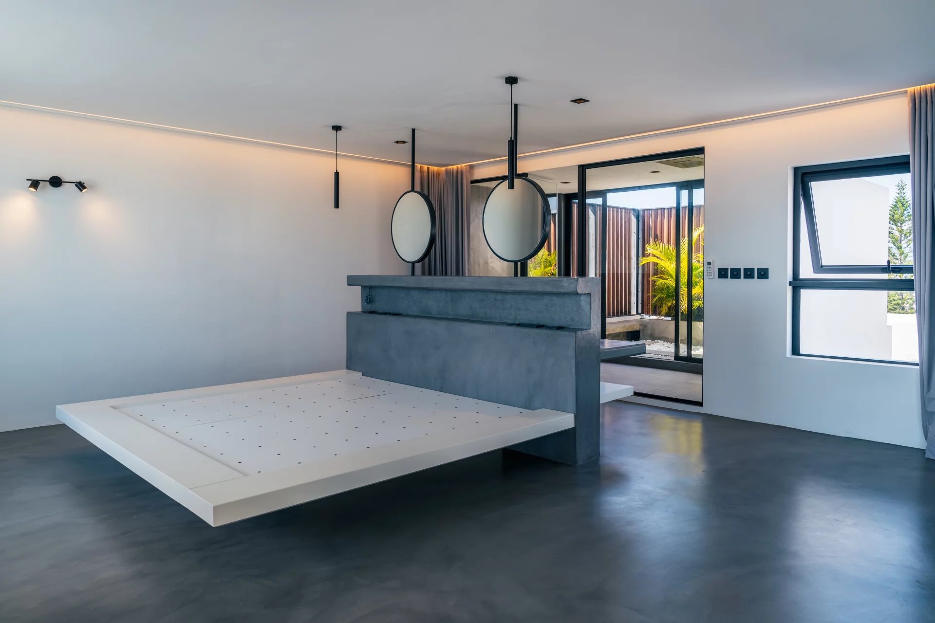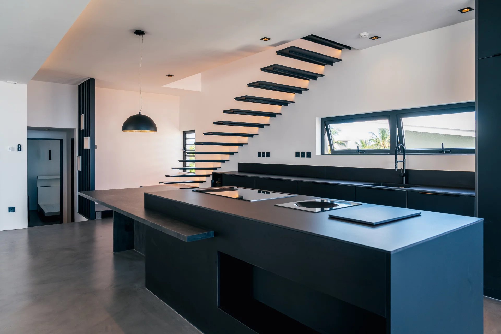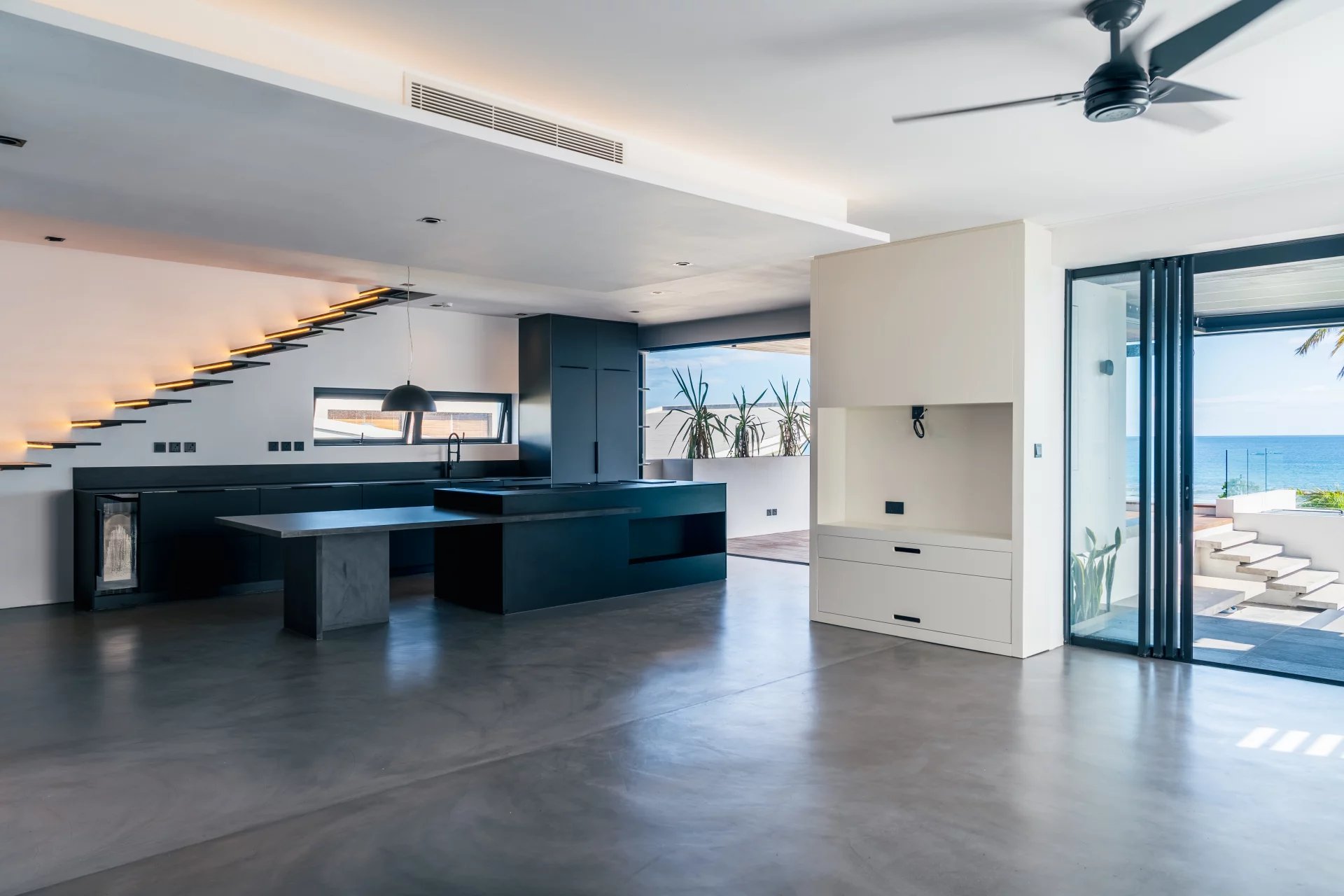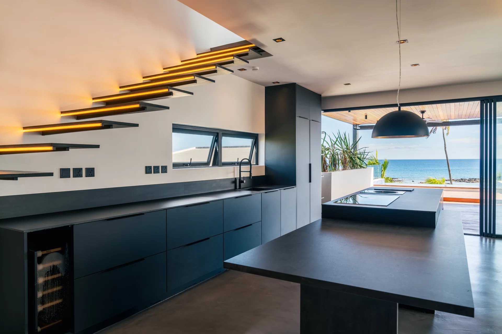 Inside, the sleek open-plan kitchen is fitted with premium German appliances, including an induction WOK. Two bedrooms are located on this main level, one of which can serve as a home office with a sea view. A floating staircase leads to the master suite, which boasts panoramic views of the sea and mountains, along with both indoor and outdoor showers and an Art Deco-inspired wardrobe.