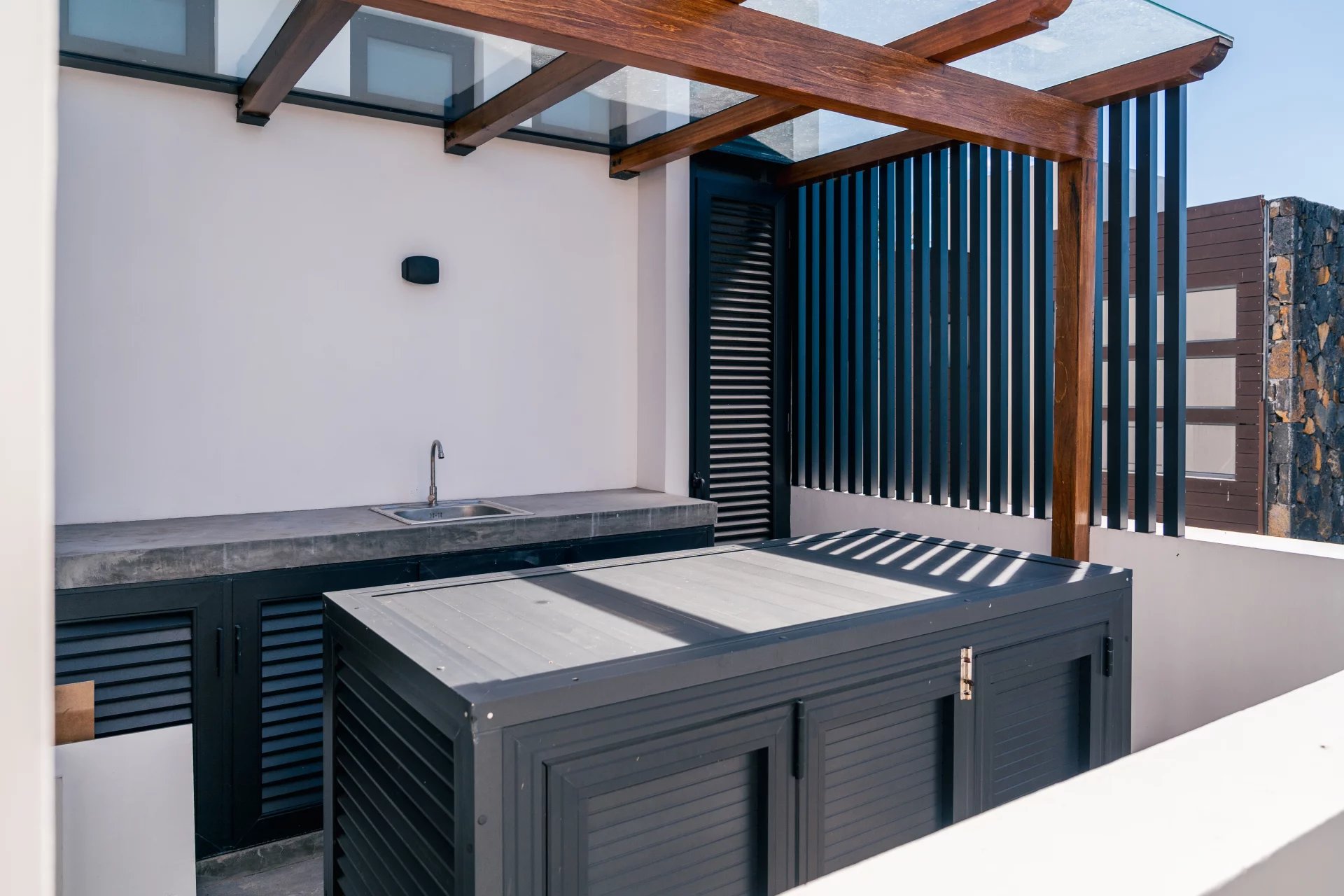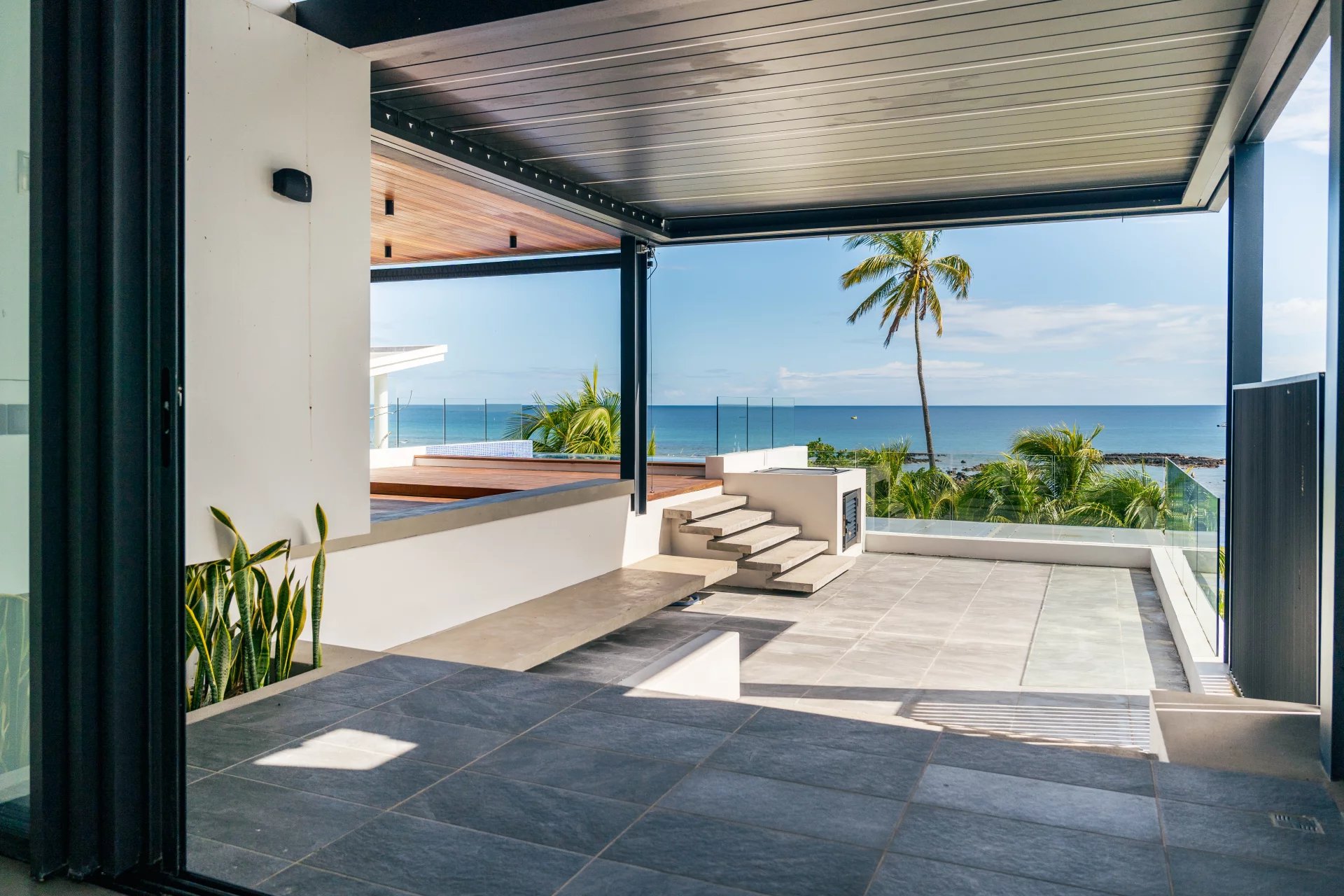 The expansive terrace features a bioclimatic roof that adjusts to the elements, as well as a covered lounge and dining space—perfect for enjoying the exceptional outdoor setting.