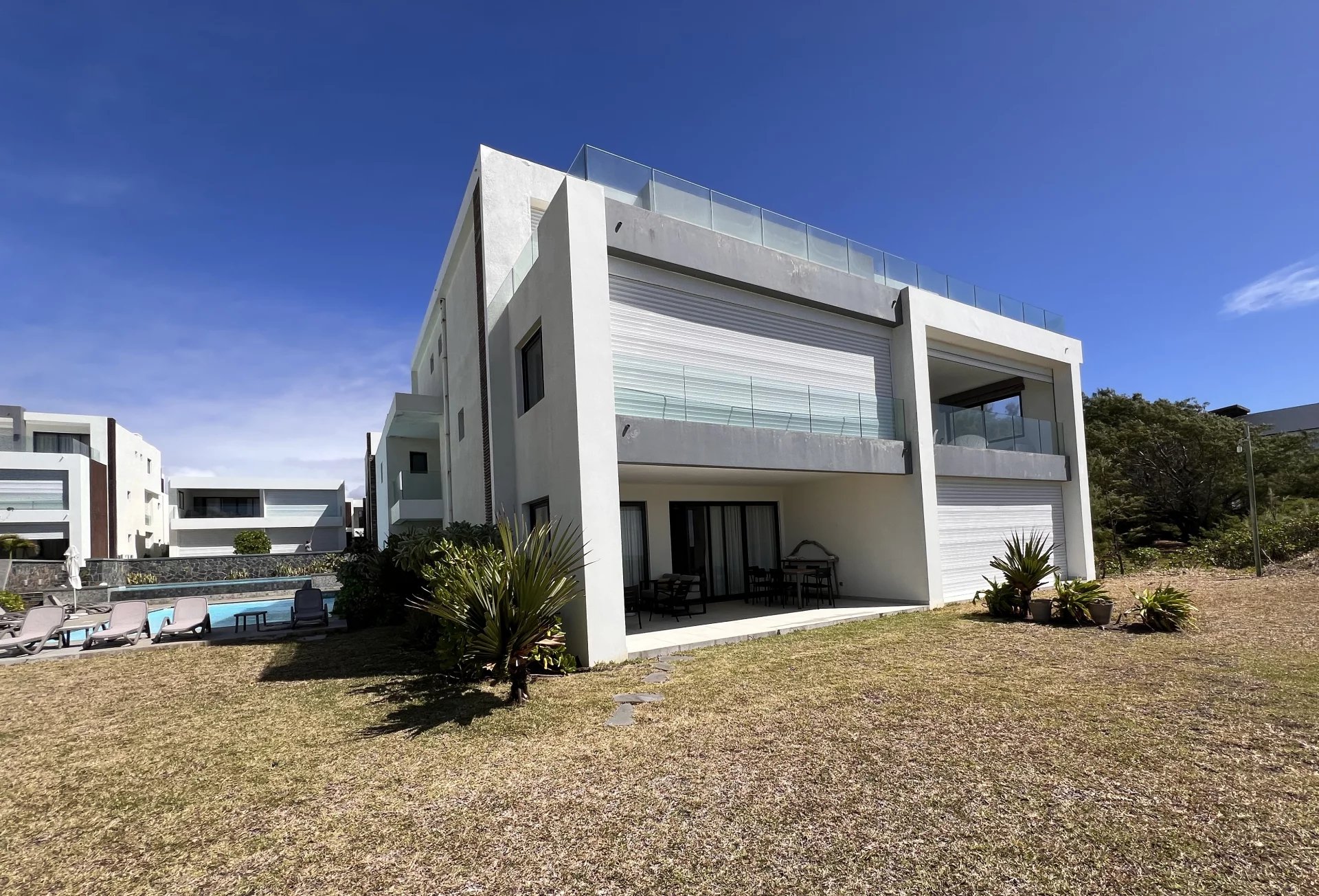 The residence offers two beautiful communal swimming pools, lined with sun loungers, perfect for relaxing under the Mauritian sun. Private parking and storage facilities are also available.