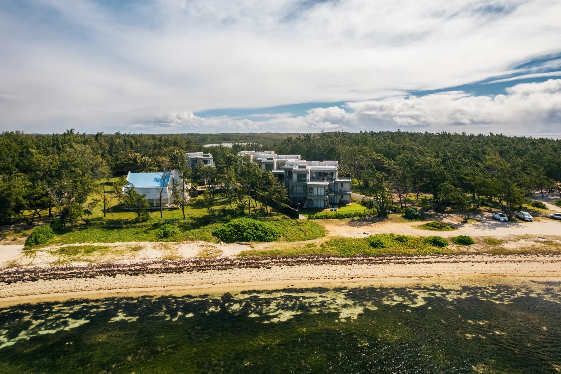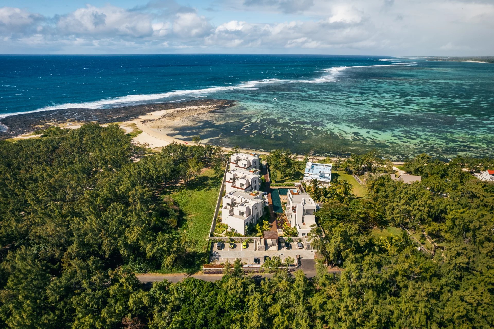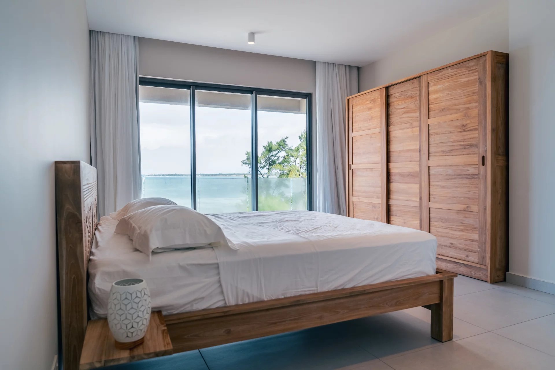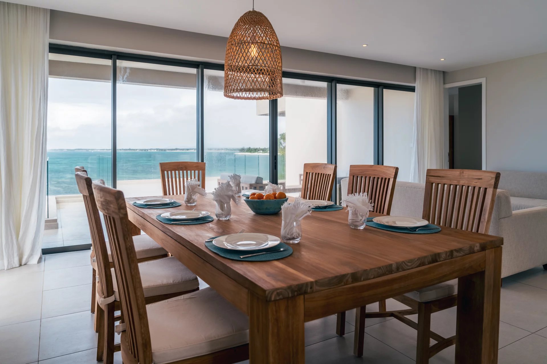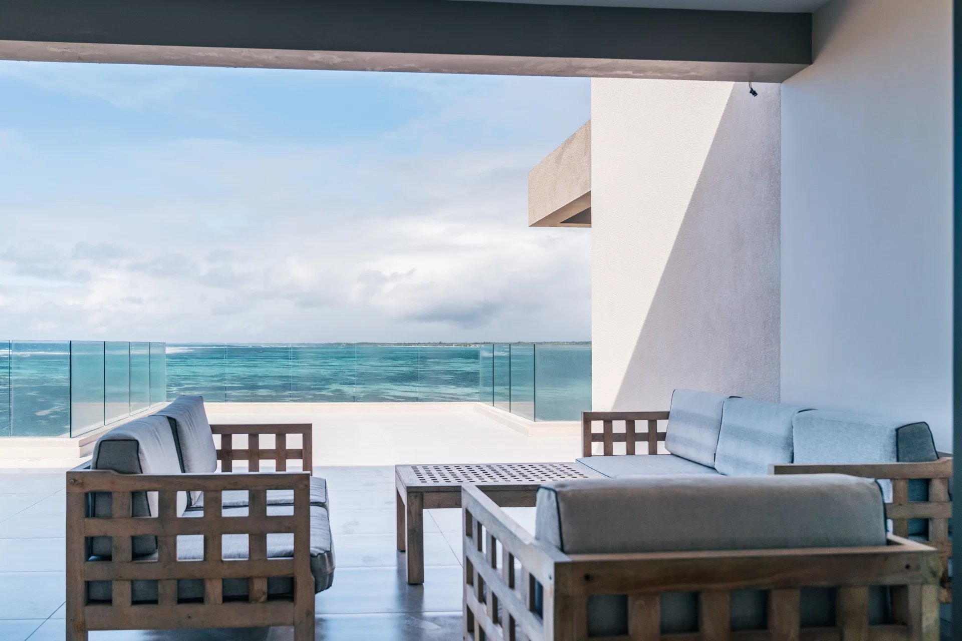 The open-concept living area is perfect for both relaxation and entertaining, with a modern kitchen featuring top-tier appliances, sleek countertops, and custom cabinetry. The spacious living room flows seamlessly onto a private terrace, ideal for soaking in sunrise and enjoying outdoor dining with the sound of the waves in the background.