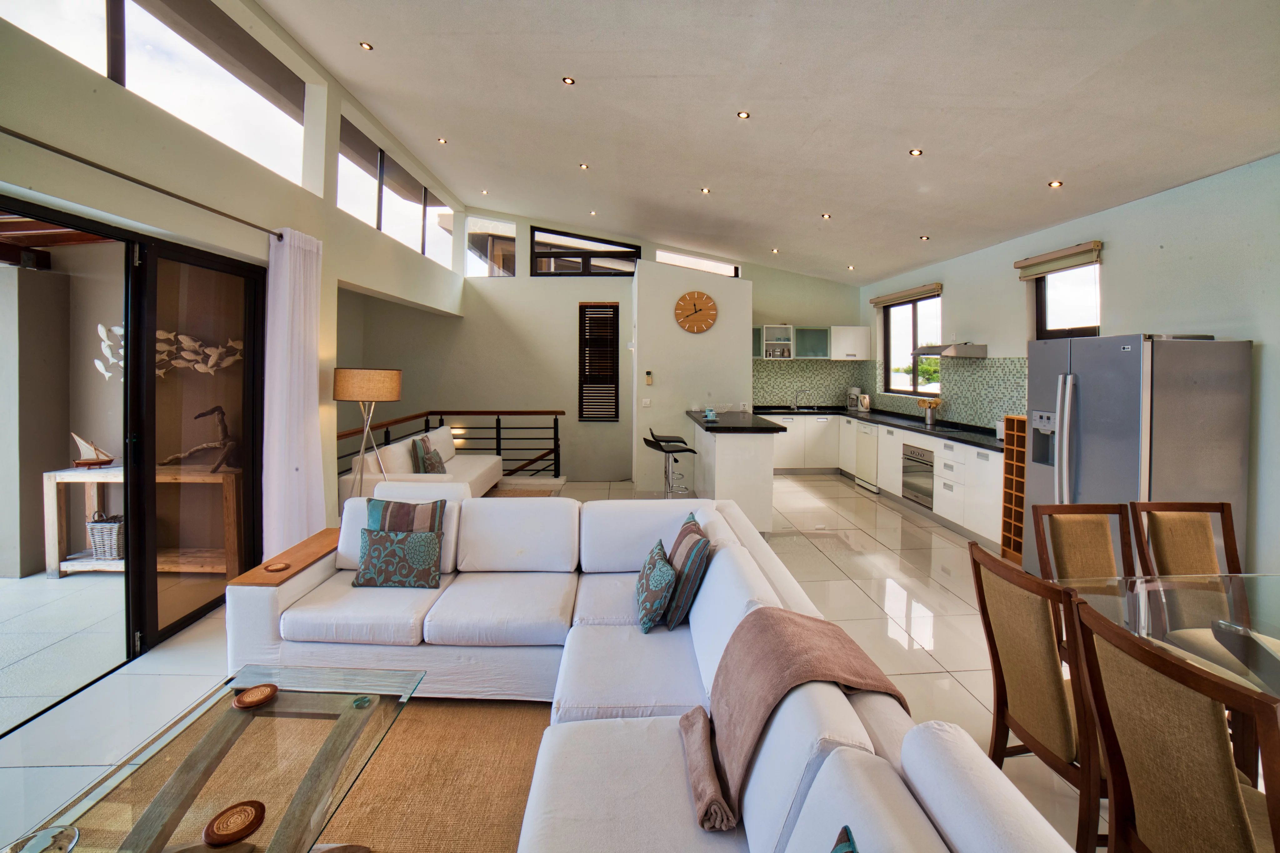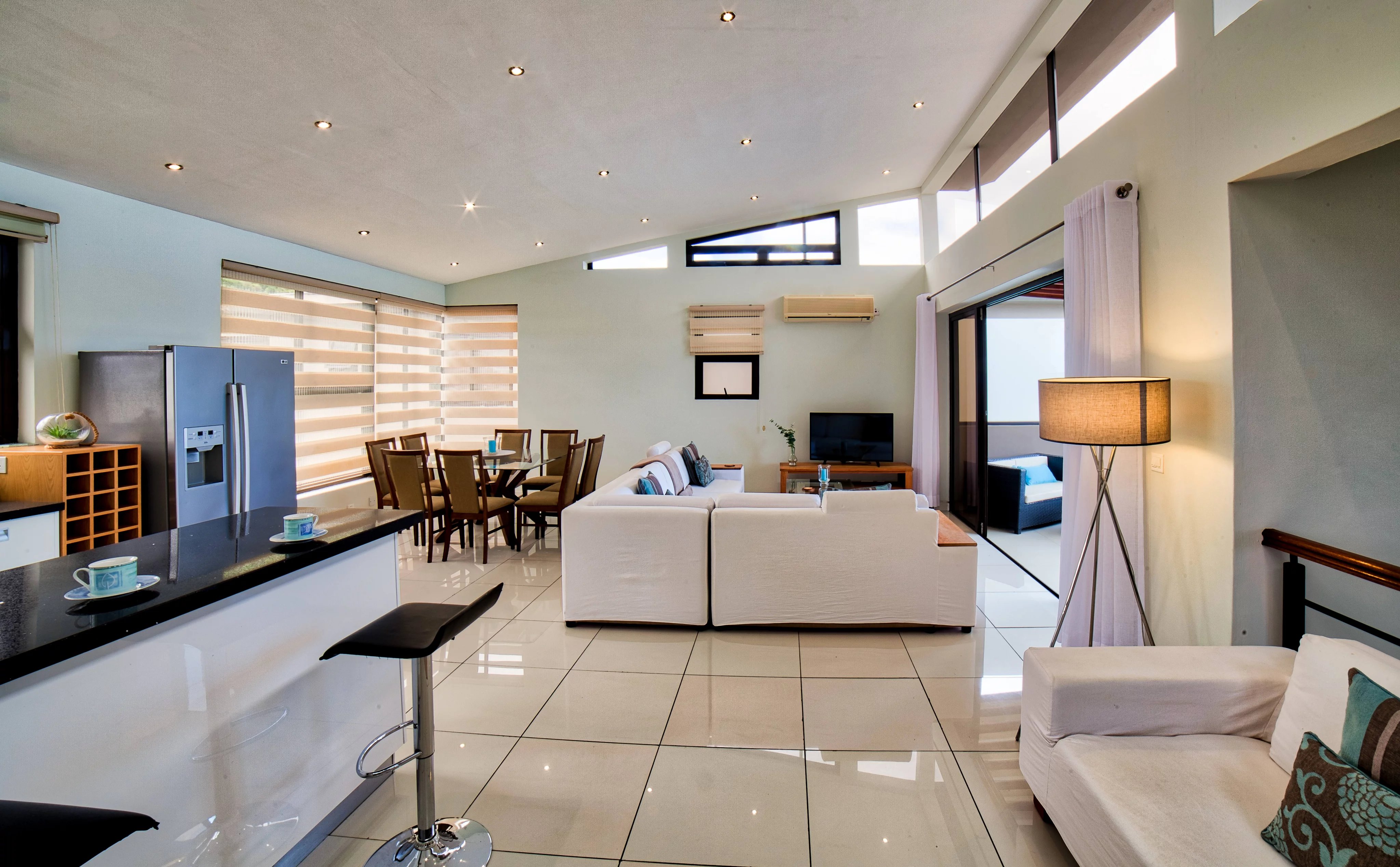All the bedrooms are on the lower level, while the upper floor comprises the living areas, including the kitchen, dining room, lounge and terrace.