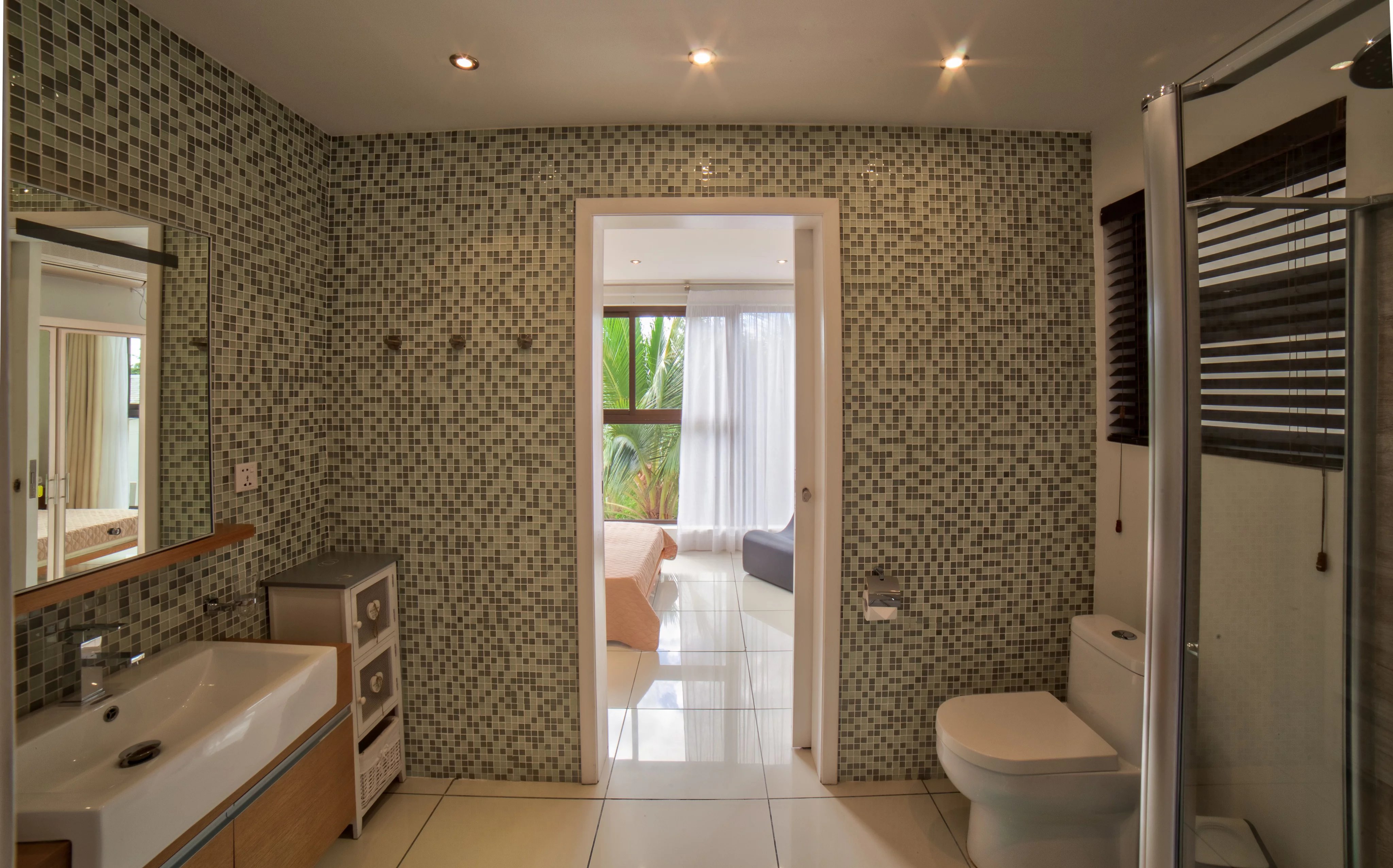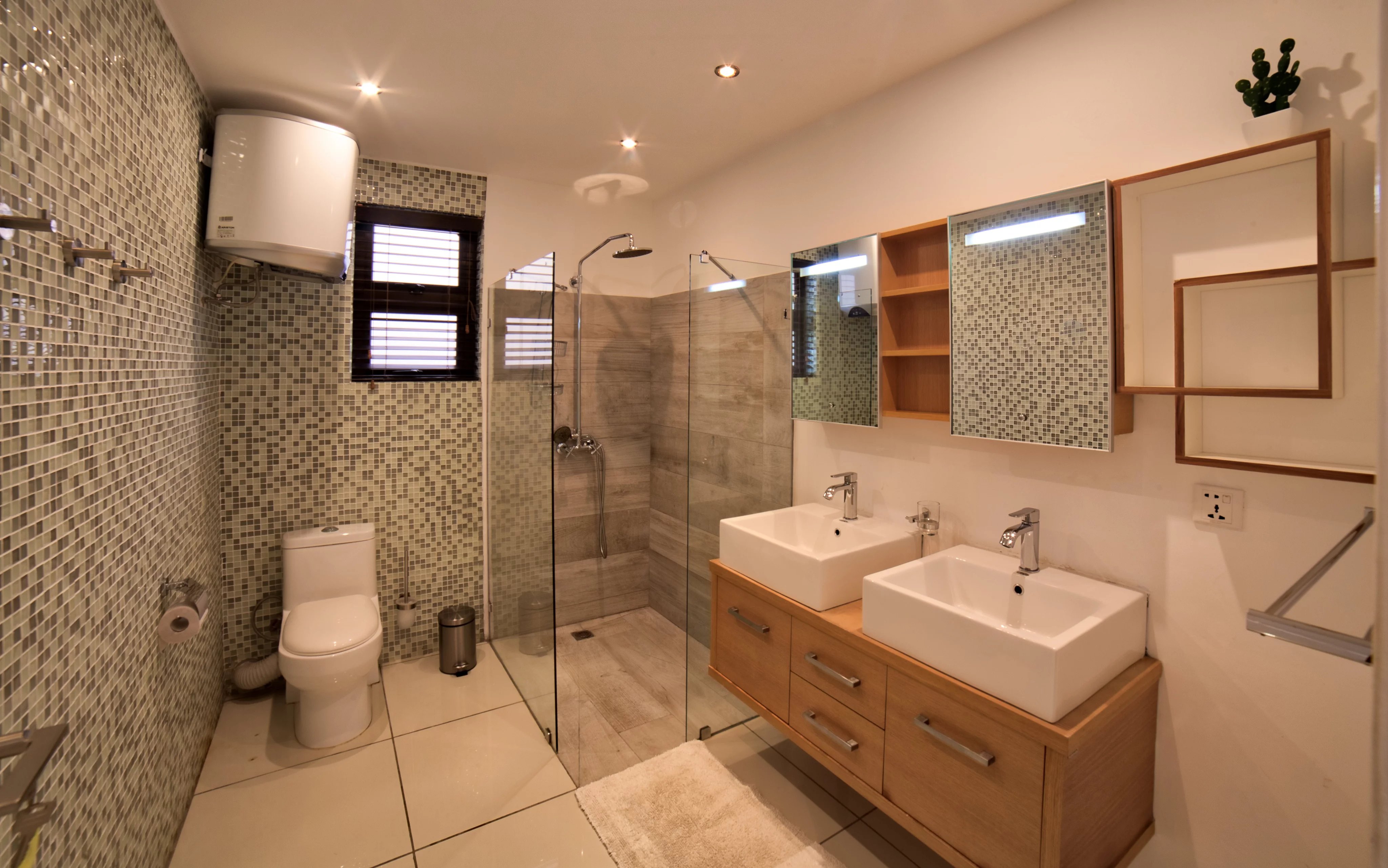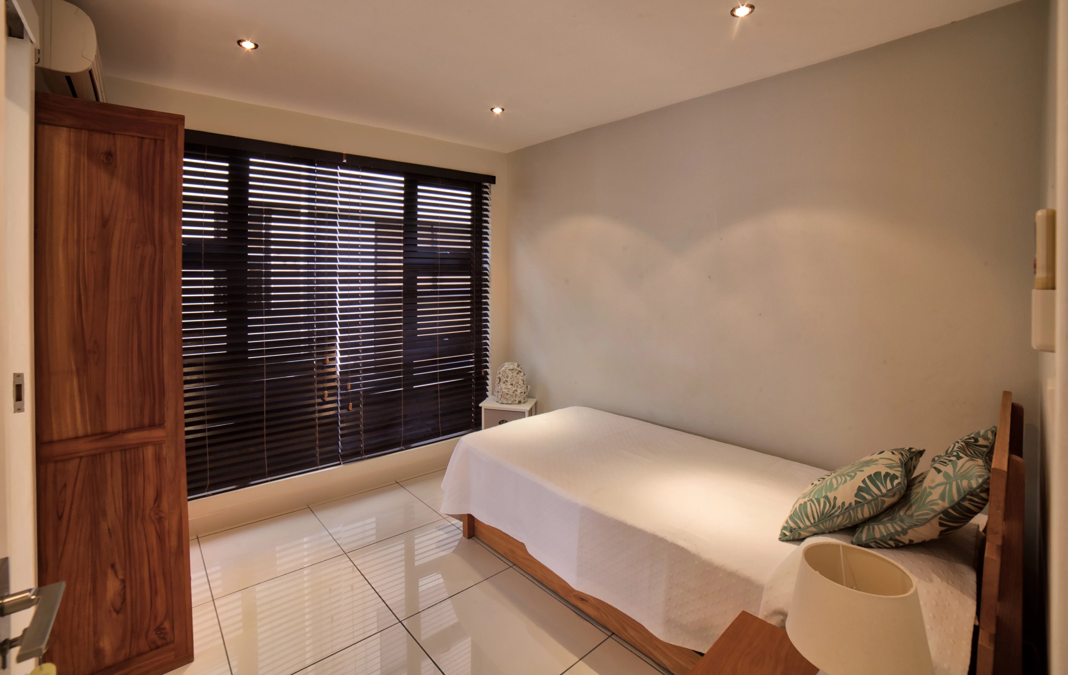 On the lower level, an entrance hall can be used as an office, followed by a second hallway with a staircase leading to the bedrooms. The master bedroom has an en-suite bathroom, the other two bedrooms share a bathroom between them, while a fourth bedroom has its own private bathroom with toilet.